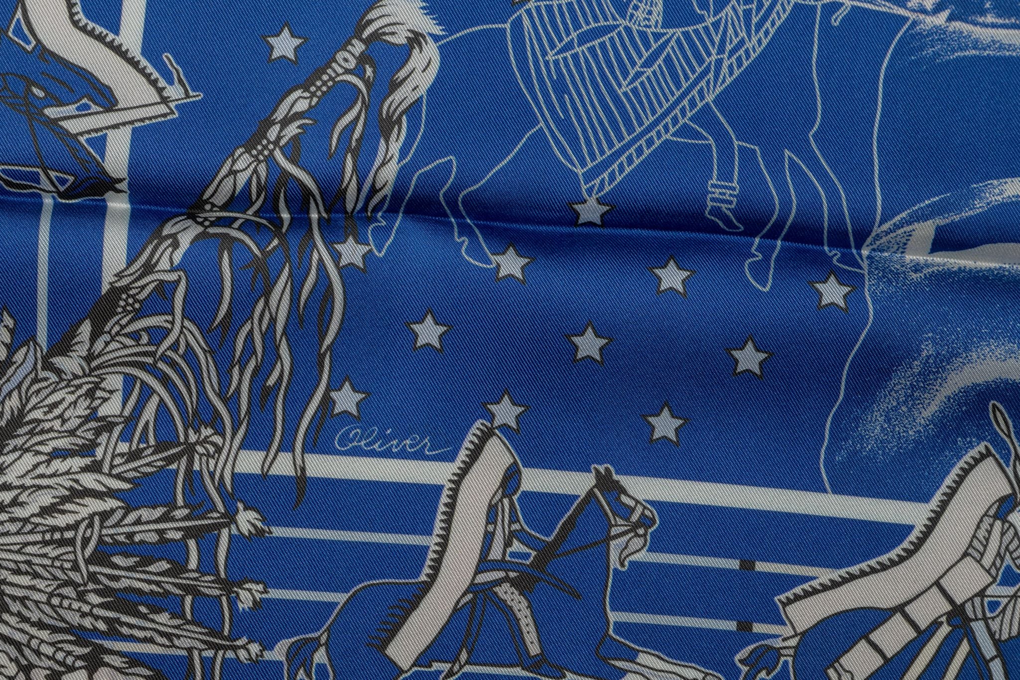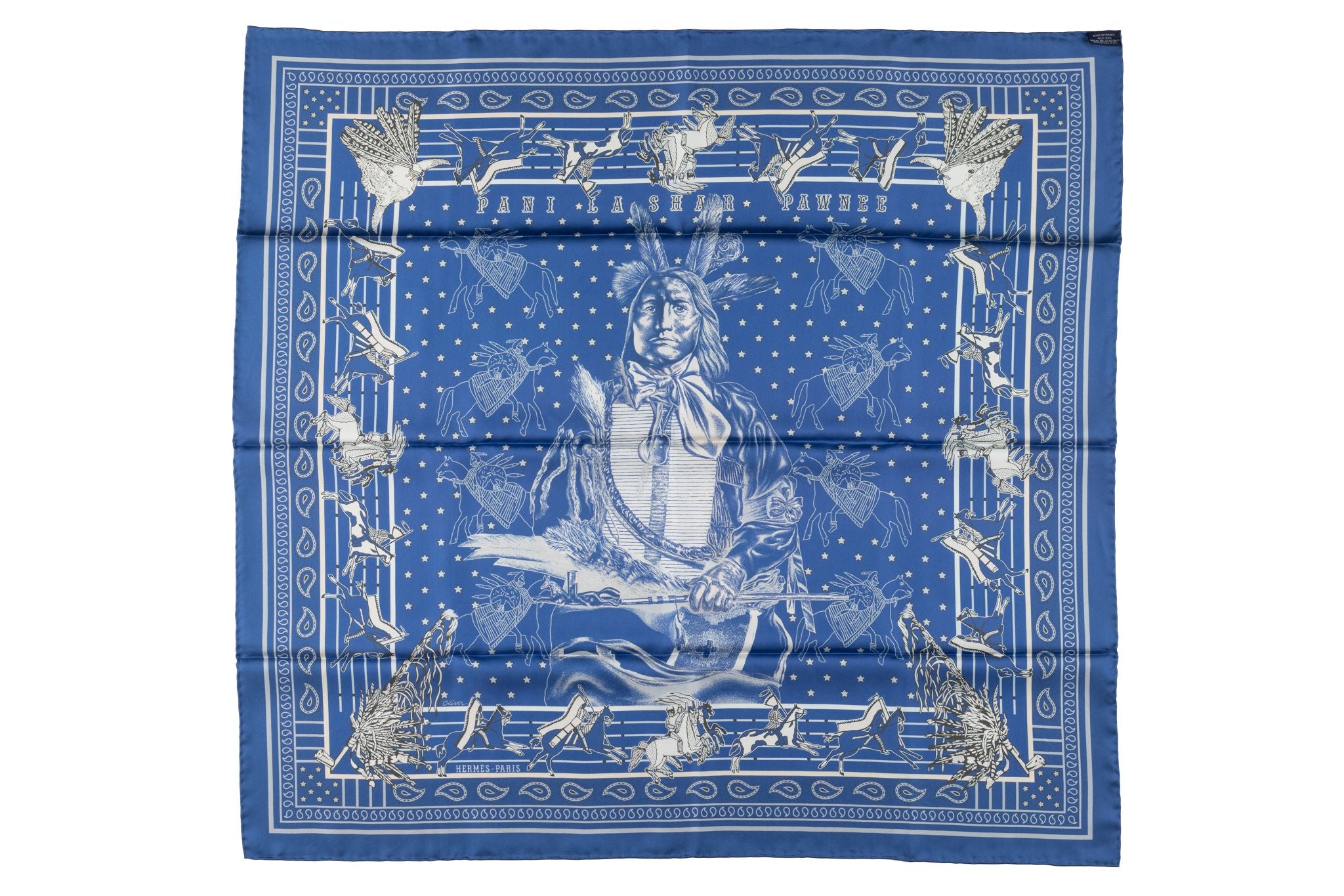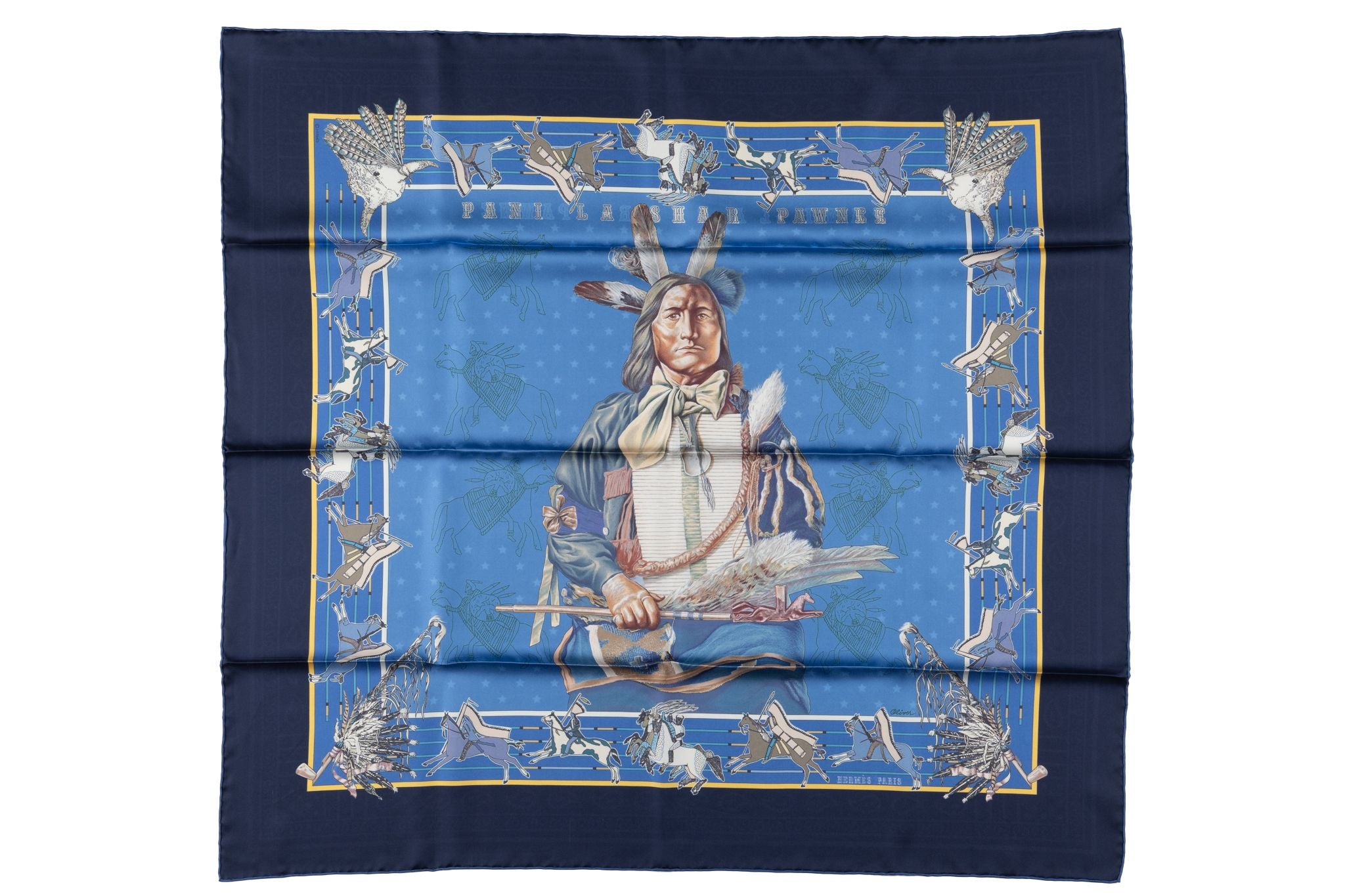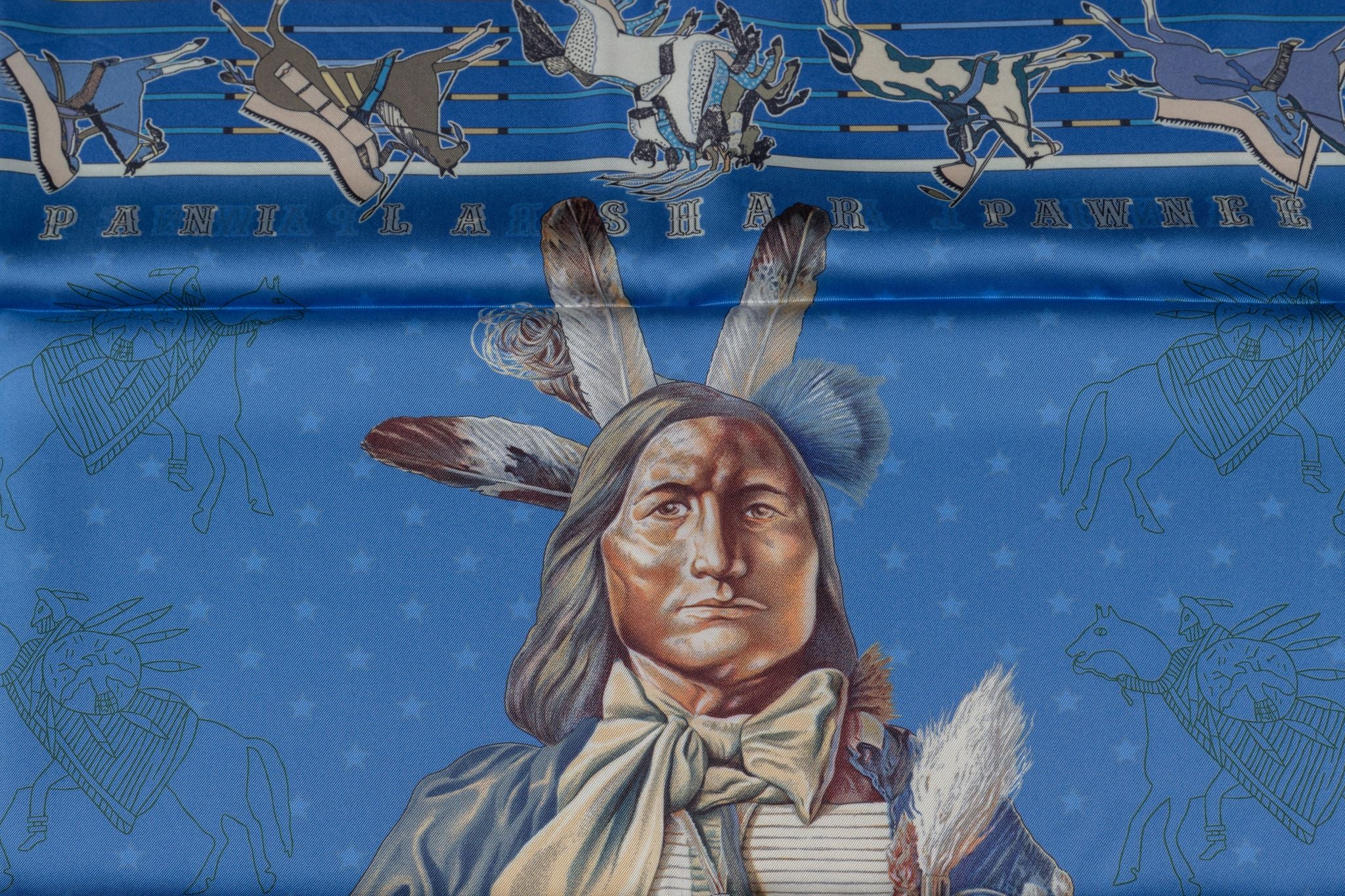 Hermès "Pani la Shar Pawnee" Scarf, designed by Kermit Oliver. Bandana special edition, double face. Two expressions of the same design are featured on either side of the scarf. A scarf of many faces, the Pani La Shar is made in France, with hand-rolled edges and 100% silk. Comes with an original box and ribbon.