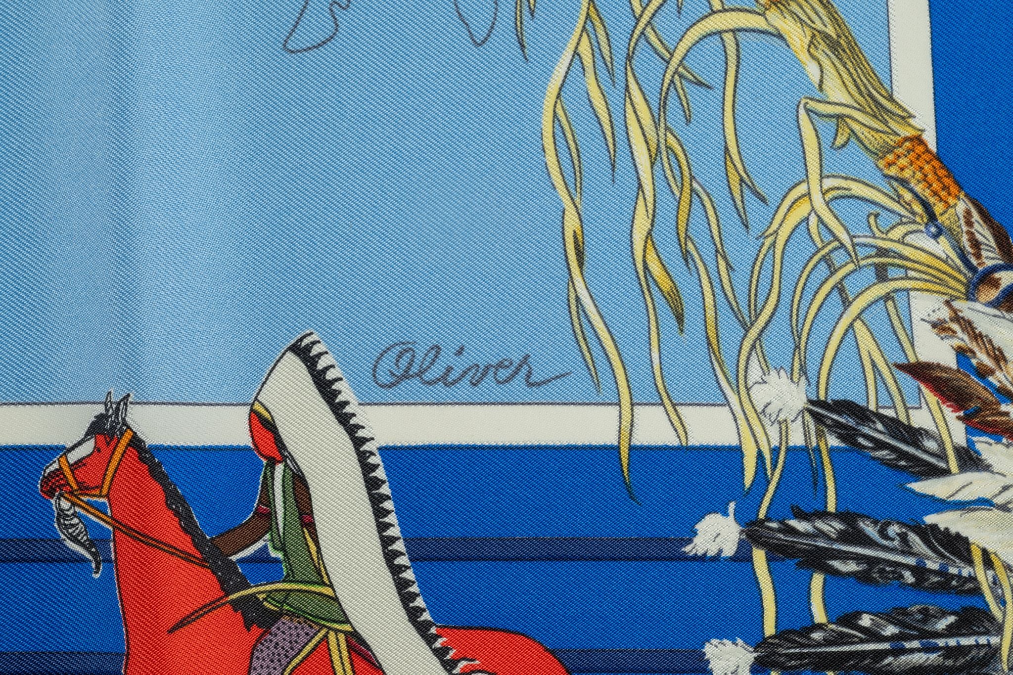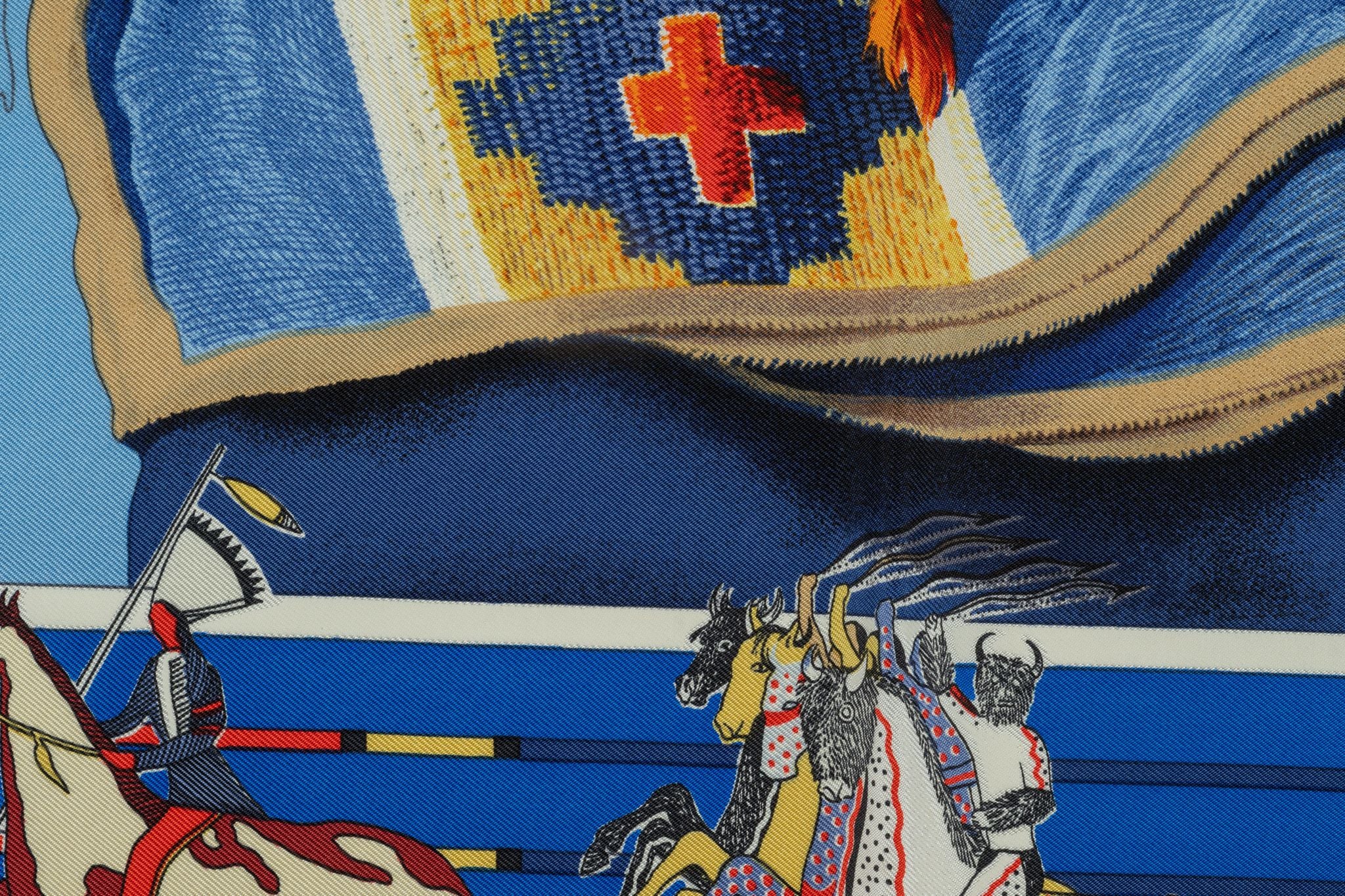 This Hermès "Pani La Shar Pawnee" Scarf in blue, features hand-rolled edges. Original design by Kermit Oliver depicting the Pawnee chief, native american tribe from Nebraska.