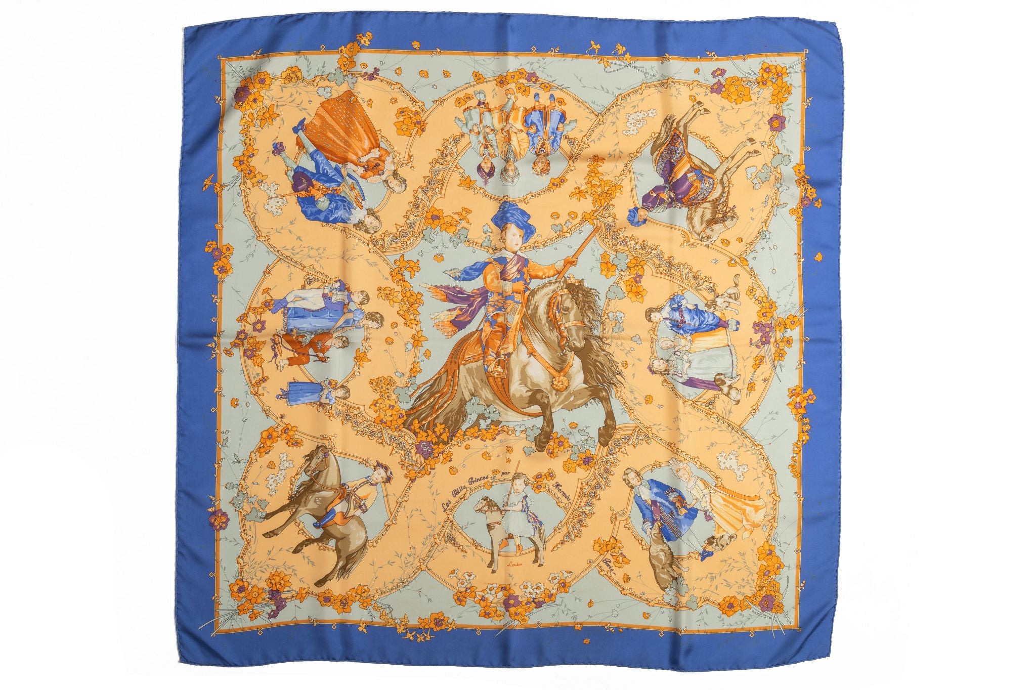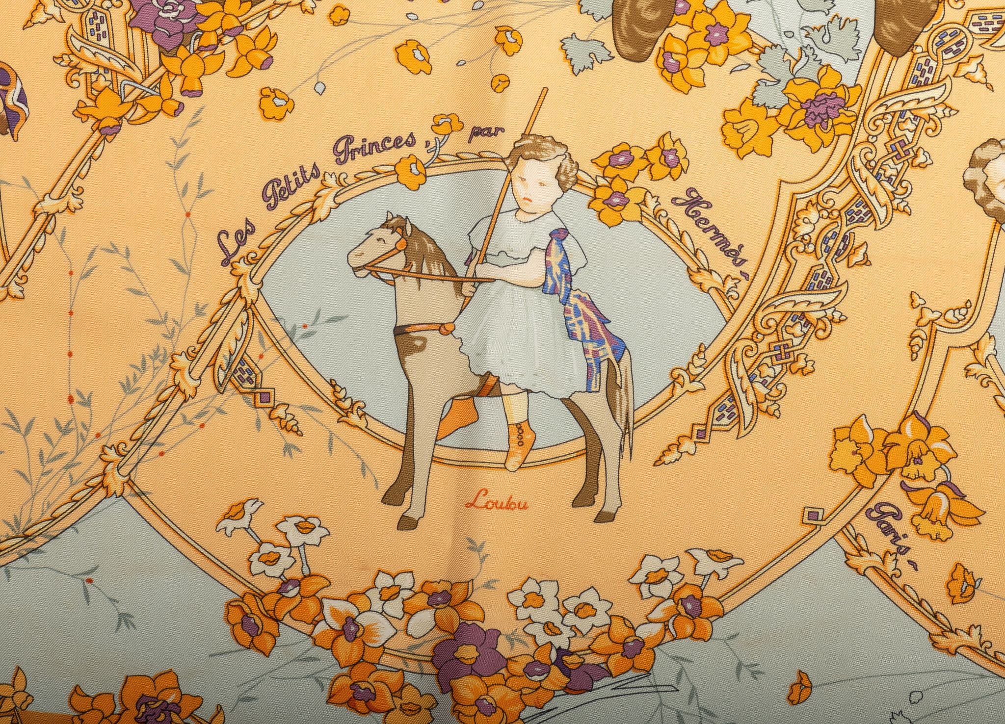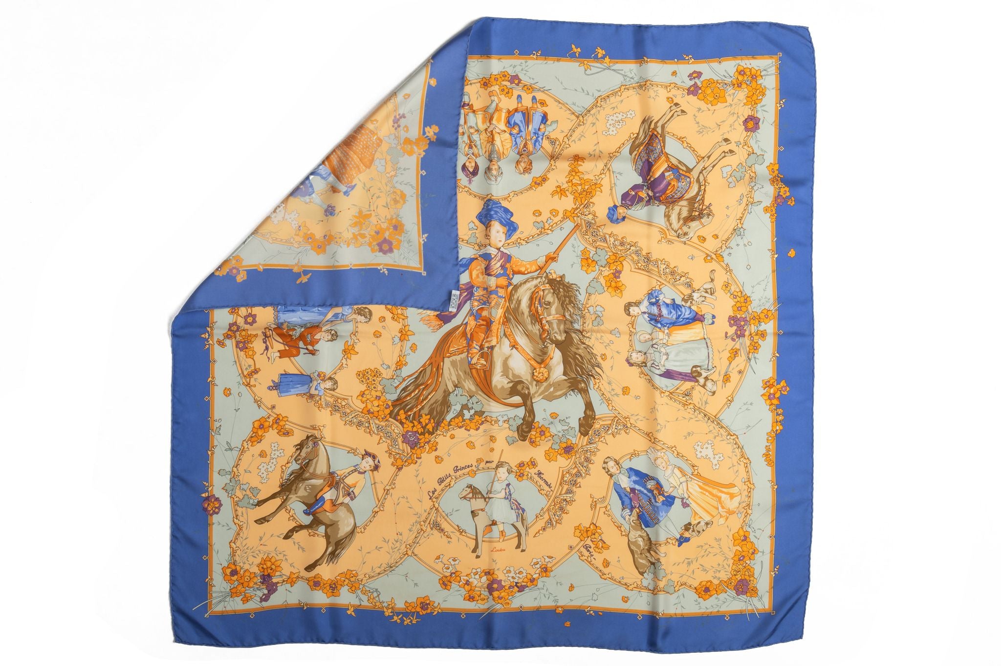 Hermès light blue and peach petit prince silk scarf. Hand rolled trim. No box.