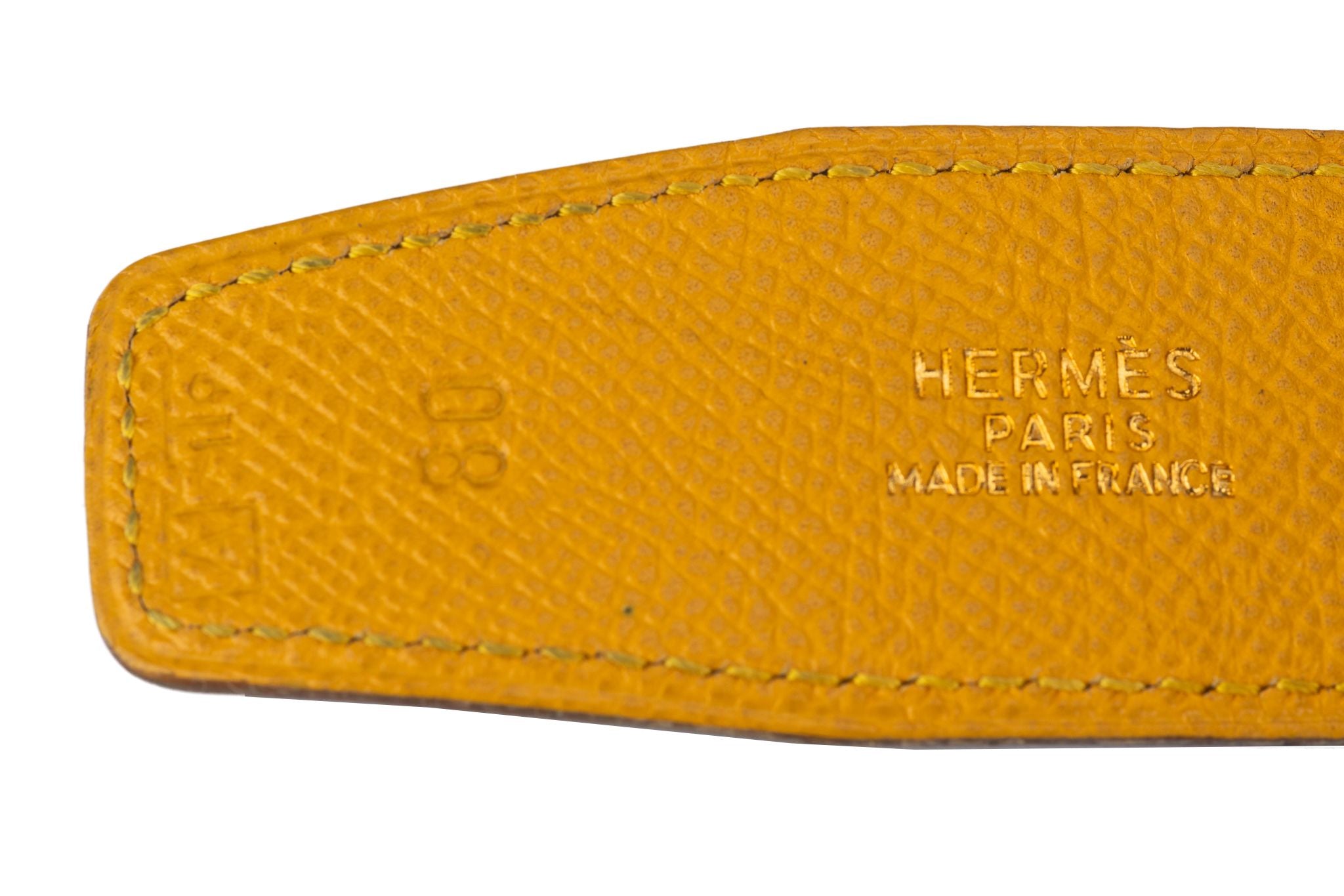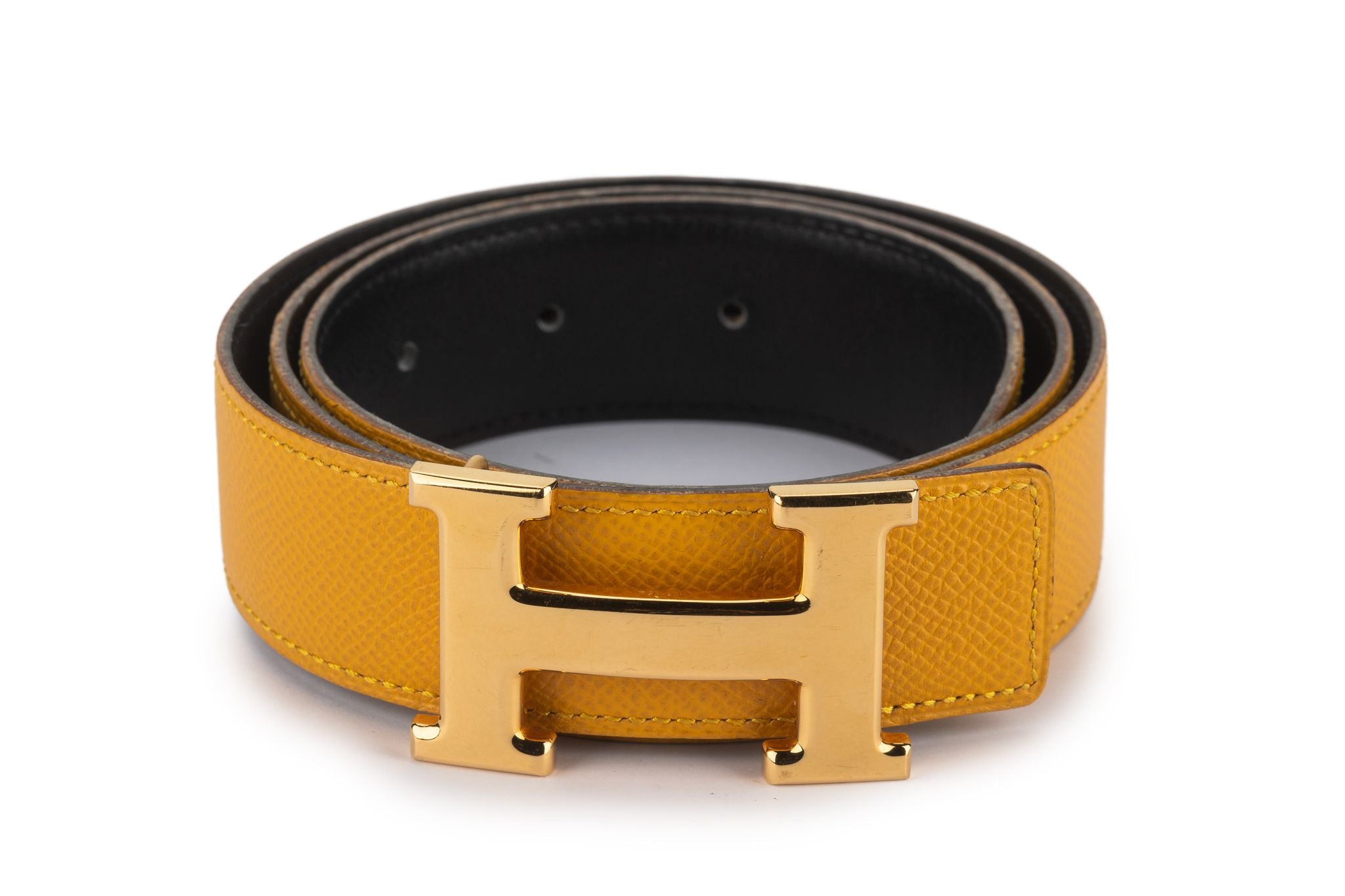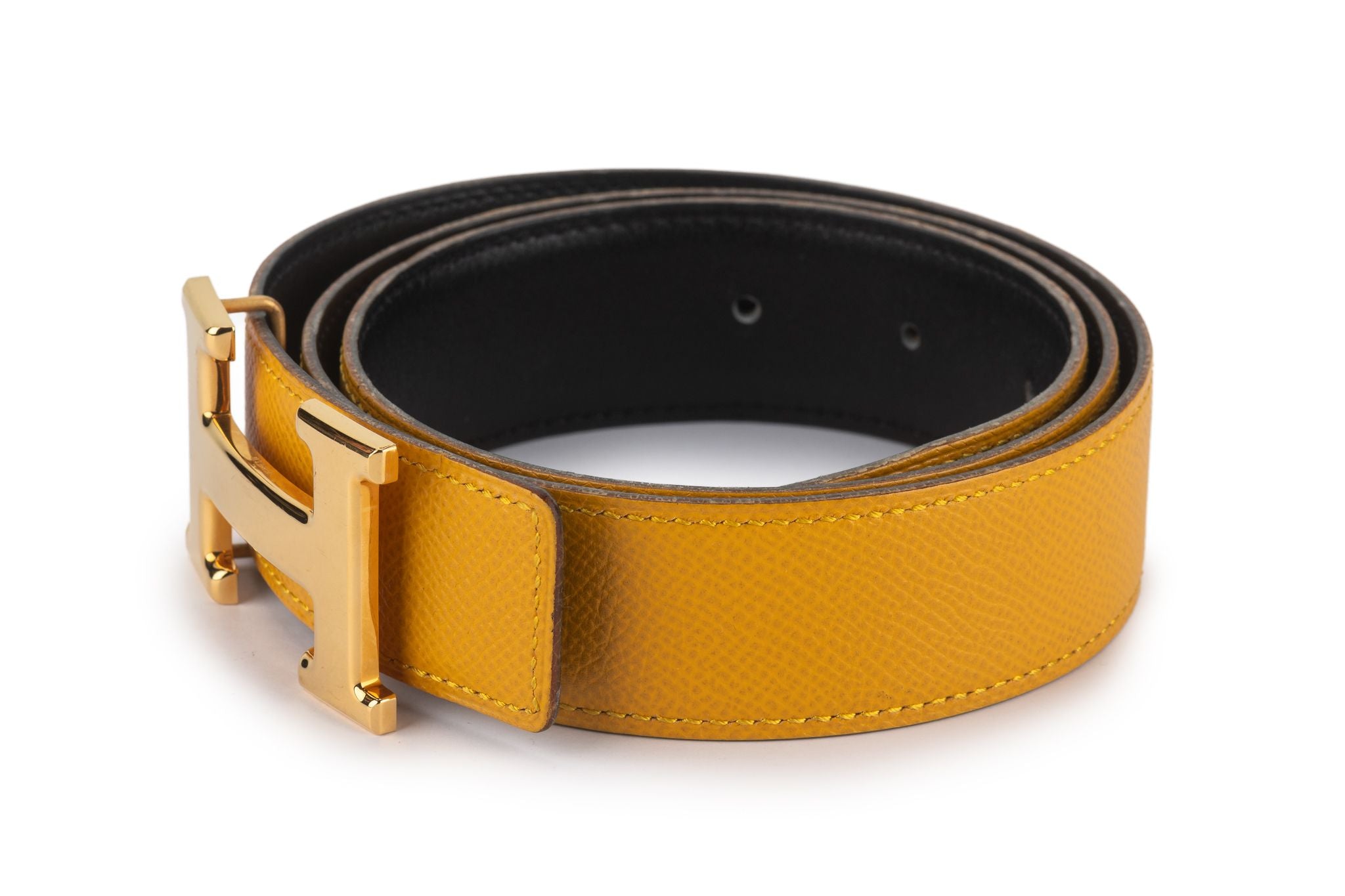 This Hermès H belt is crafted of reversible leather with one side in black and the reverse in yellow leather. The belt is completed with polished yellow gold plated Hermes H buckle. Minimal wear. Comes with original dustcover.