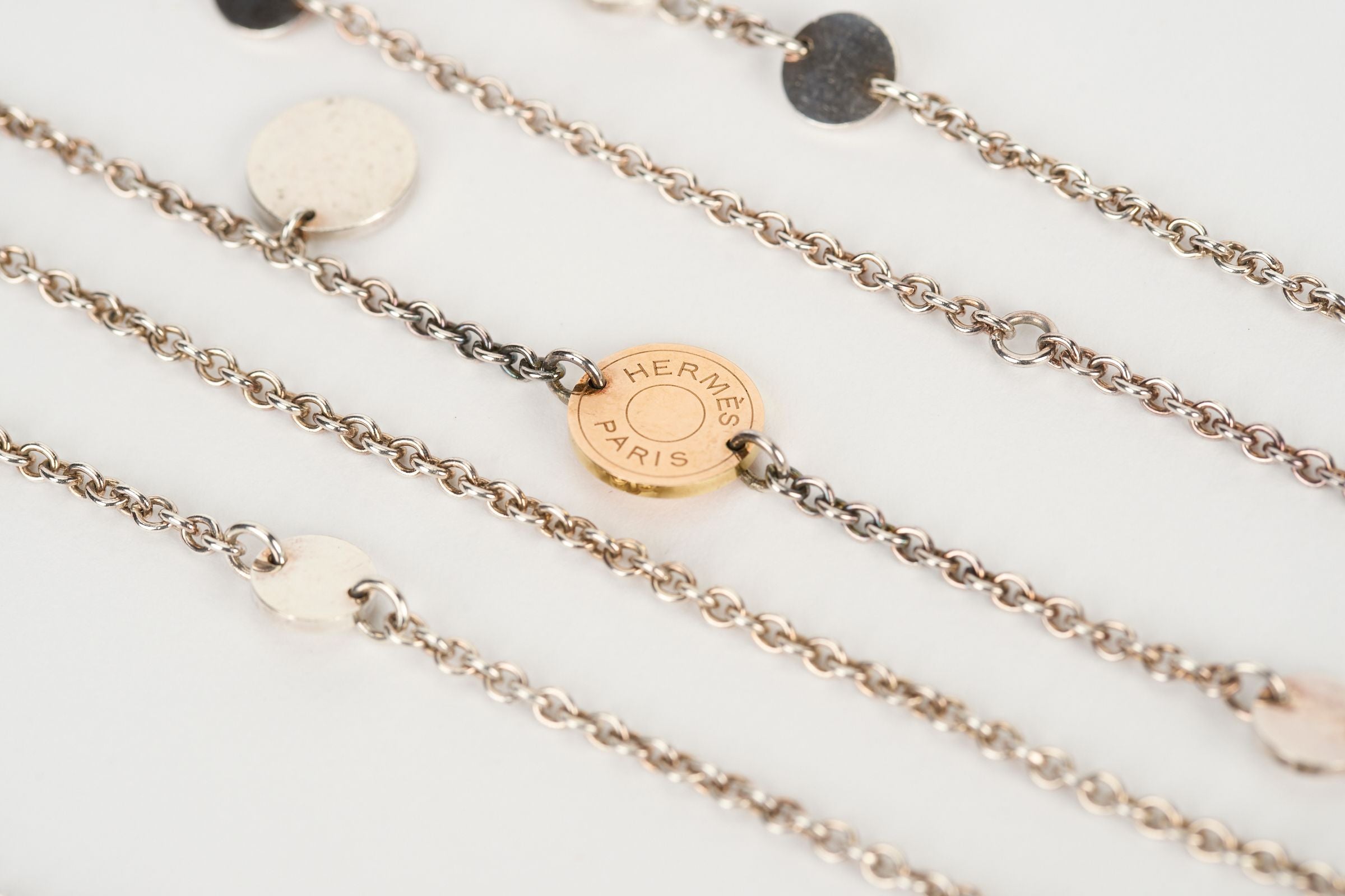 This necklace is done in Sterling Silver and 18k Rose Gold, featuring one 18k Rose Gold station disc and a lobster clasp closure. This necklace includes an Hermès jewelry box and a leather travel pouch.