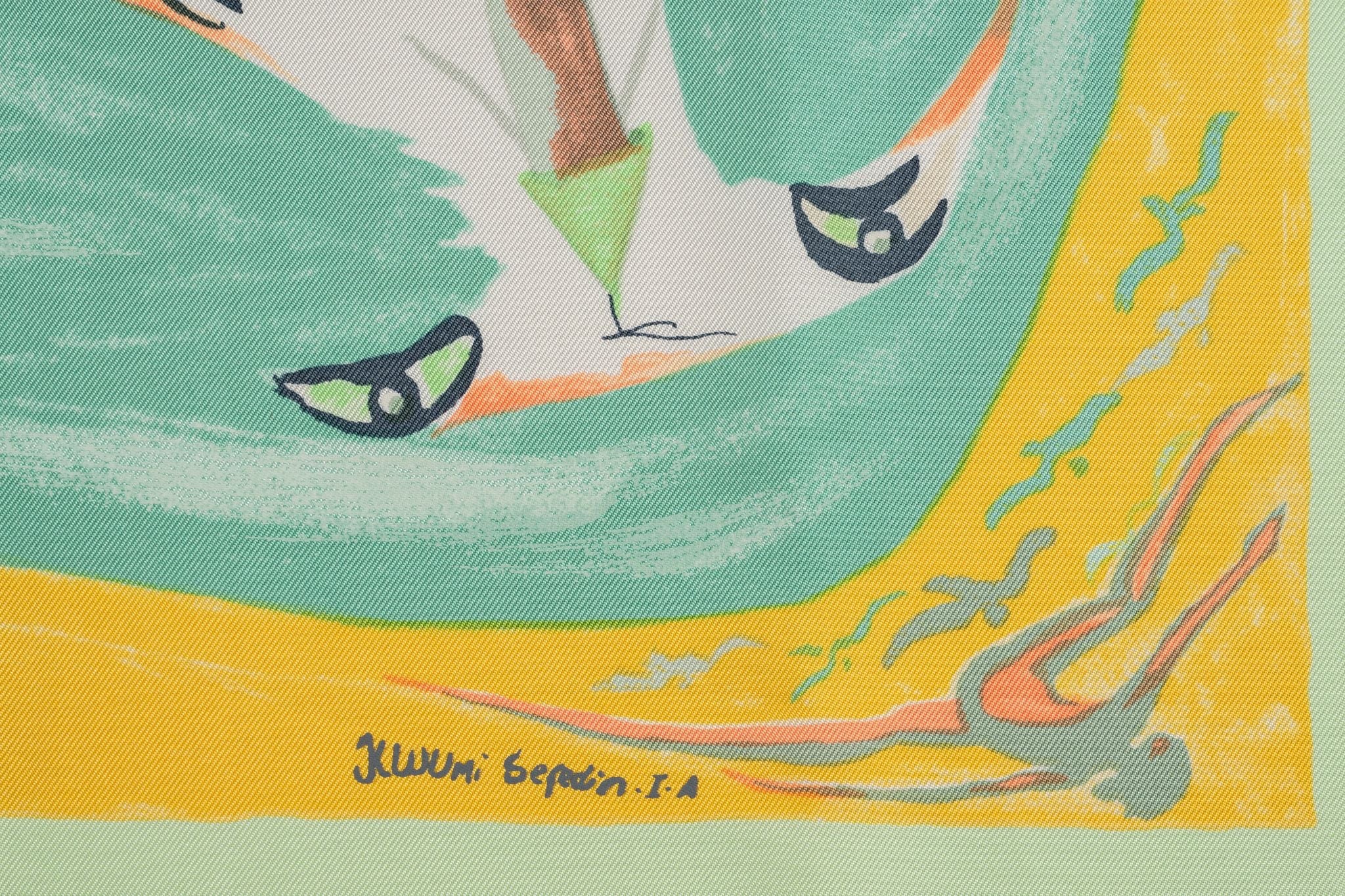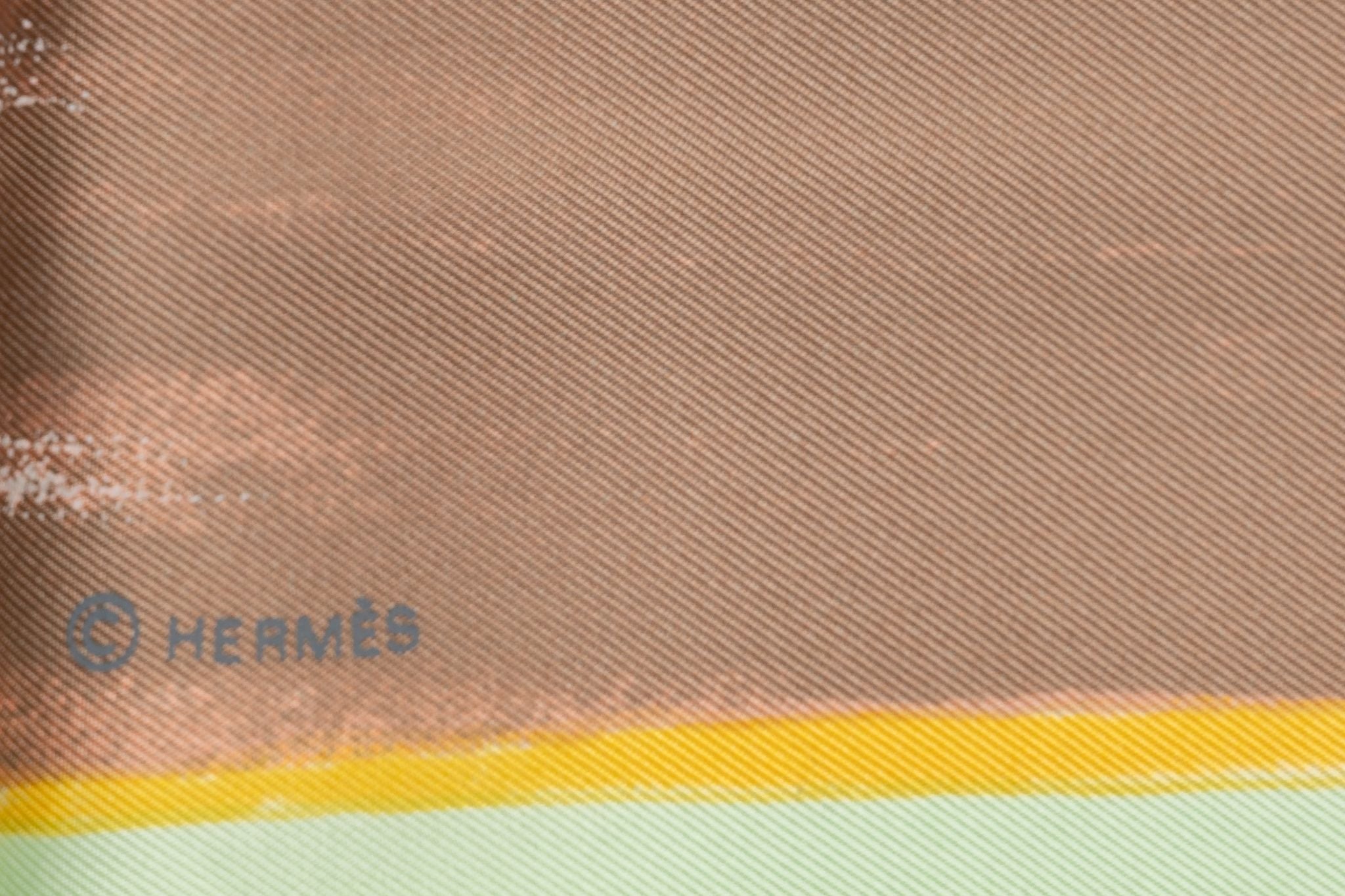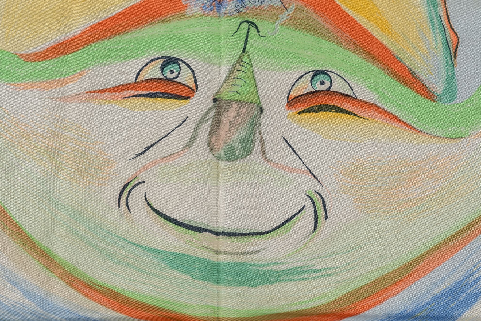 The Hermès’ Smiles in the Third Millenary Scarf will turn your frown upside down! Made of 100% silk, this scarf features grinning faces in a rainbow of colors against a yellow background. It comes with no box.