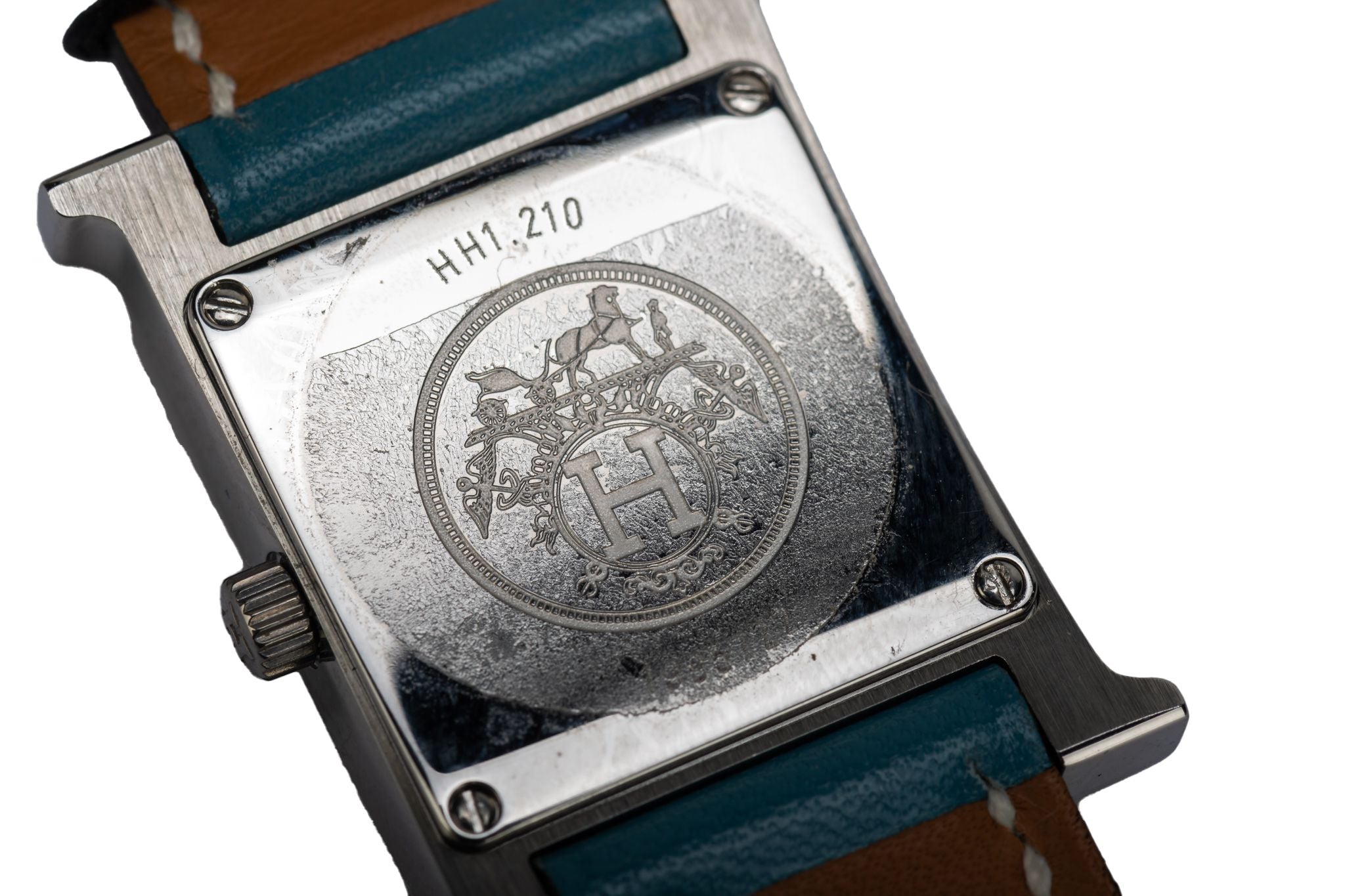 Hermès Swift 25 mm Heure H Hour watch is crafted of stainless steel in a polished Hermes H casing, white dial, silver hour markers, and Swiss quartz movement. Also features, a blue jean calfskin leather band. Comes with a box, an international guarantee, and general instructions for use.