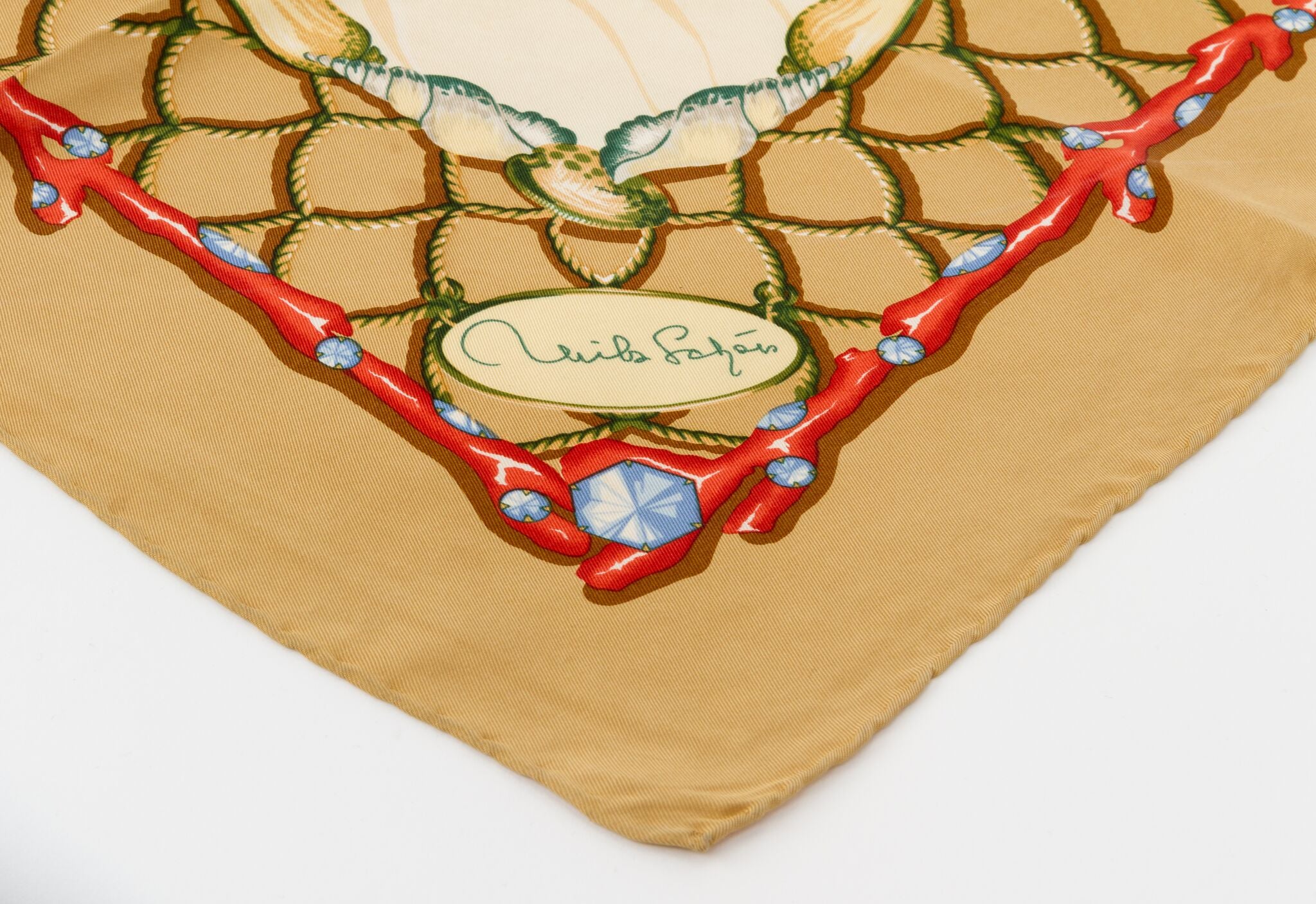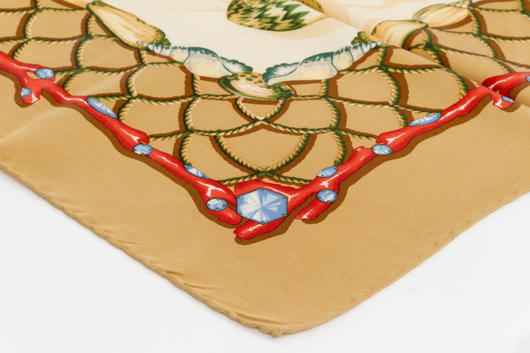 Mila Schon 90s silk scarf, with coral and seashells. Few stains (it has not been washed), please refer to photos. Hand rolled edges.