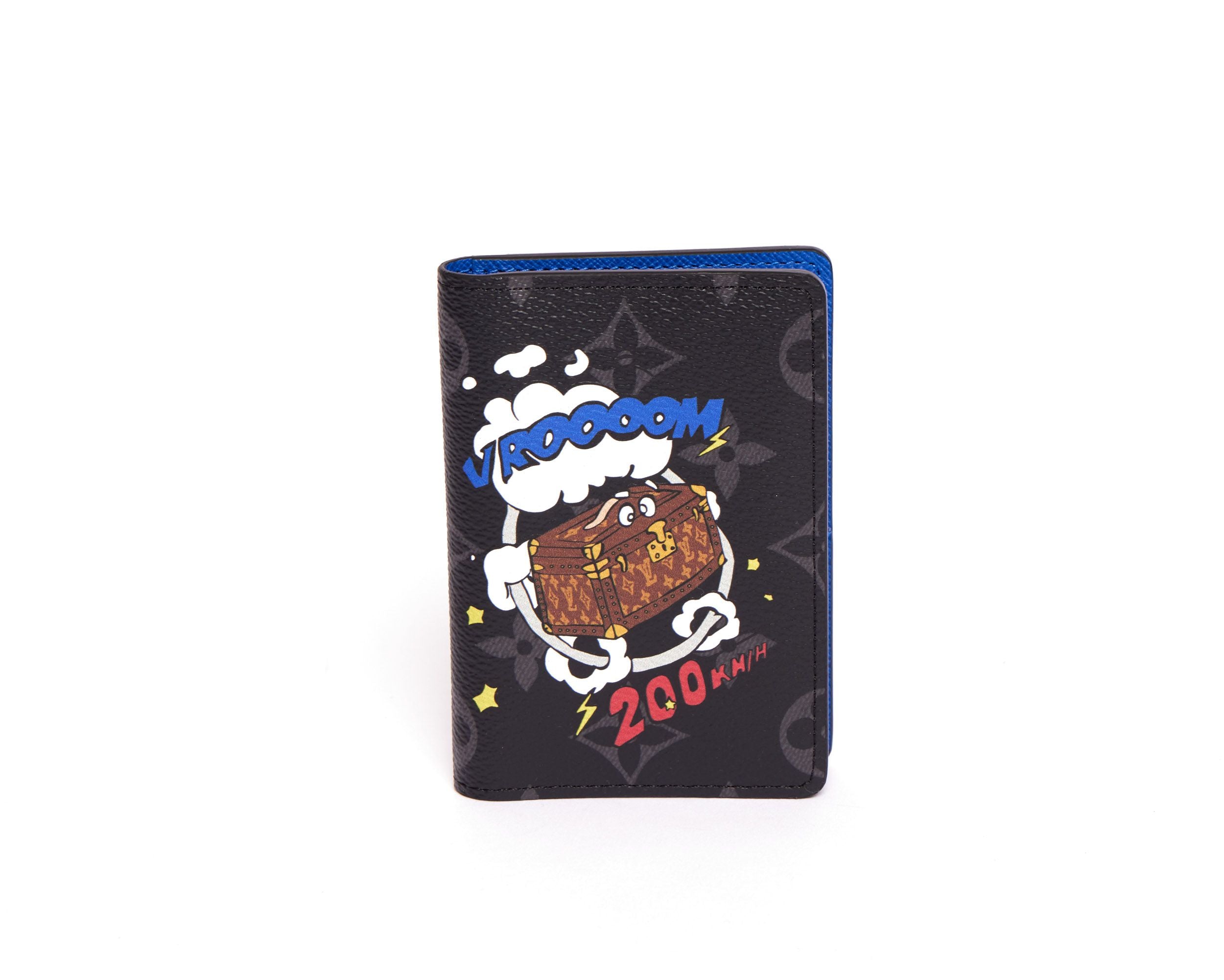 Black and grey monogram canvas limited edition organize pocket. Multicolor painted canvas and blue cowhide leather lining. Multiple card slots and compartment inside. Comes with original bag and dust cover.