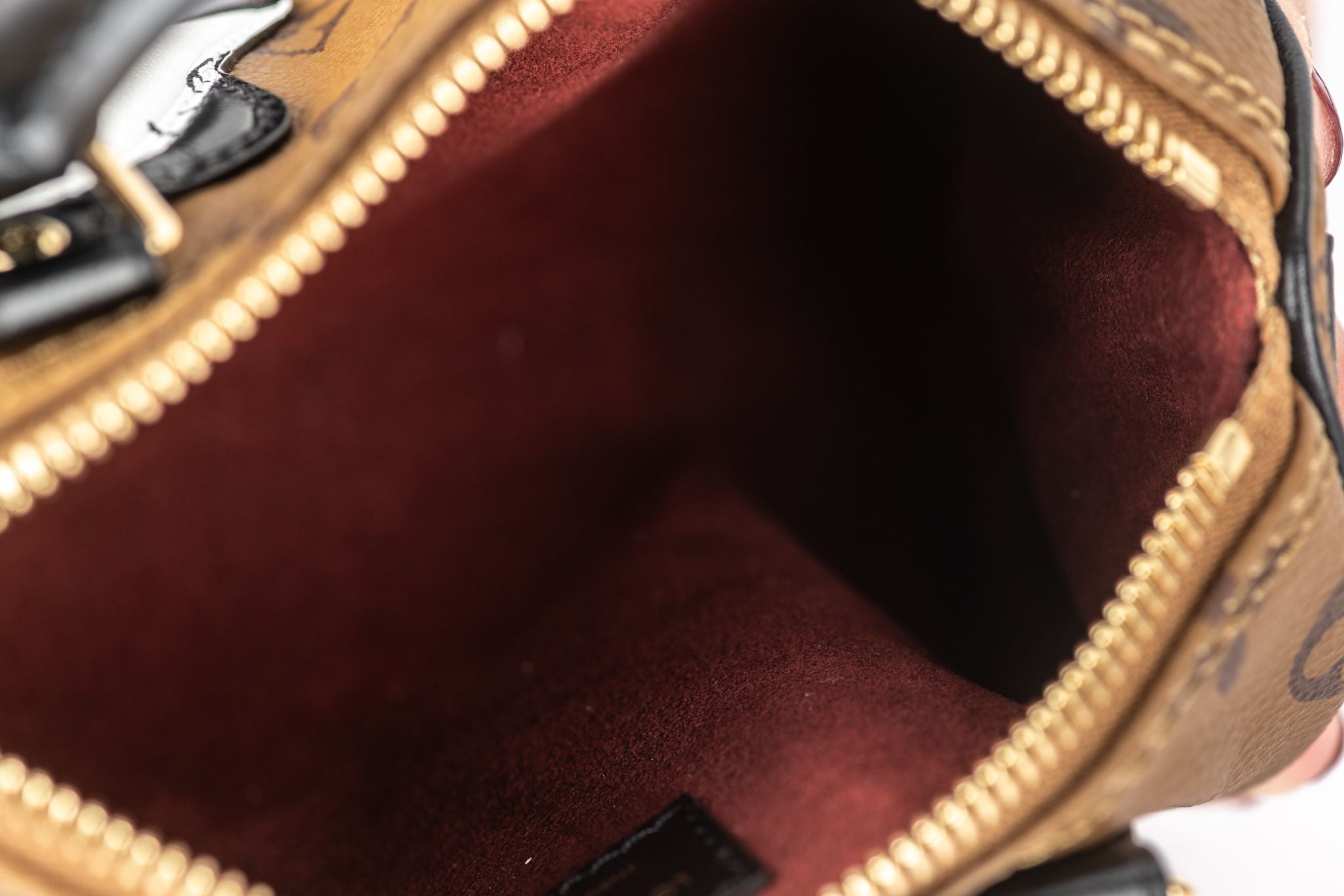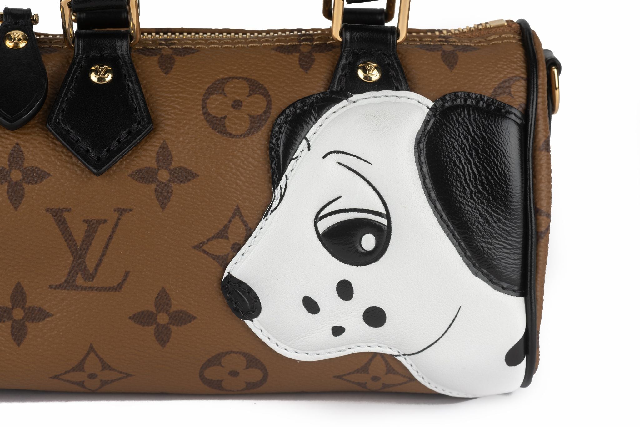 This exclusive Nano Speedy bag is part of a collaboration between the artist Sun Yitian, known for her colorful paintings of mass-produced toys, and Louis Vuitton Artistic Director Nicolas Ghesquière. Crafted from Monogram Reverse canvas, it features a calf-leather patch of a cute black and white dog. This playful, collectible piece comes with a red lining, relying on the background of the original artwork, and a removable shoulder strap. Brand new with original dust cover and box.