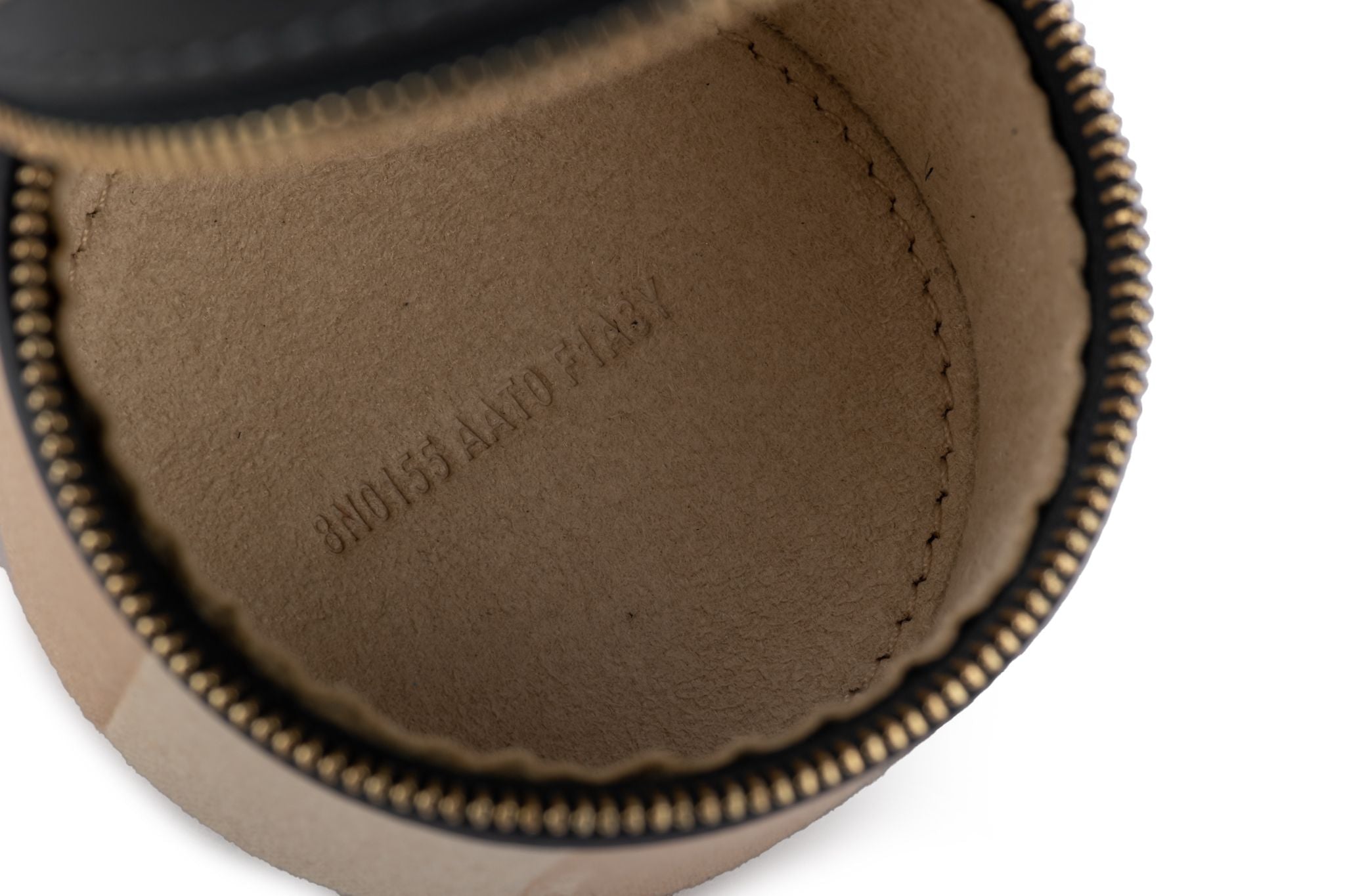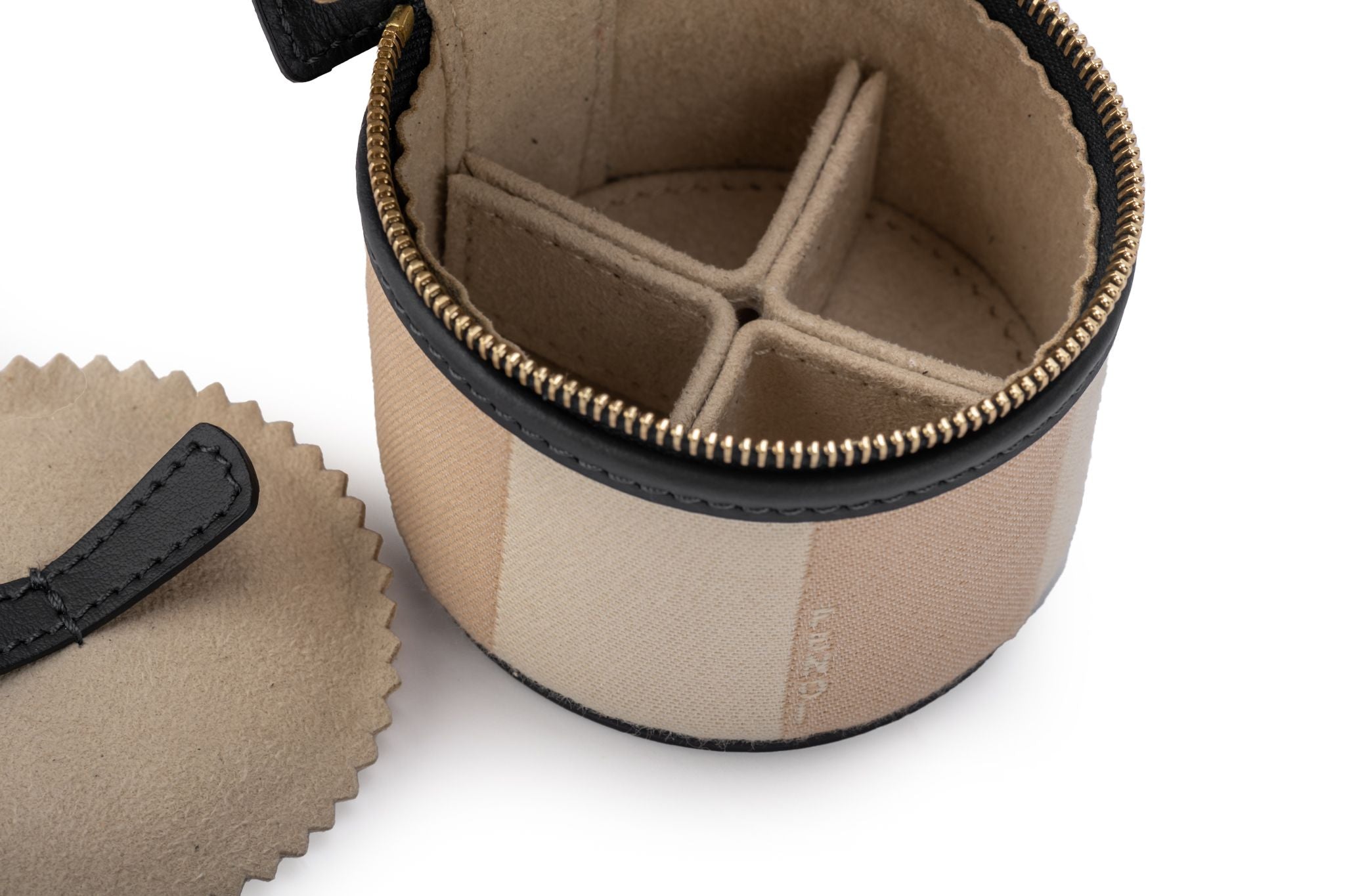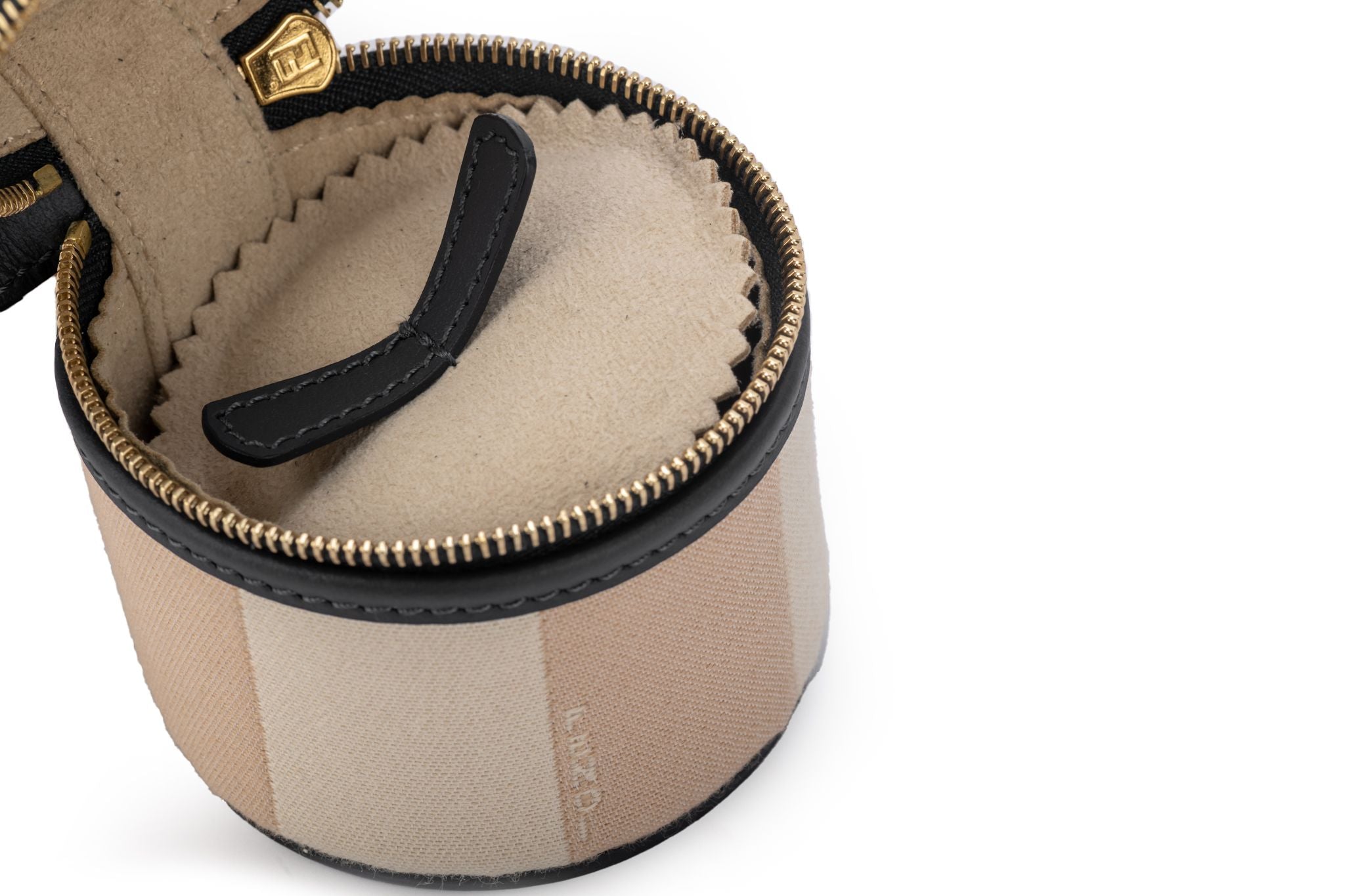 Fendi brand new travel jewelry case. Pinstriped fabric, black leather and suede. Hardware in gold. Comes with box, booklet, tag and dustcover