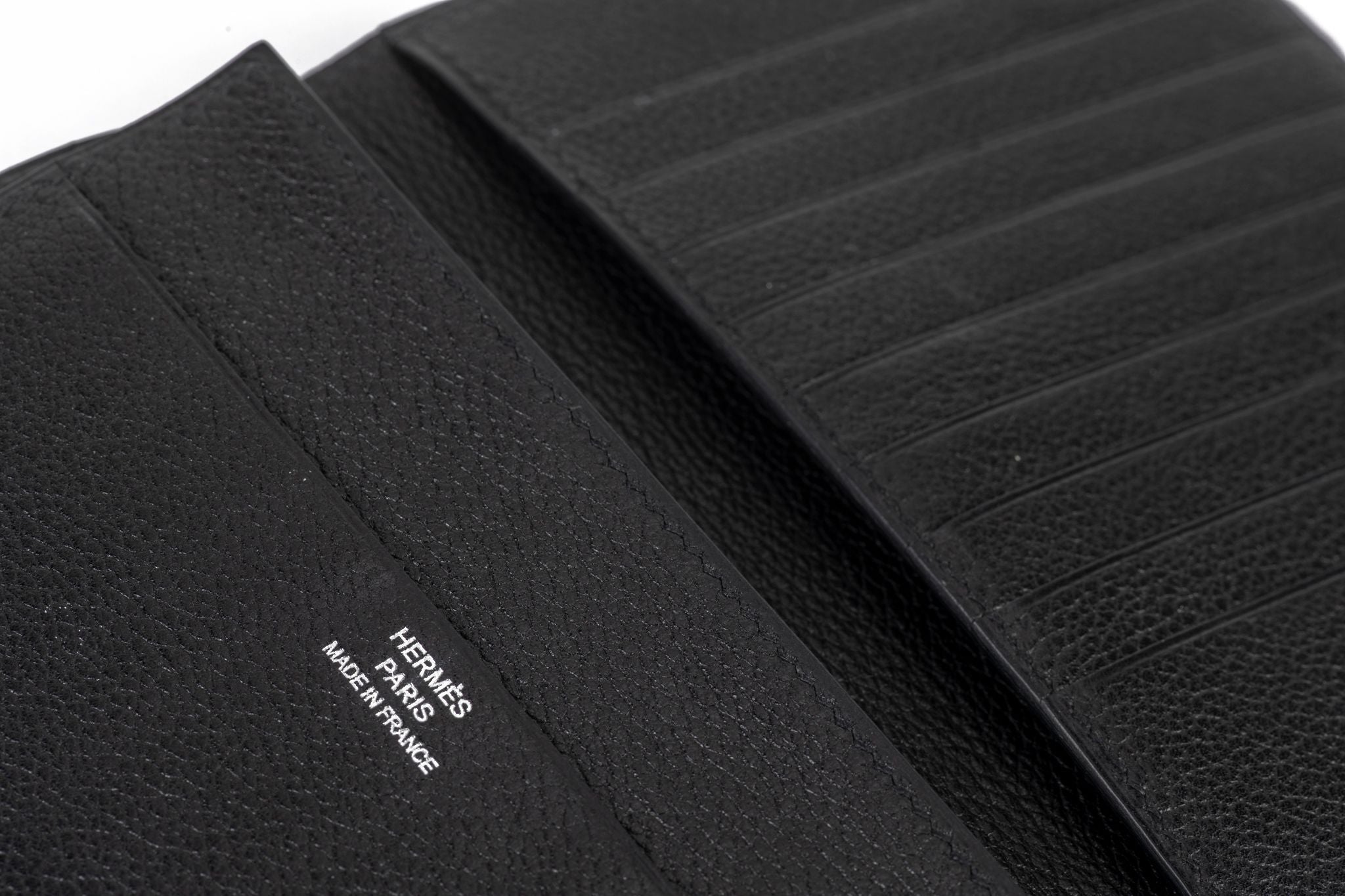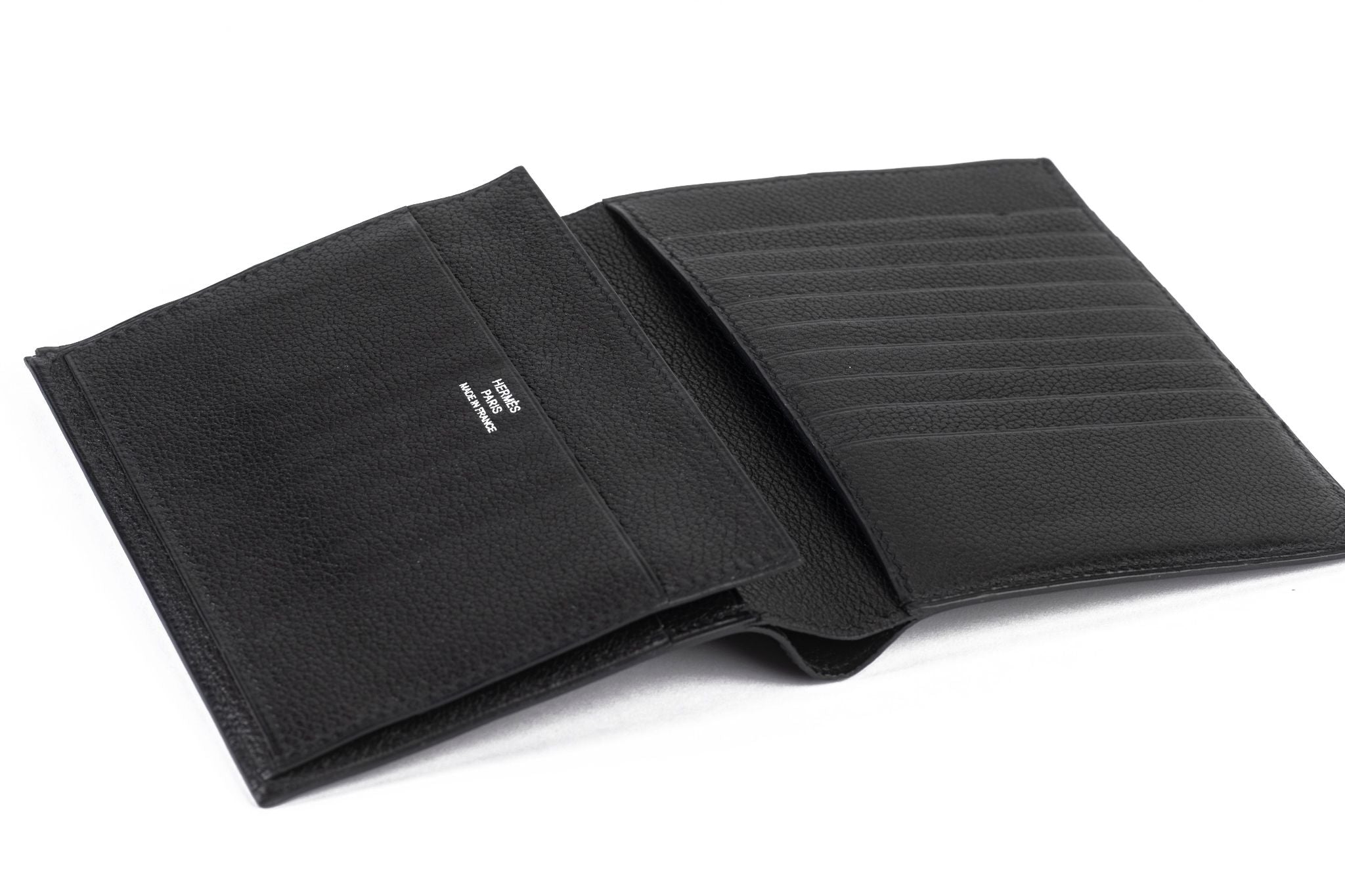 This Hermès Epsom MC2 Euclide card holder case in Epsom leather in black. The wallet opens to a smooth leather interior with card slots and patch pockets. Letter L in a square. Comes with original box.