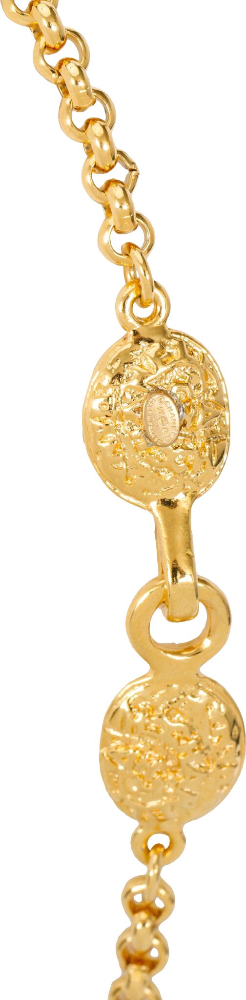 Condition: ExcellentEra: Vintage; 1970s: 8" L x 1.8" WMaterials: metal/glassColor: gold/red/blue/pearlRare Chanel 1970s goldtone chain...