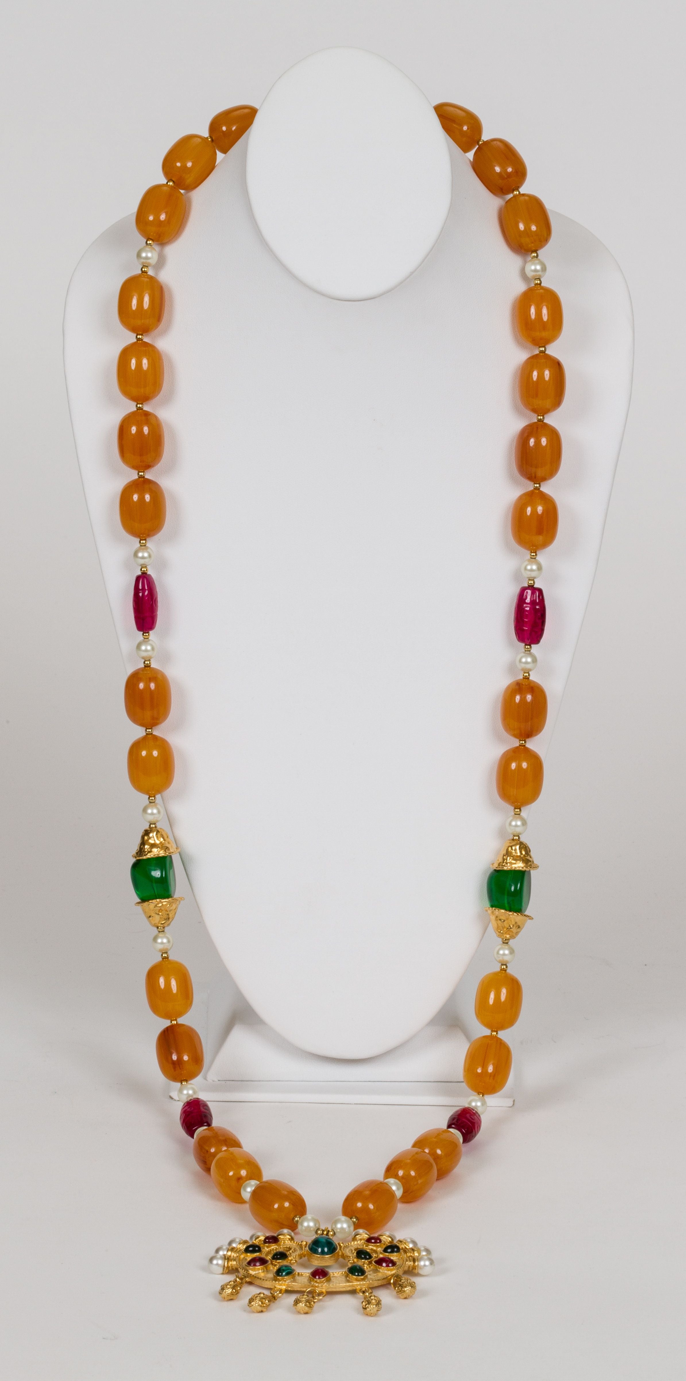 Kenneth Jay Lane collectible extra long imitation amber necklace with faux gripoix and pearls pendant. Pendant is 3"x3". Comes with velvet pouch .