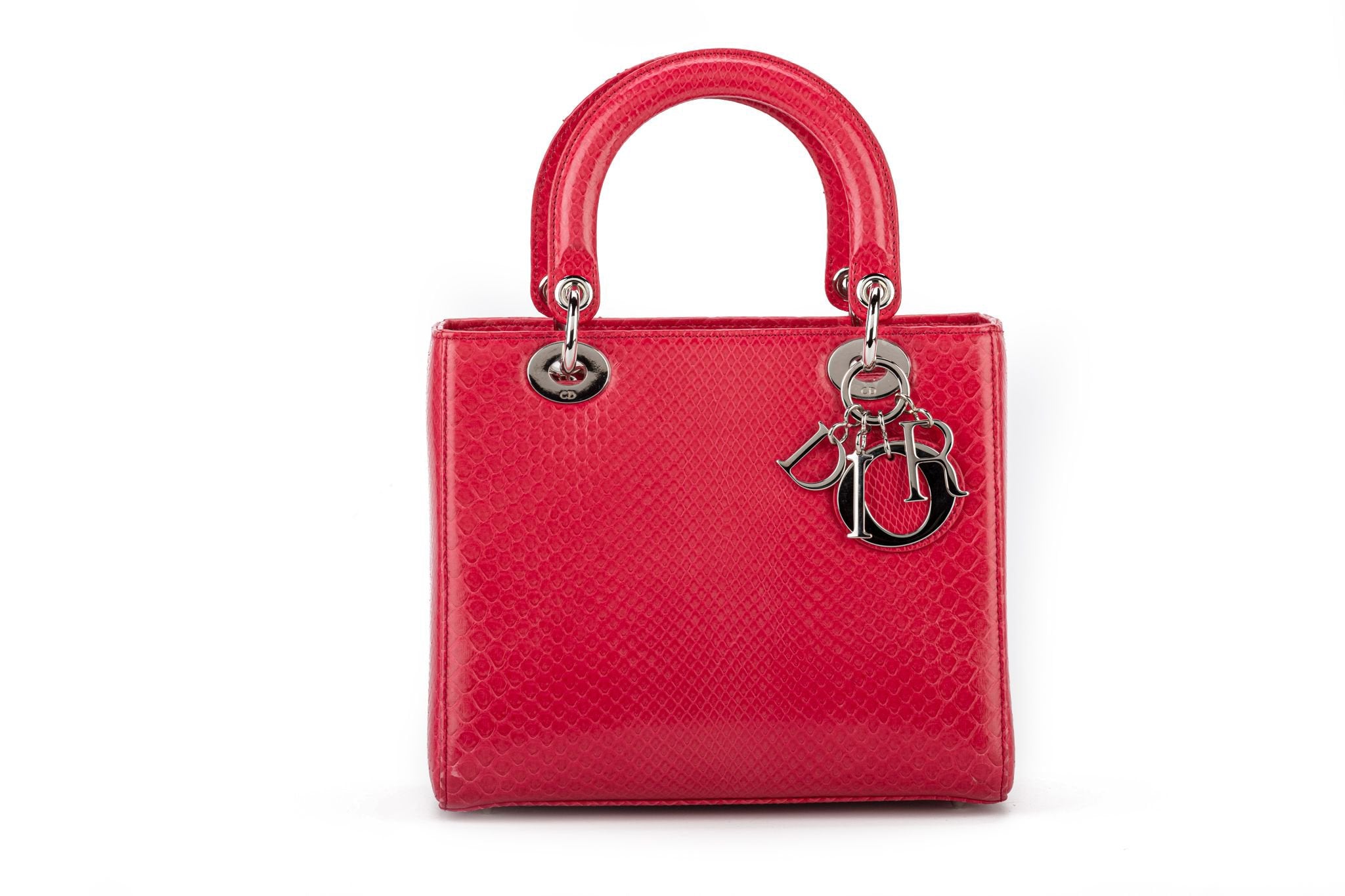 Christian Dior Python large Lady Dior bag in red. Mint condition The handle drop is 4" and the shoulder strap drop 17". The bag has single zipper and one zip pocket. This item does not ship to California due to Wildlife regulations. Comes with original dust cover.