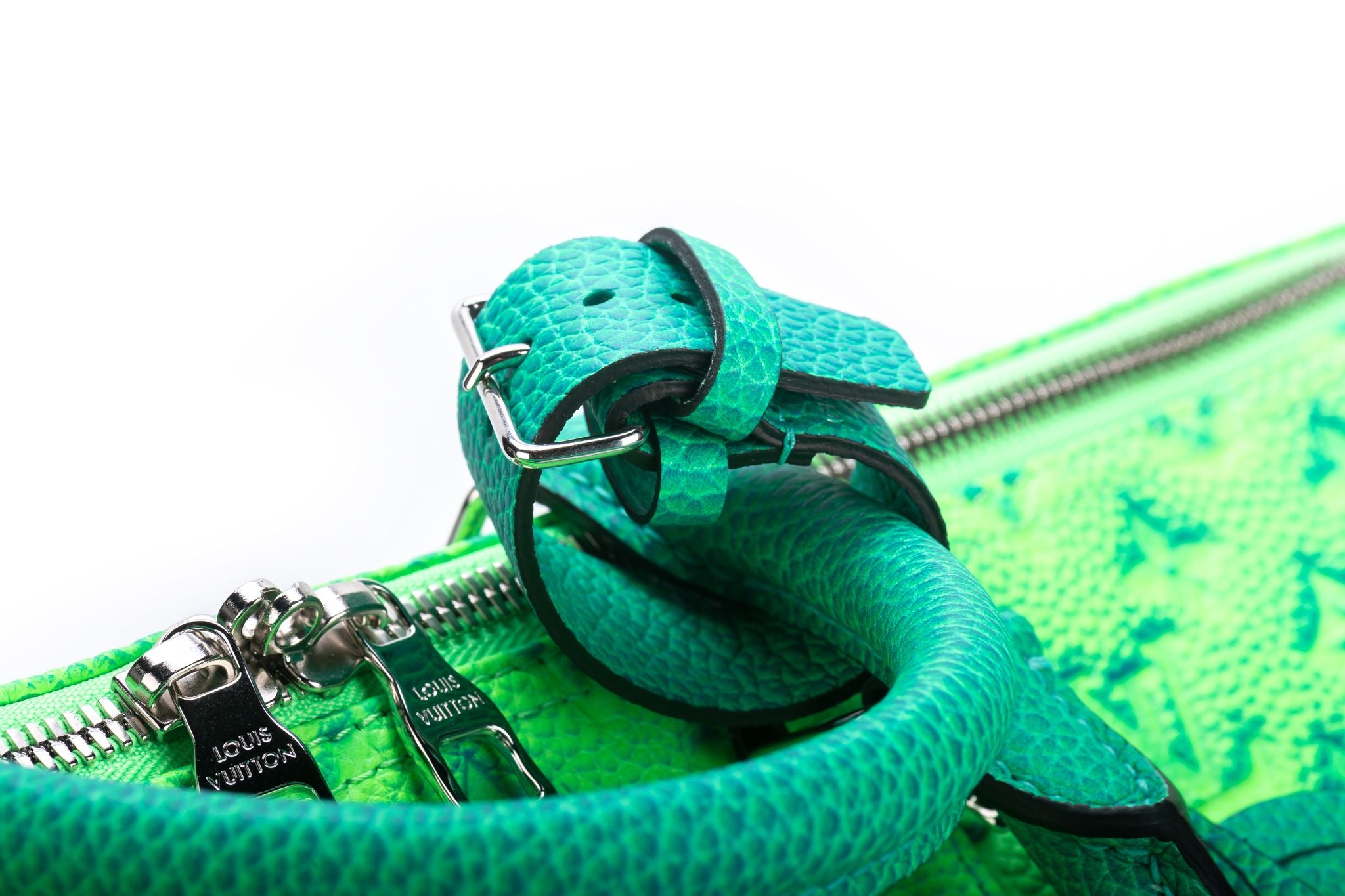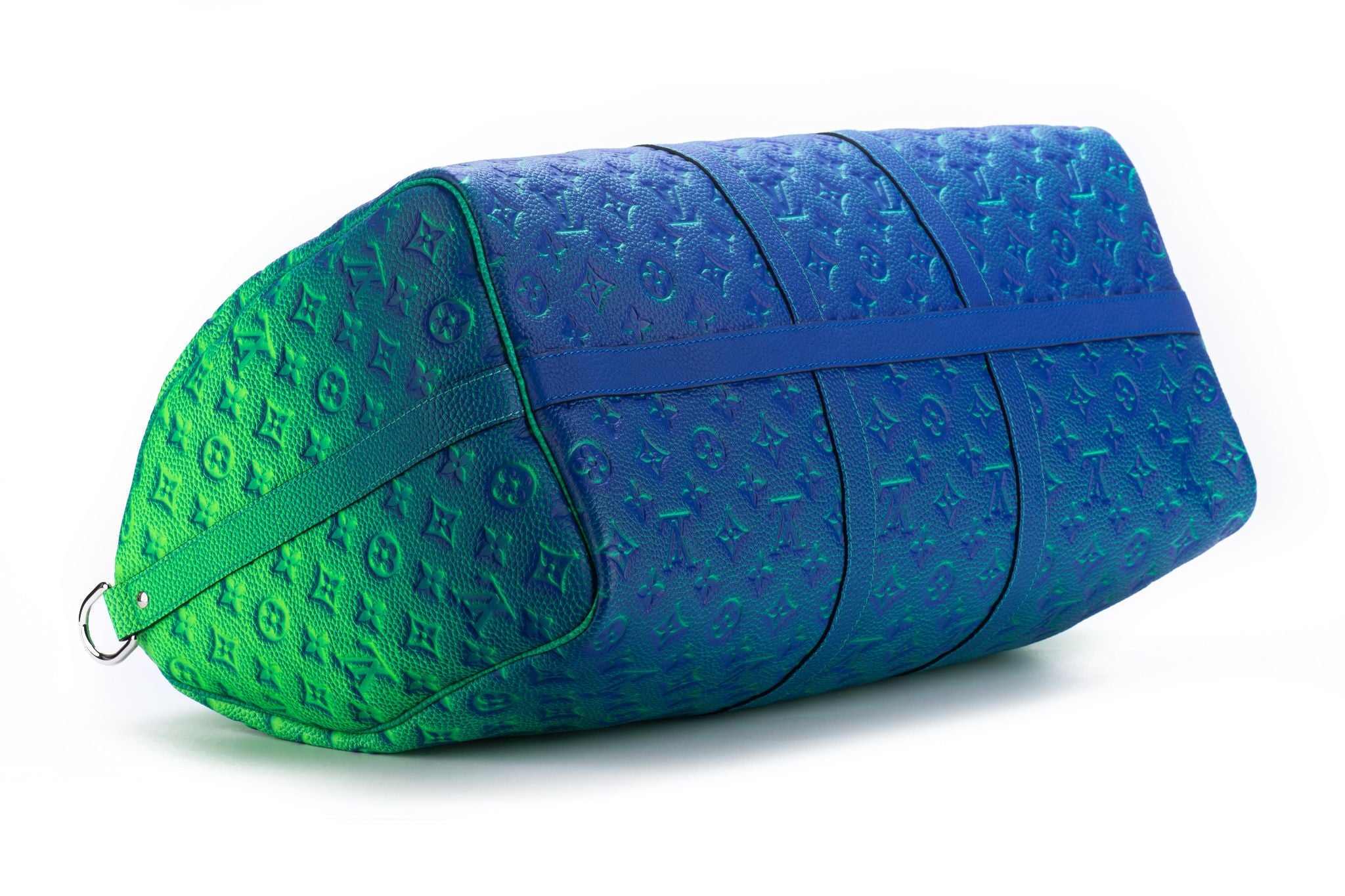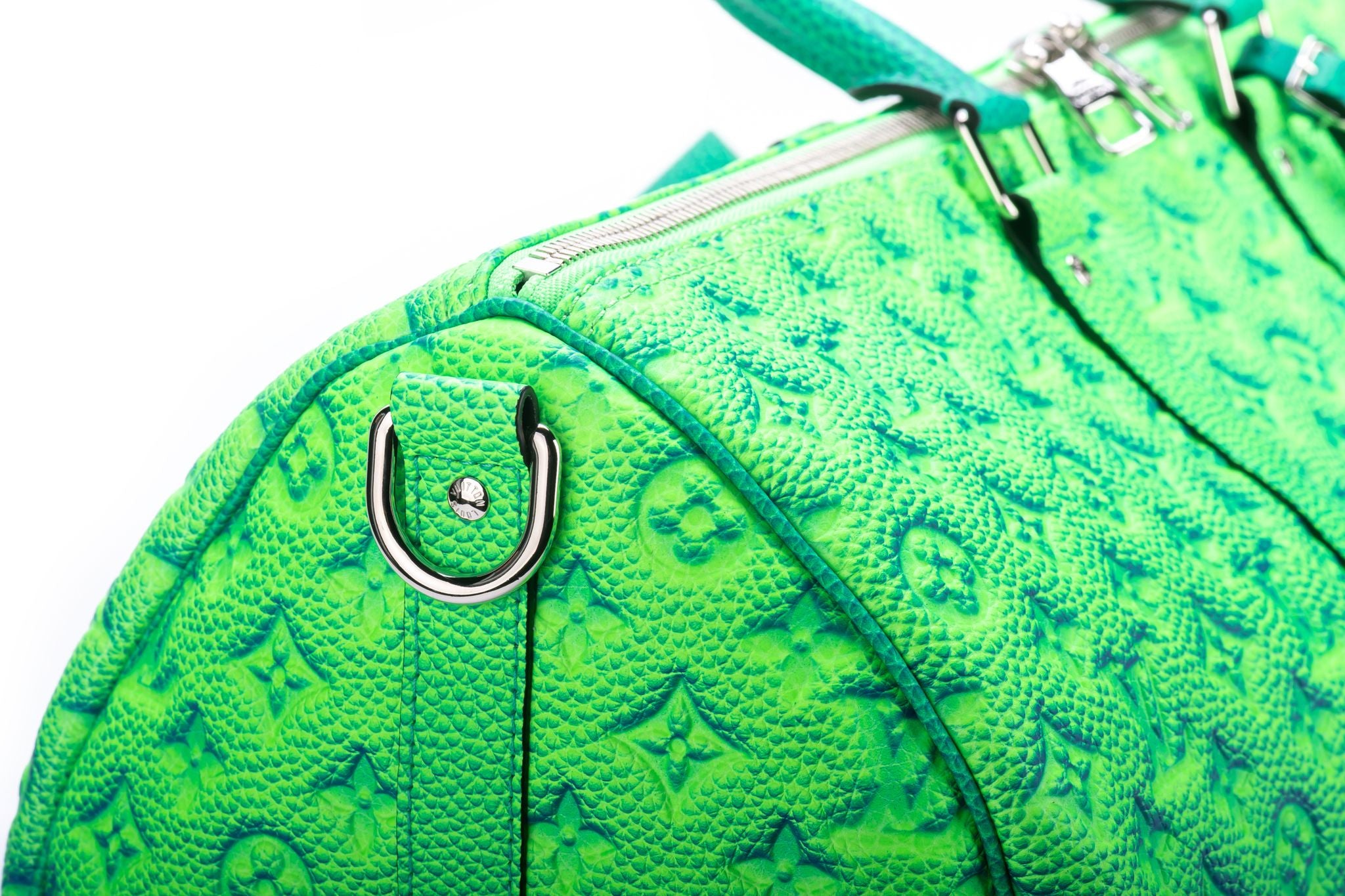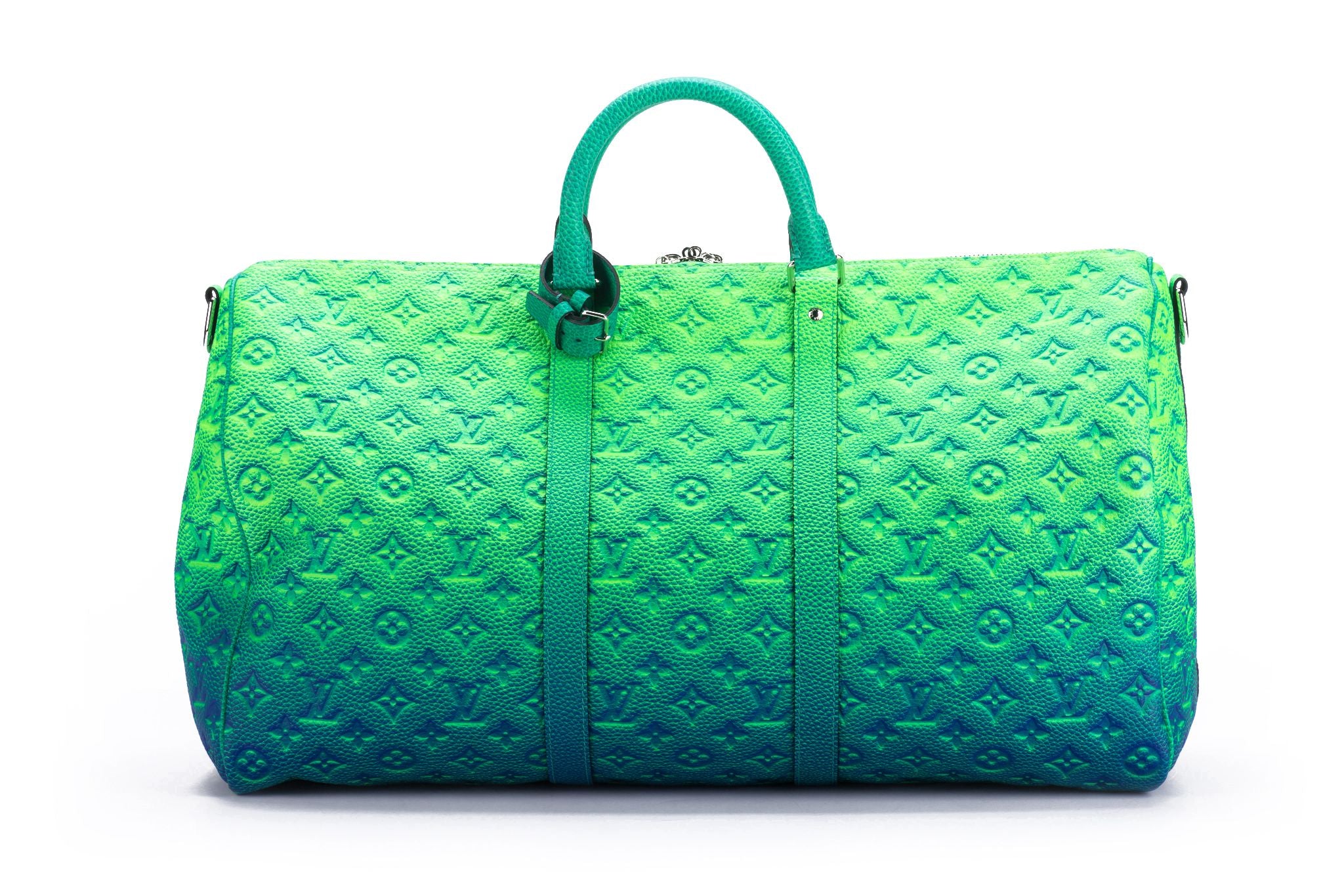 The Louis Vuitton Keepall 50 Bandouliere is made from bull calfskin with a soft multicolored green. This bag is from the Virgil Abloh Illusion leather collection. Soft side and cabin-friendly, the Keepall 50 bag merits it’s name: the unexpectedly spacious interior can hold everything needed for a weekend gateway. This is the new and the last collection of the late designer Virgil Abloh.