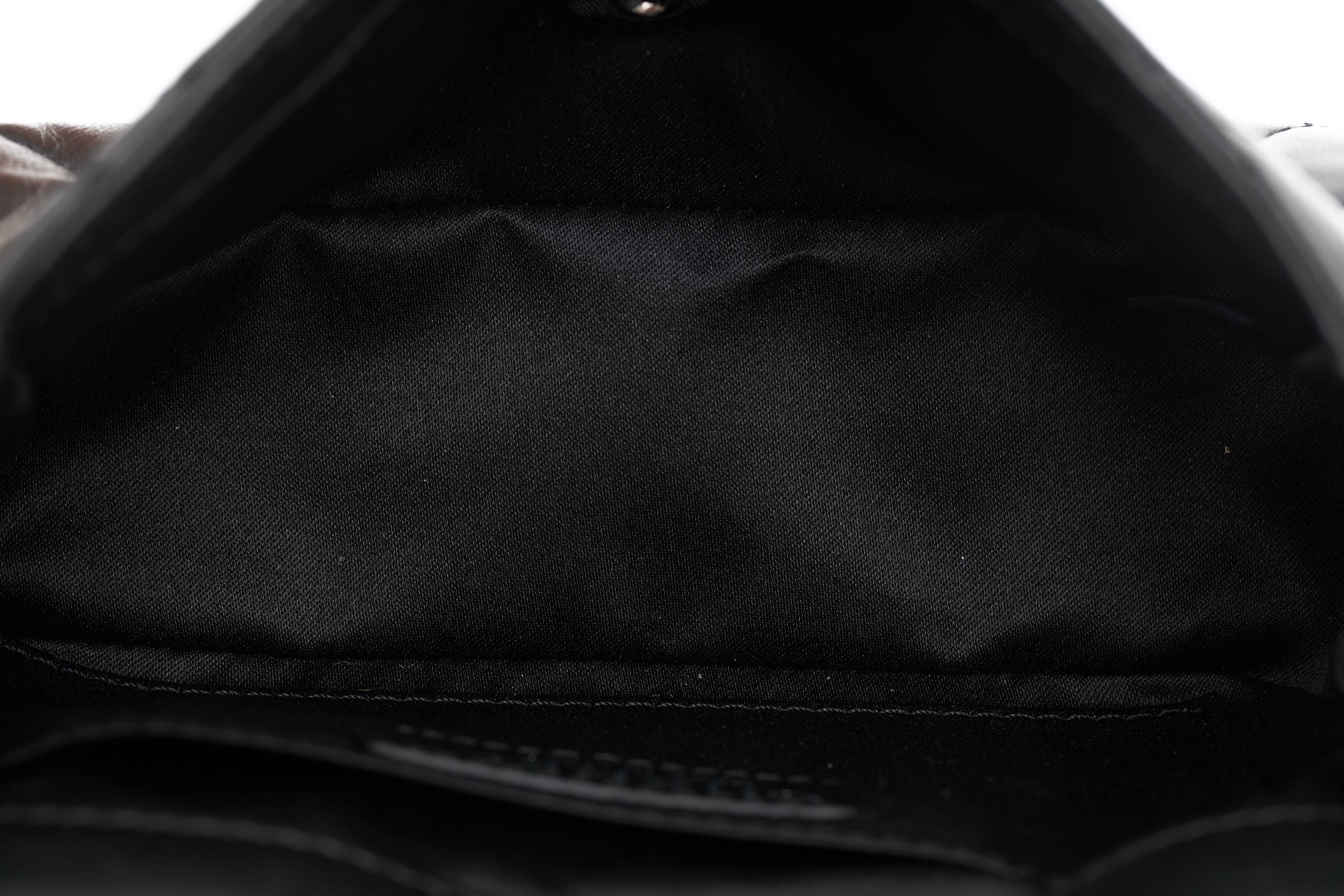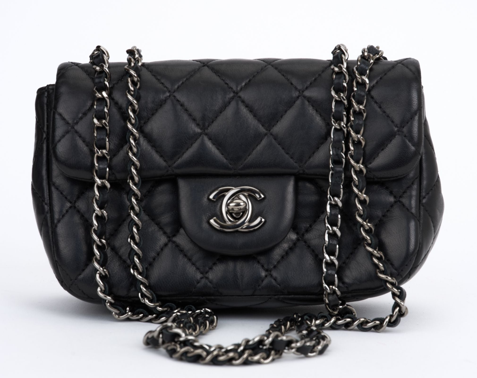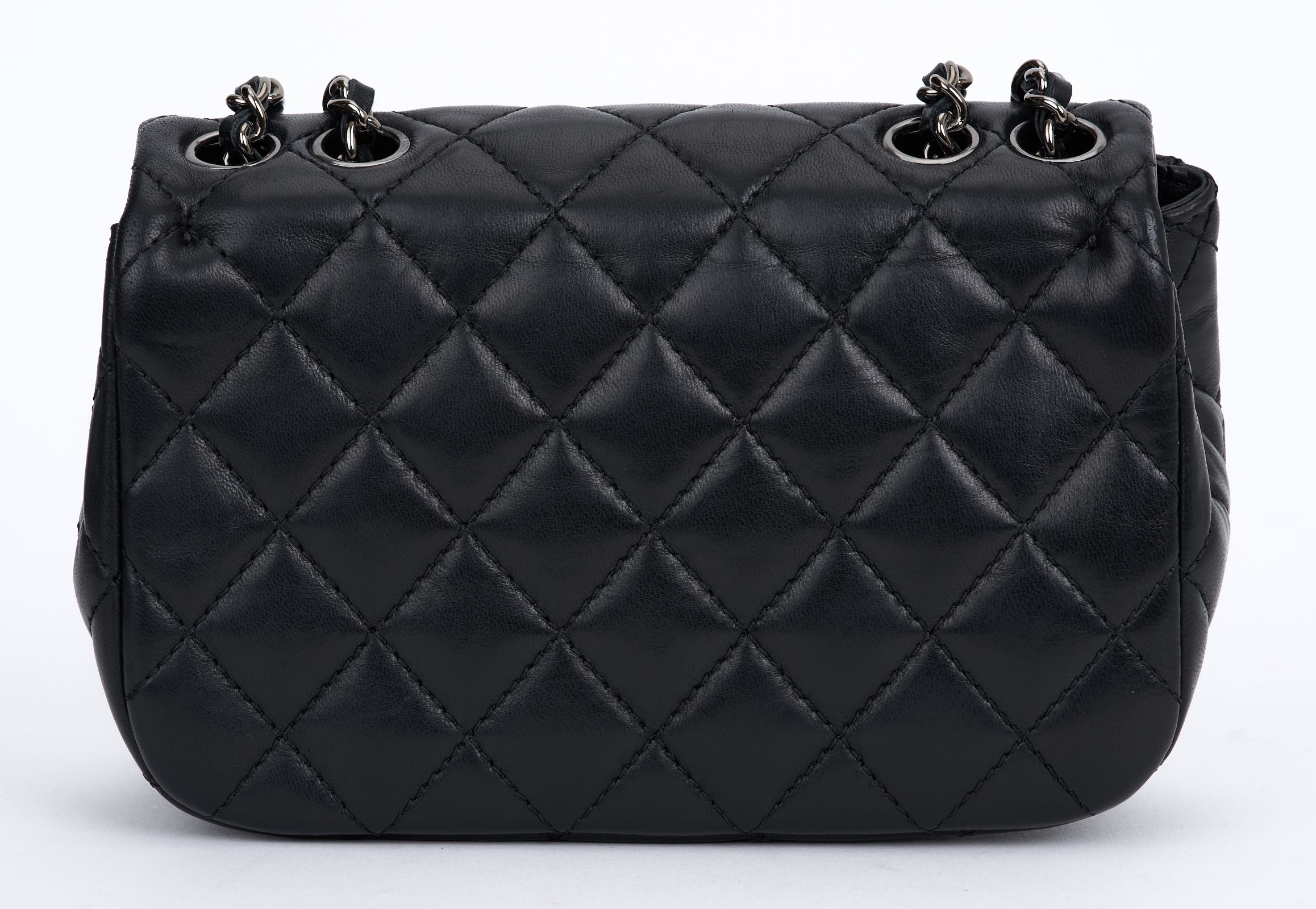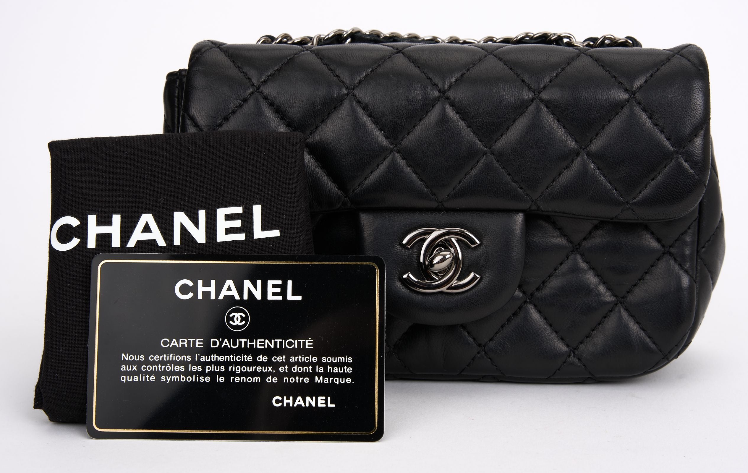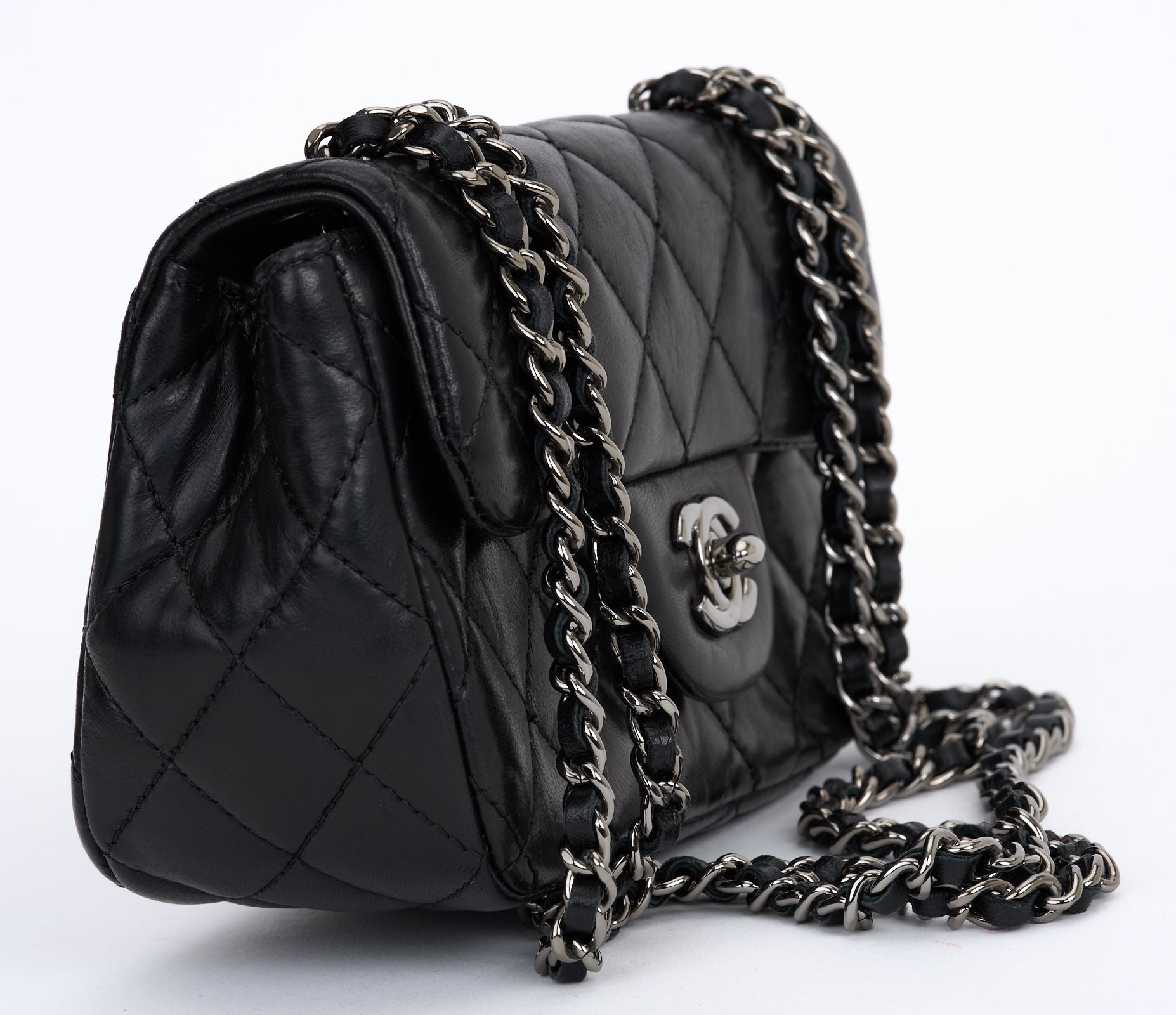 This Chanel Quilted Mini Flap bag features black leather calfskin, ruthenium hardware, chain-link shoulder strap, turn lock closure. Dust cover and ID card included. First two hologram numbers are 17. Strap Drop - 11".
