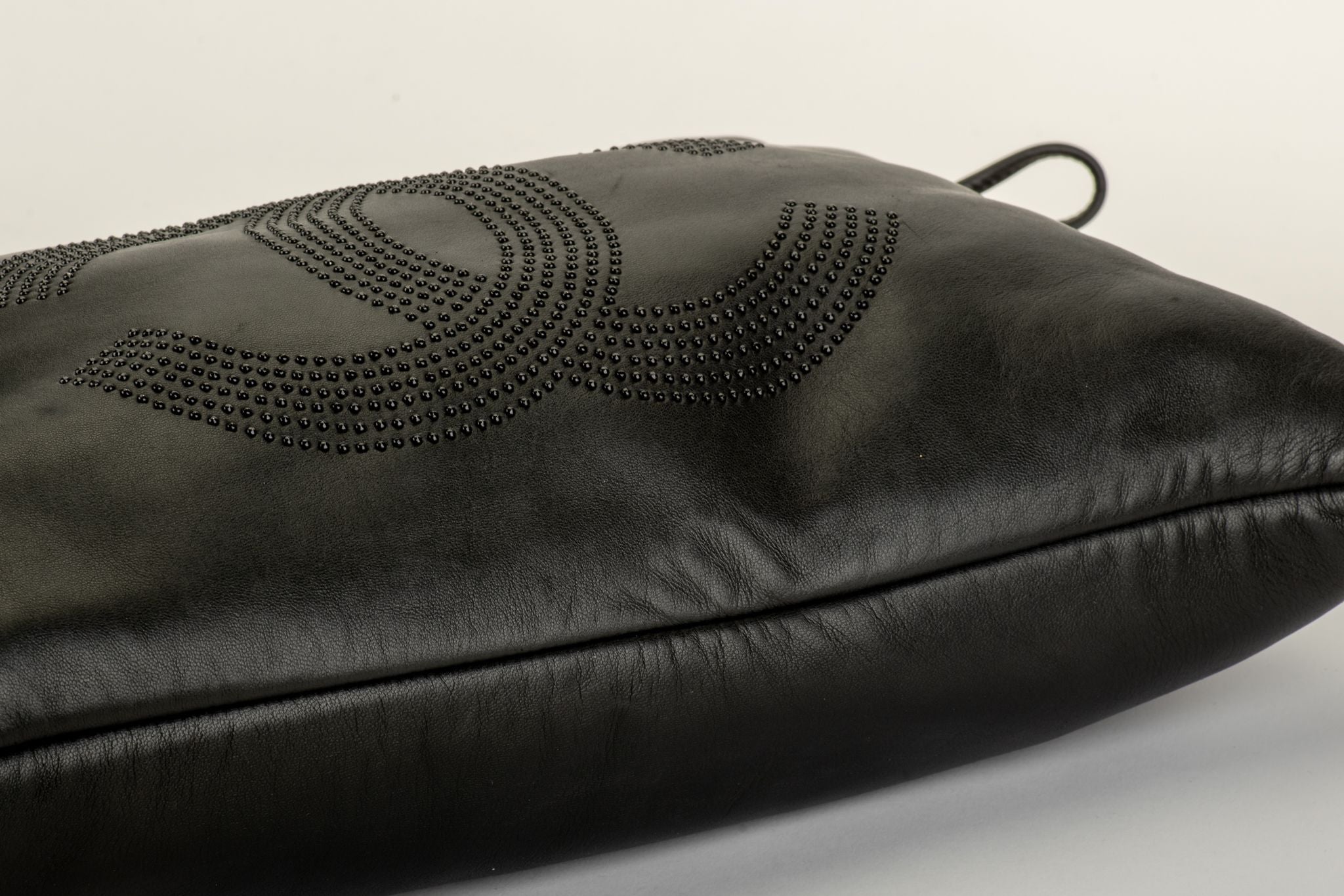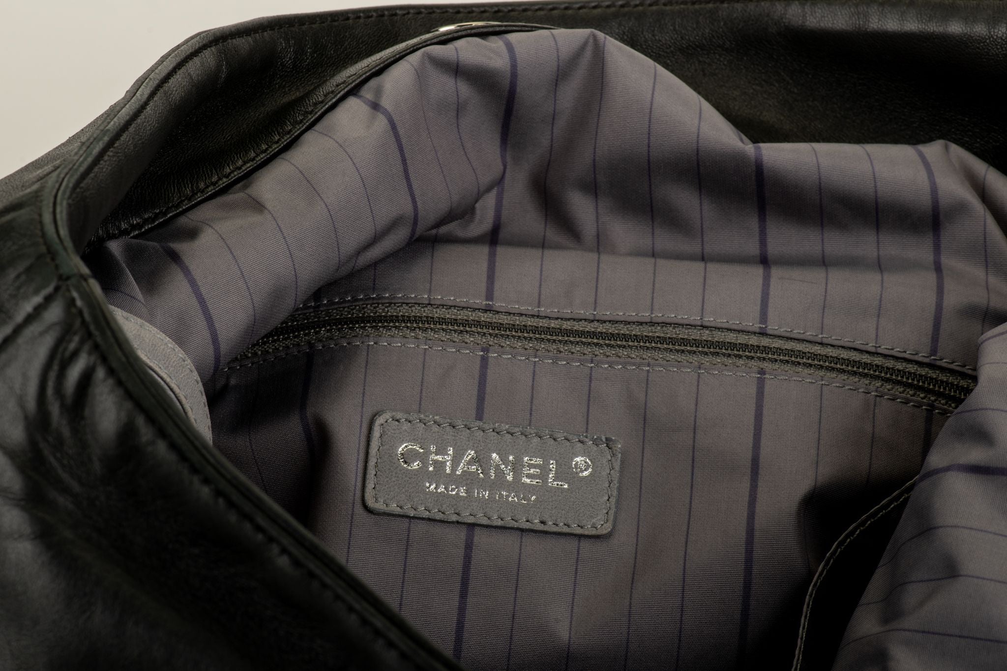 The Chanel Leather Chain Tote from the Collection by Karl Lagerfeld. Features black calfskin with embellished CC logo on front, silver toned hardware, chain link shoulder straps, snap closure and three interior pockets. Collection 12. Comes with hologram and generic dust cover . ........................................................