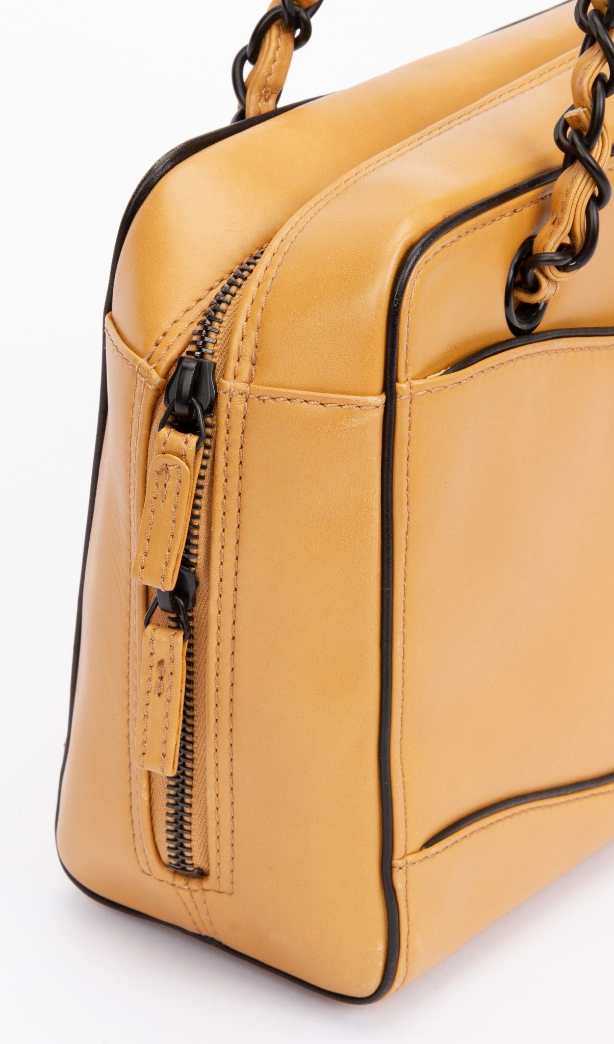 Chanel light brown leather vintage bag. It features a light brown exterior with contrast trims, two interwoven resin-leather handles and a spacious fabric interior. The shoulder strap has a drop of 11". It also comes with a pouch (L 9.25" x W 2" x H 6"). The bag has the authenticity hologram and card and booklet. It comes with the original dust cover. Collection 6.
