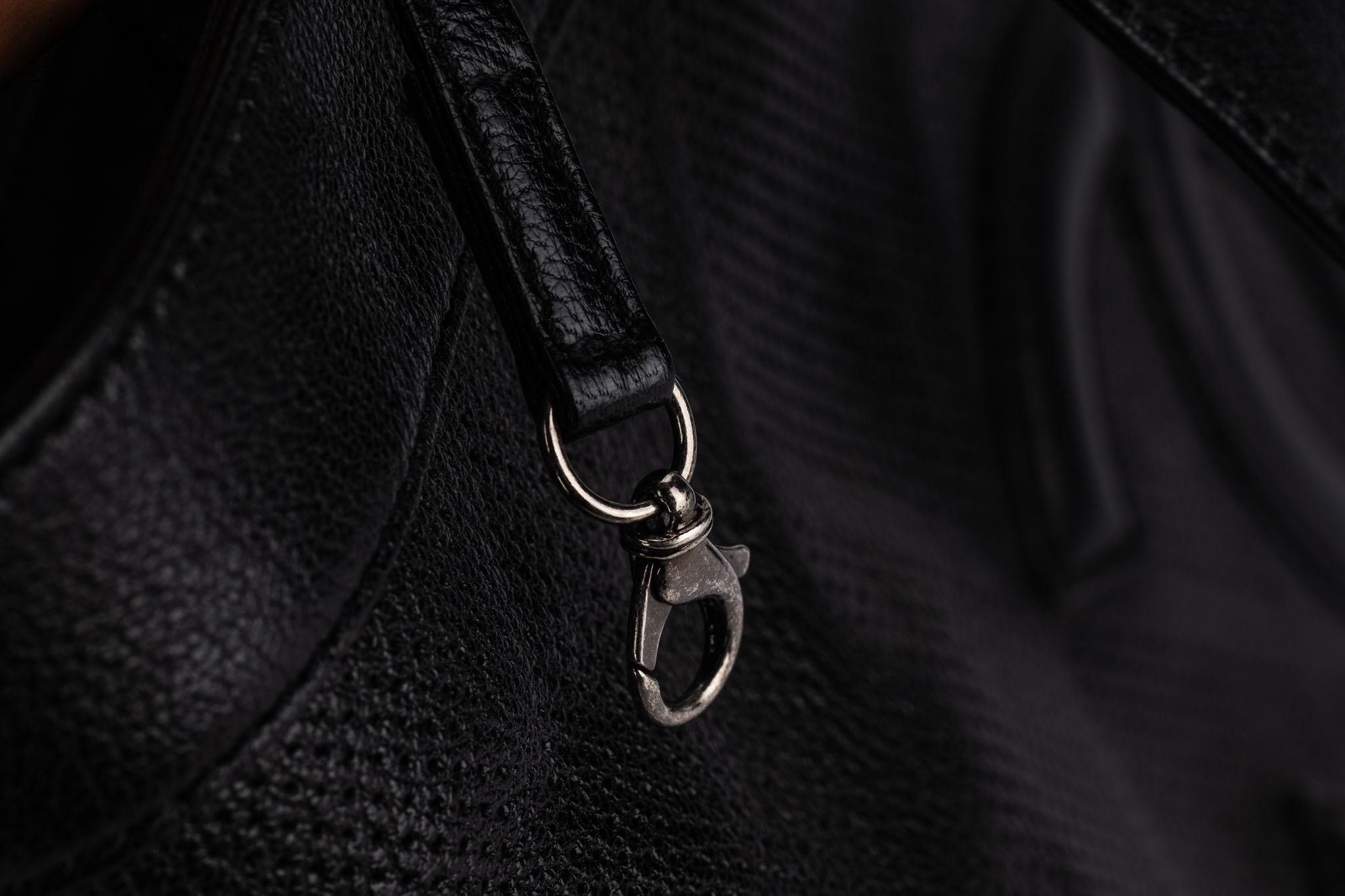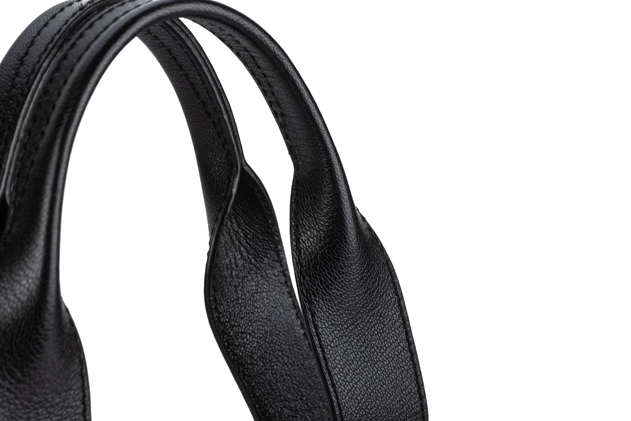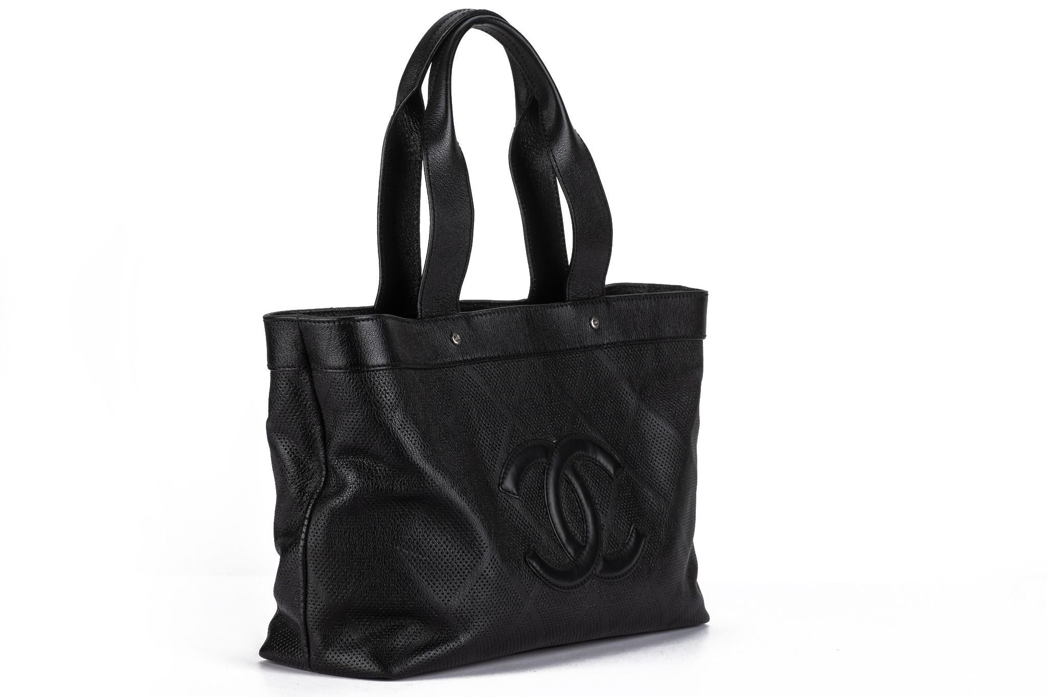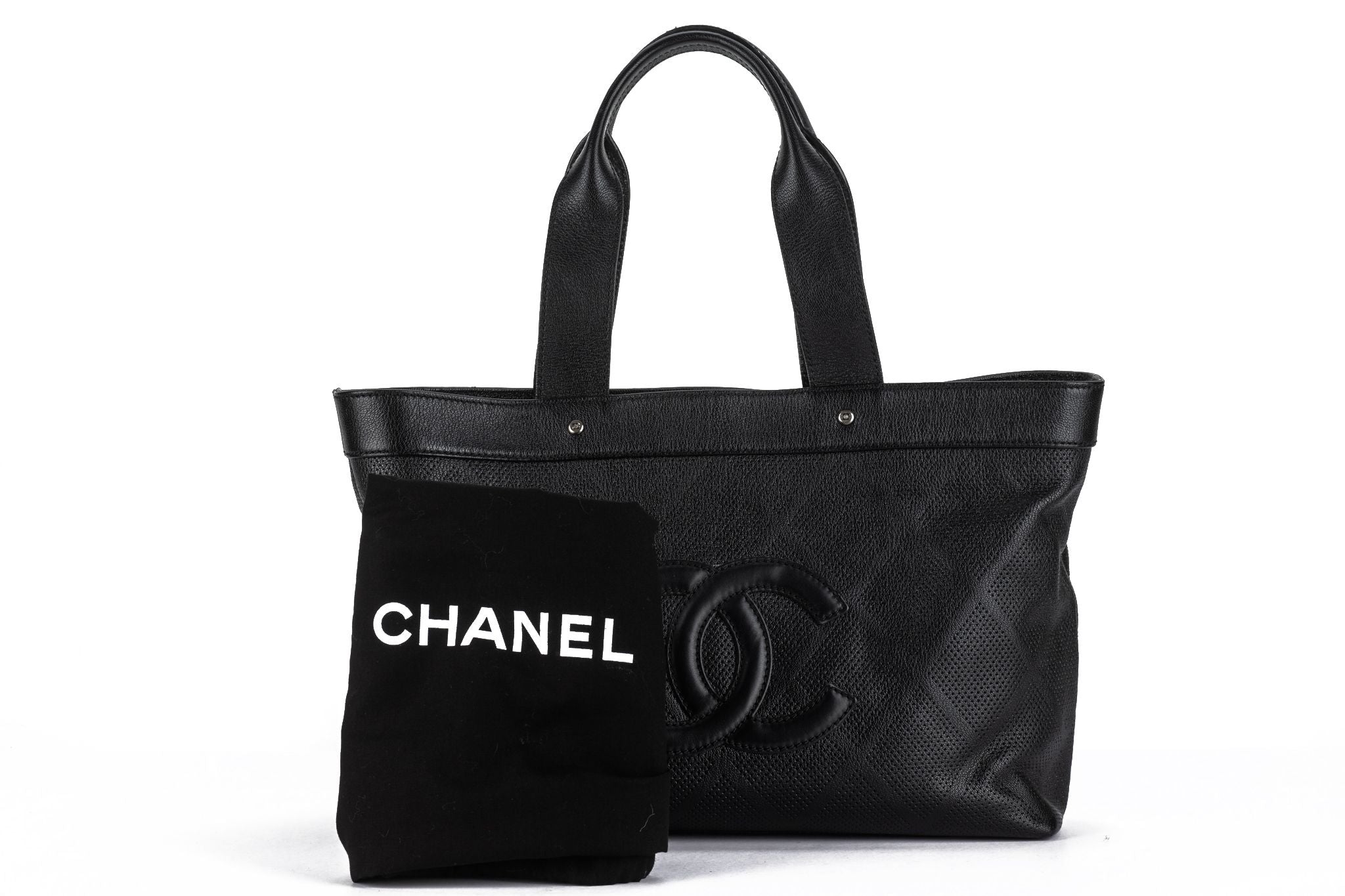 This Chanel leather perforated large CC Tote in black. The tote is a classic, distinctively structured bag that is crafted of stylish black diamond pattern perforated leather. The bag also features two tall leather strap top handles. Comes with original dust cover. First 2 numbers 11. Please note, in the back there is a minor scratch, barely visible, probably due to contact with heat .