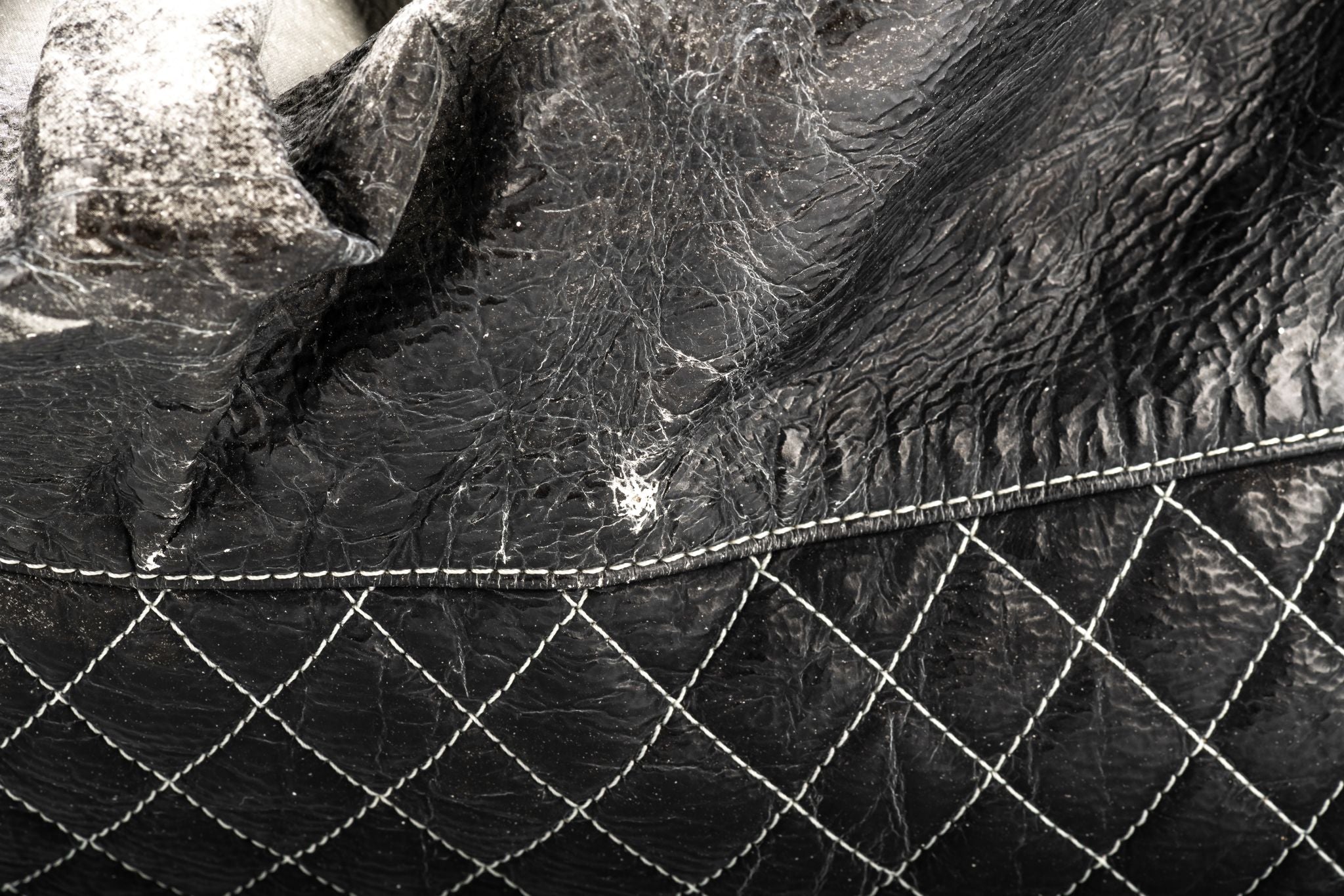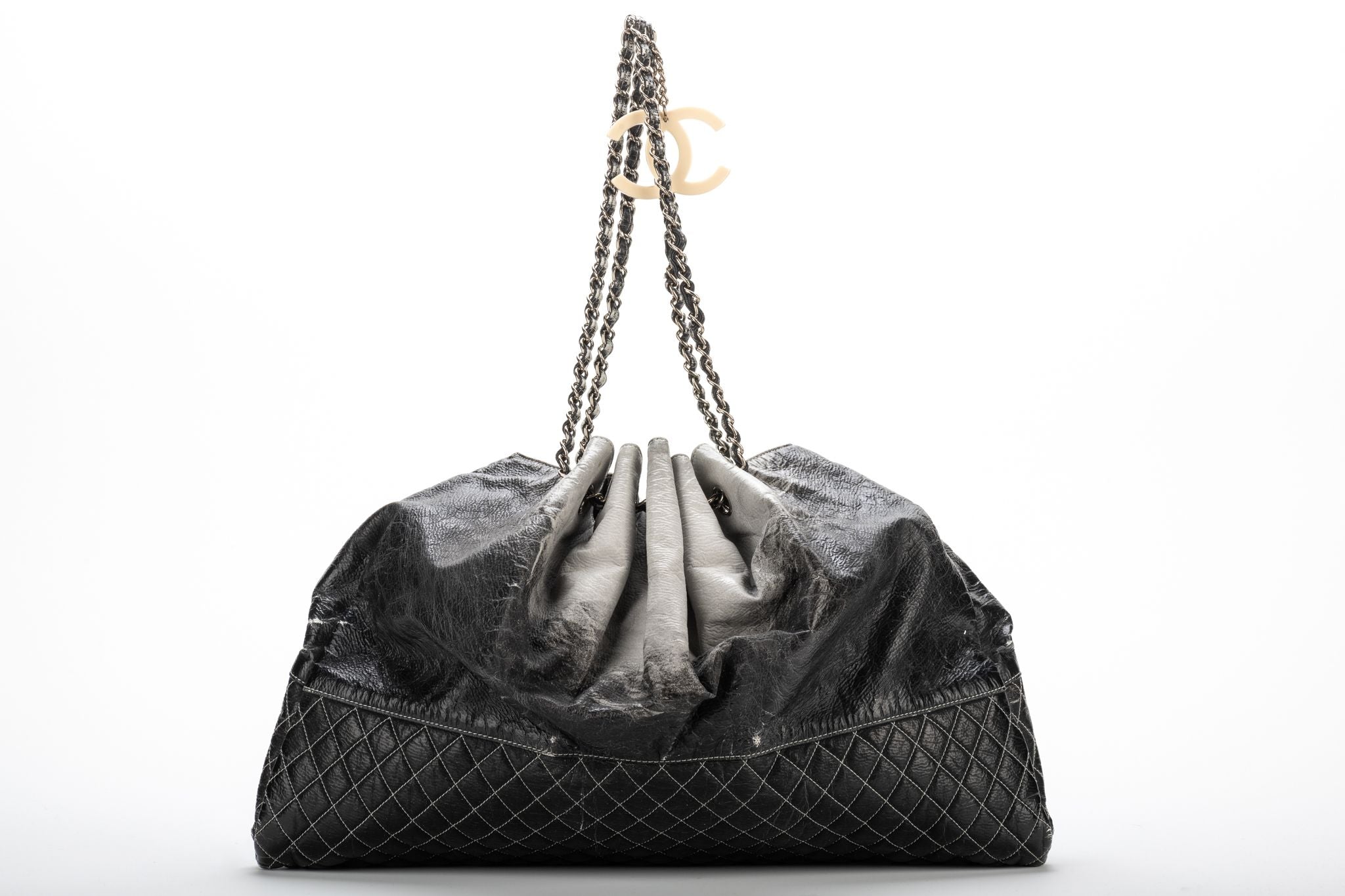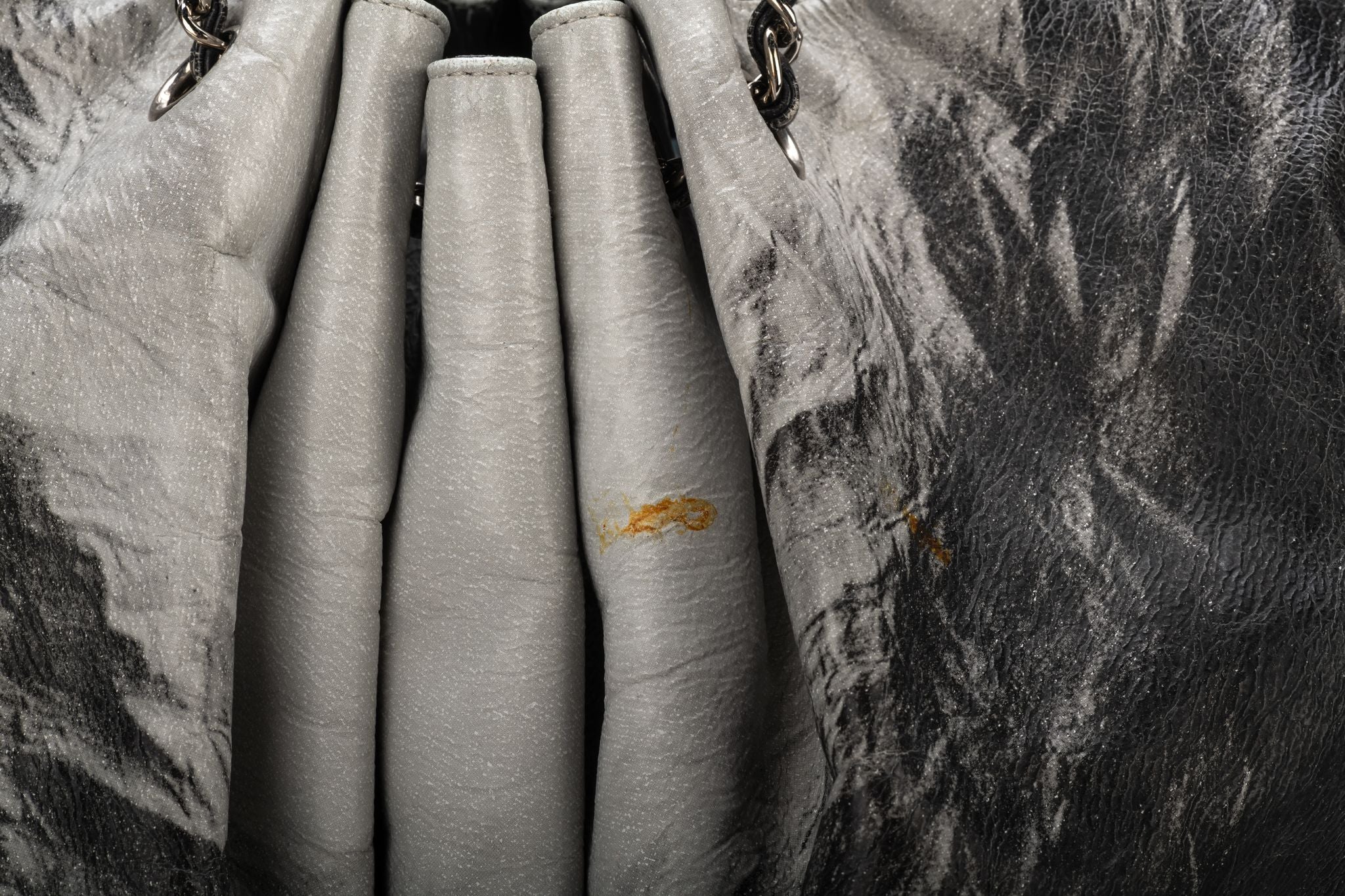 Chanel large shoulder bag in patent leather and silver tone hardware, Degrade' color form grey to black. Shoulder drop 12". Minor scuffs pictured in photos. Comes with hologram, booklet , ID card, no dust cover.