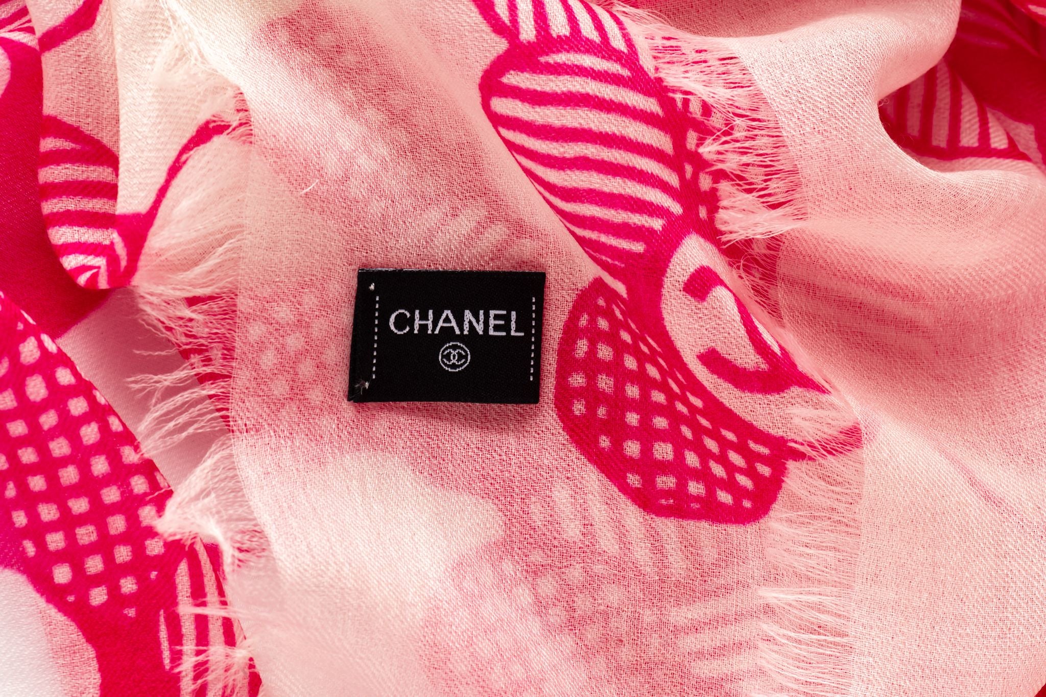 Chanel new camellia cashmere shawl in white and fuchsia . Original care tag.