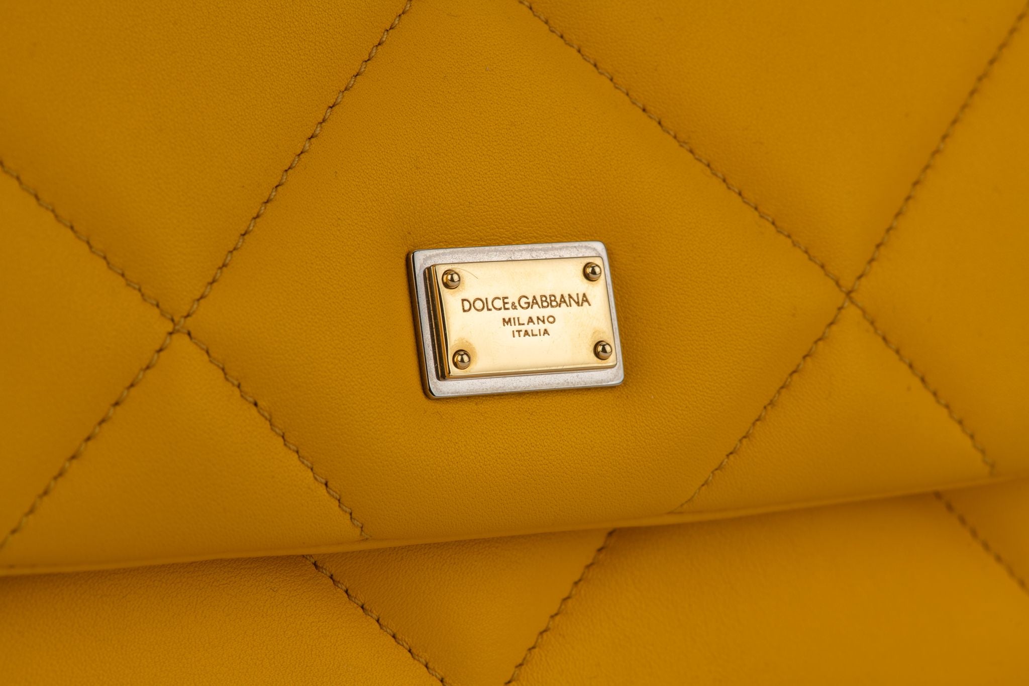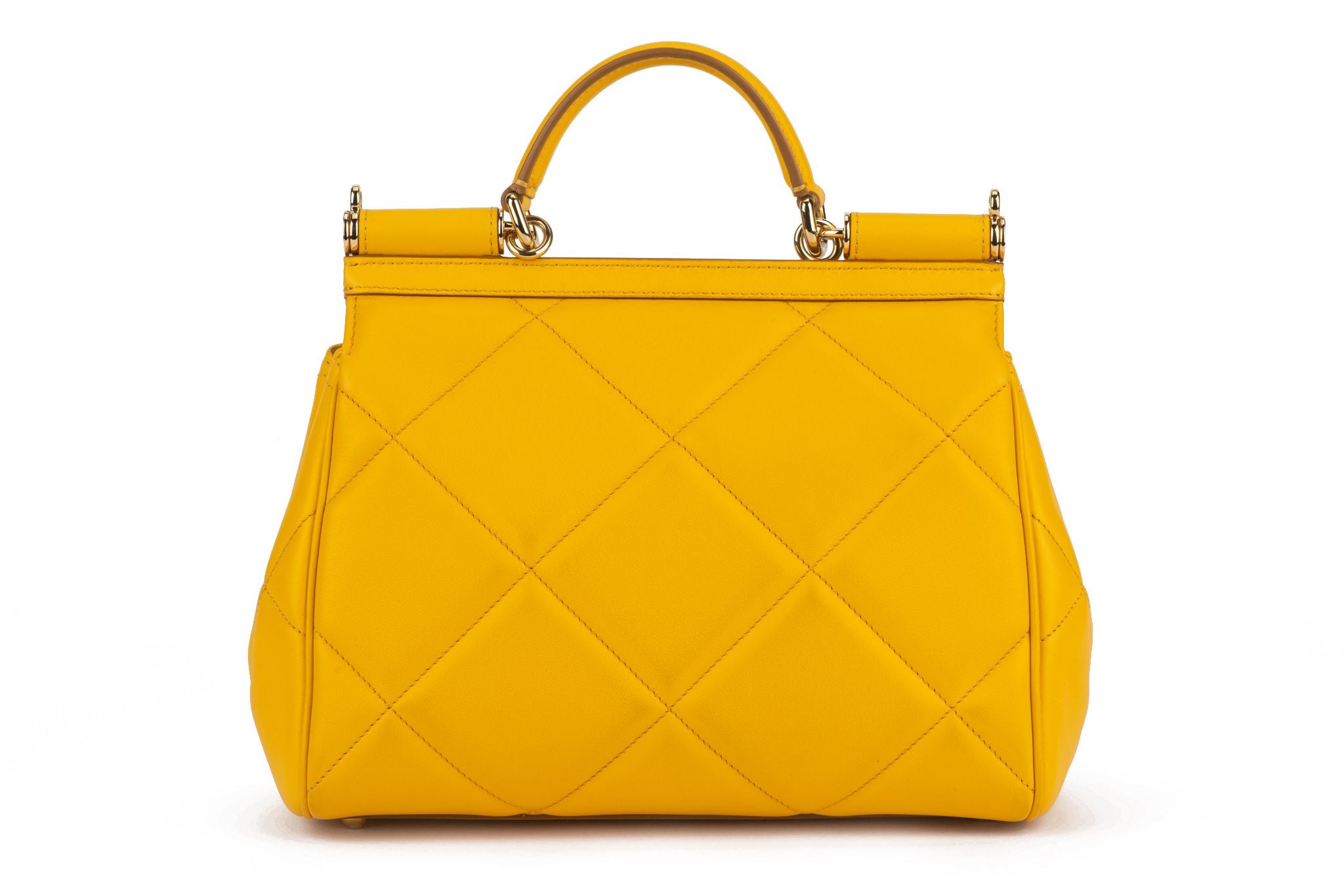 Dolce and Gabbana Sicily Handbag in yellow soleil quilted Aria Calfskin makes your look go from day to night in this casual sleek handbag. Featuring yellow calfskin leather, a front flap with hidden double magnetic fastening, logo tag featuring two metal plating finishes, top handle drop 3.5" and adjustable, detachable strap and one inner pocket. Comes with original dustcover.