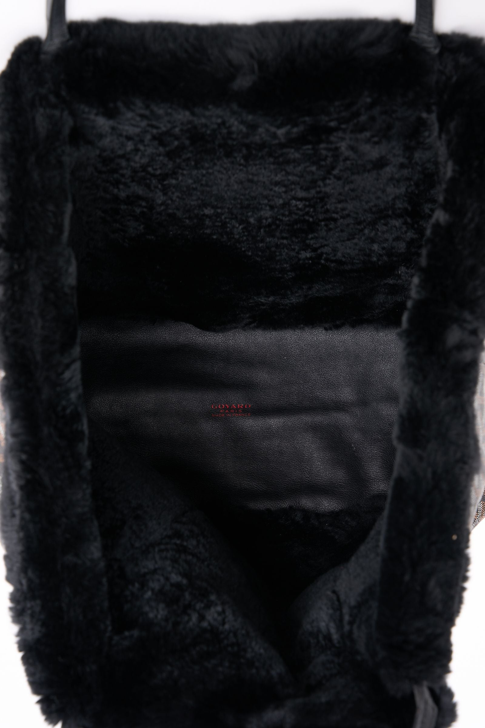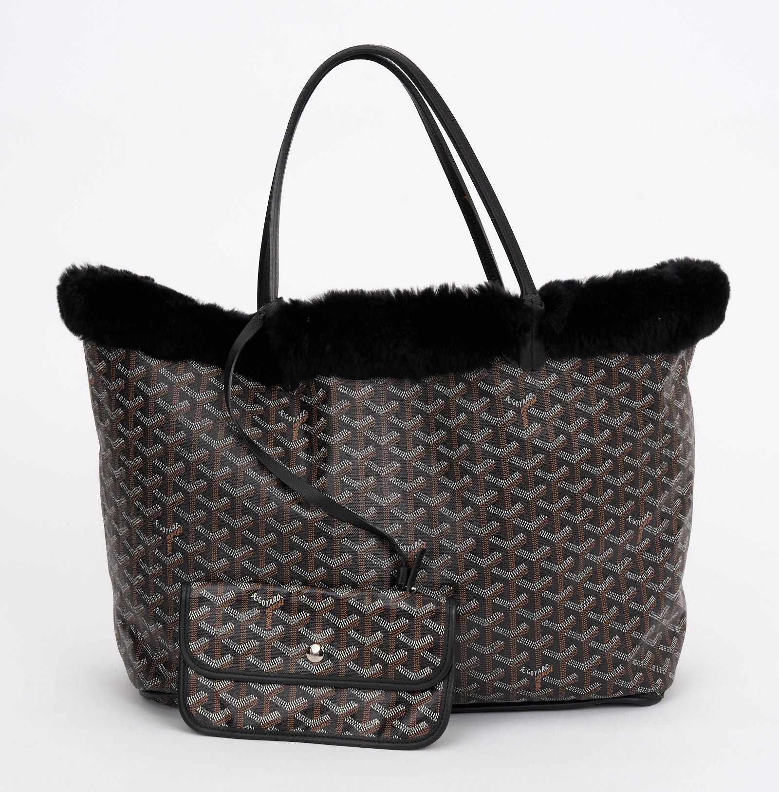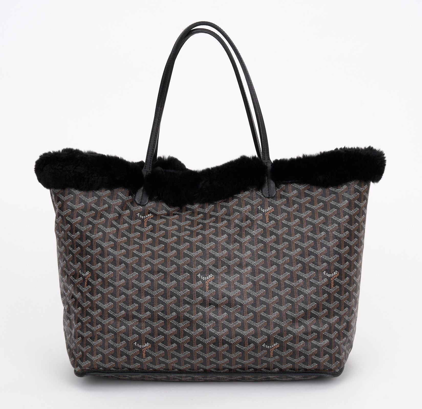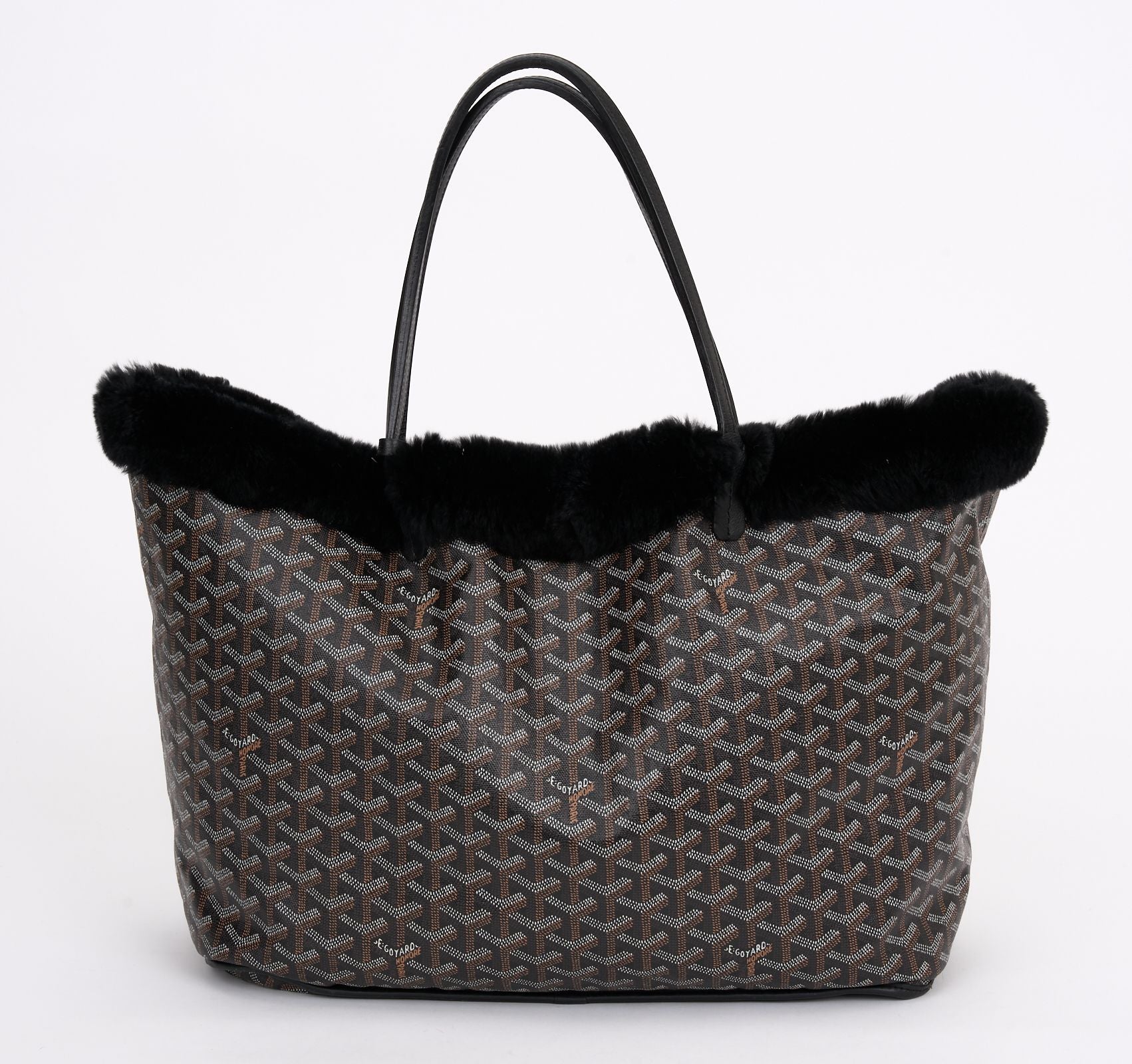 This Limited Edition Goyard Rex Fur large tote is crafted of a traditional Goyard chevron monogram on black coated canvas with fur. The tote features black leather trim and top handles. The top opens to a black fur interior with a removable pouch. Handle drop 7". Opening 20". Comes with generic dust cover.