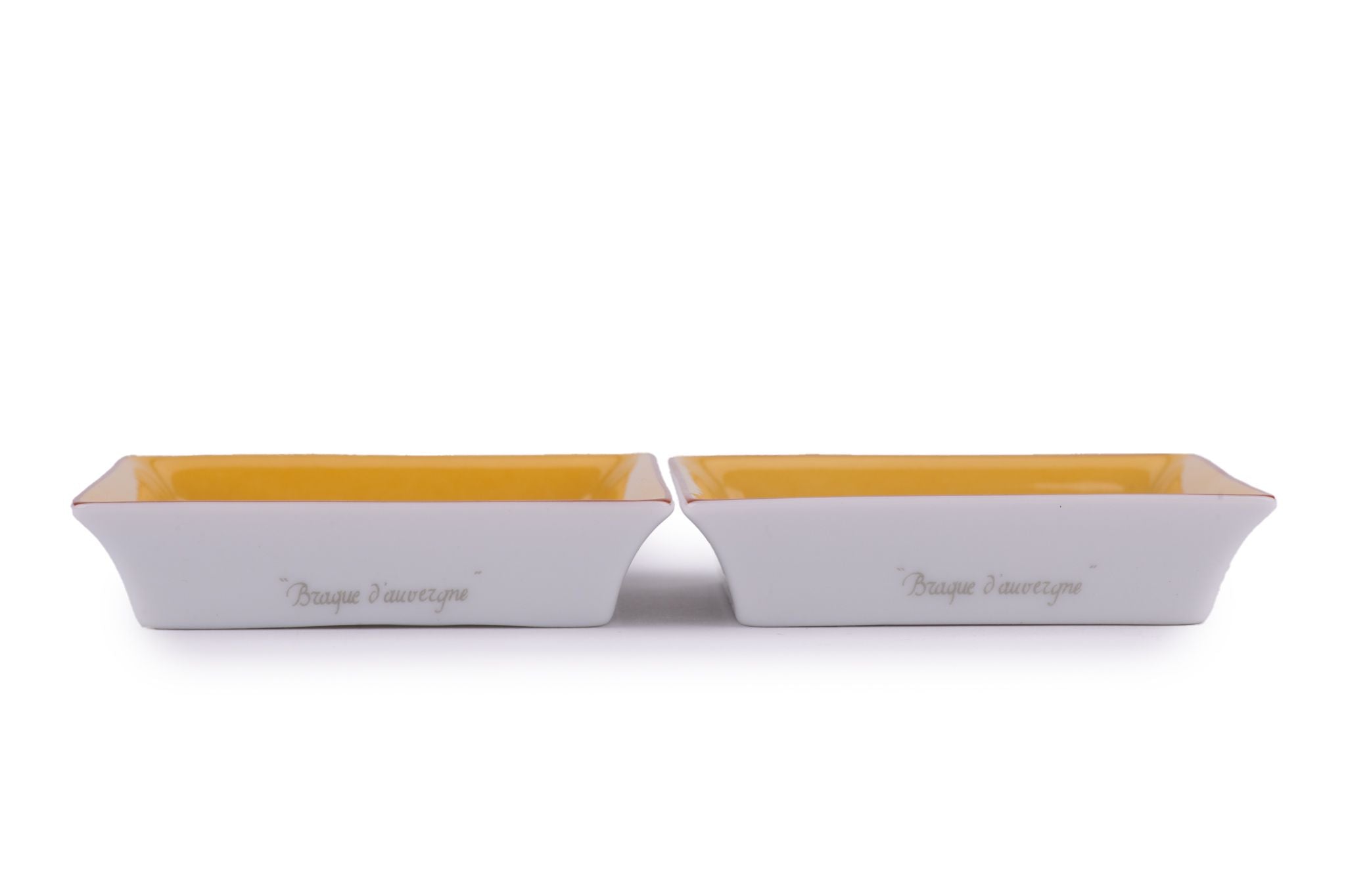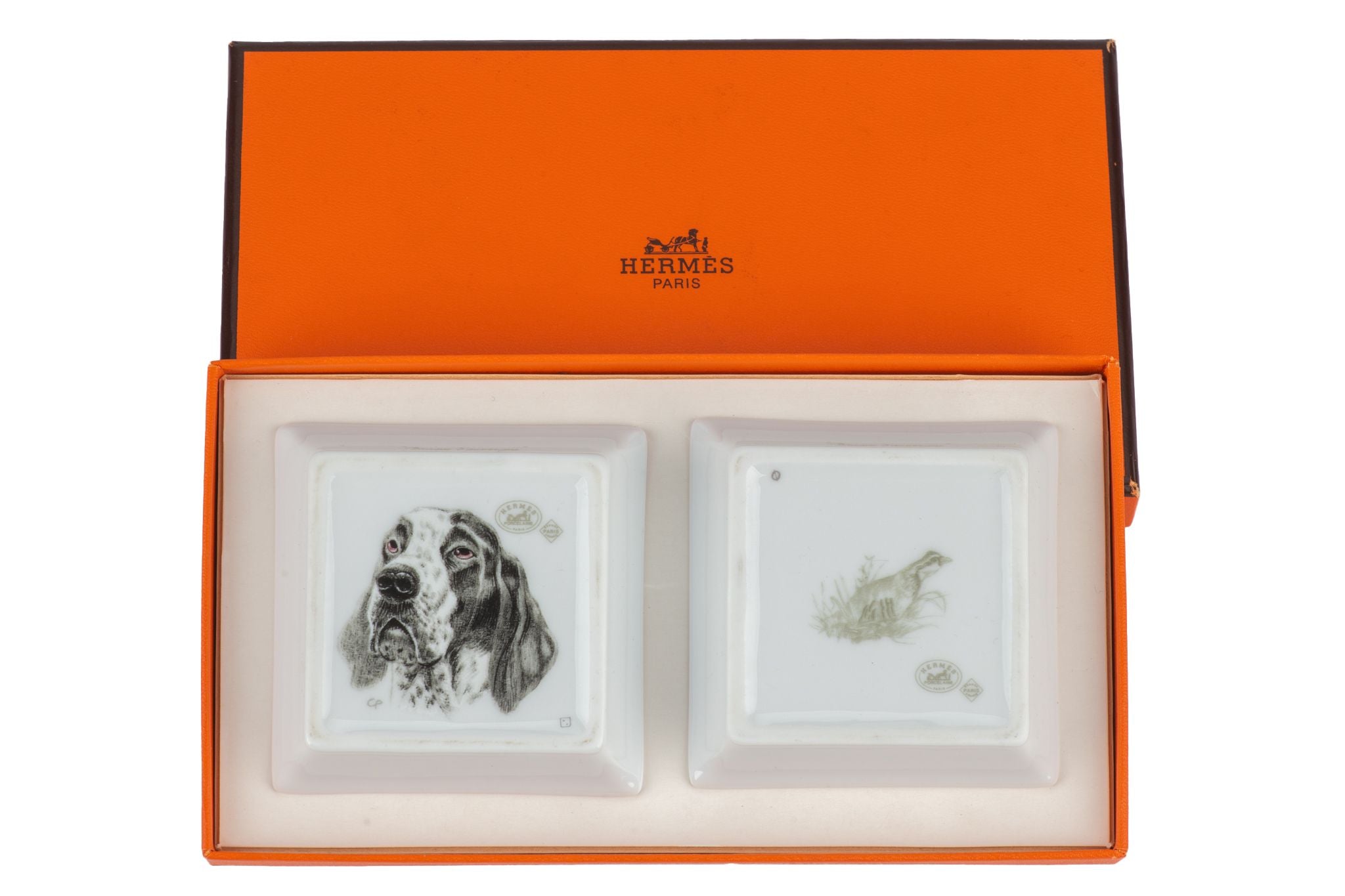 The Hermès vintage set of "Braque d'auvergne" mini ashtrays are a collectable set in great condition. Excellent condition. Comes with original box.