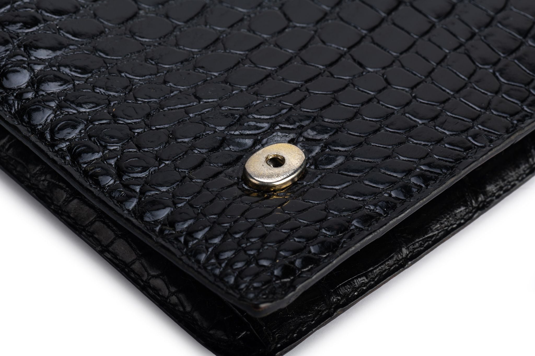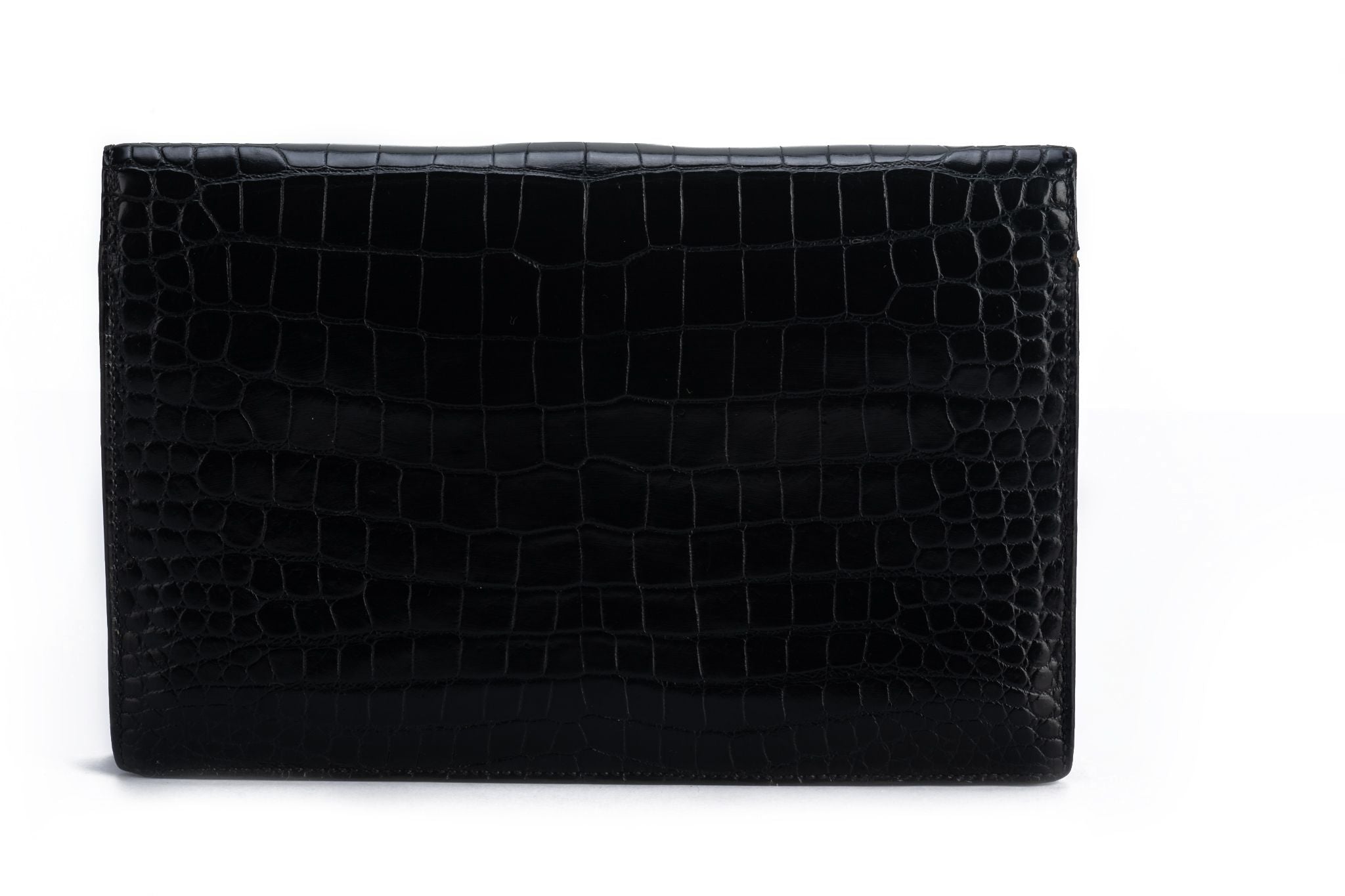 Hermes vintage black crocodile clutch with gold tone hardware. Pre stamp production, comes with original dust cover.