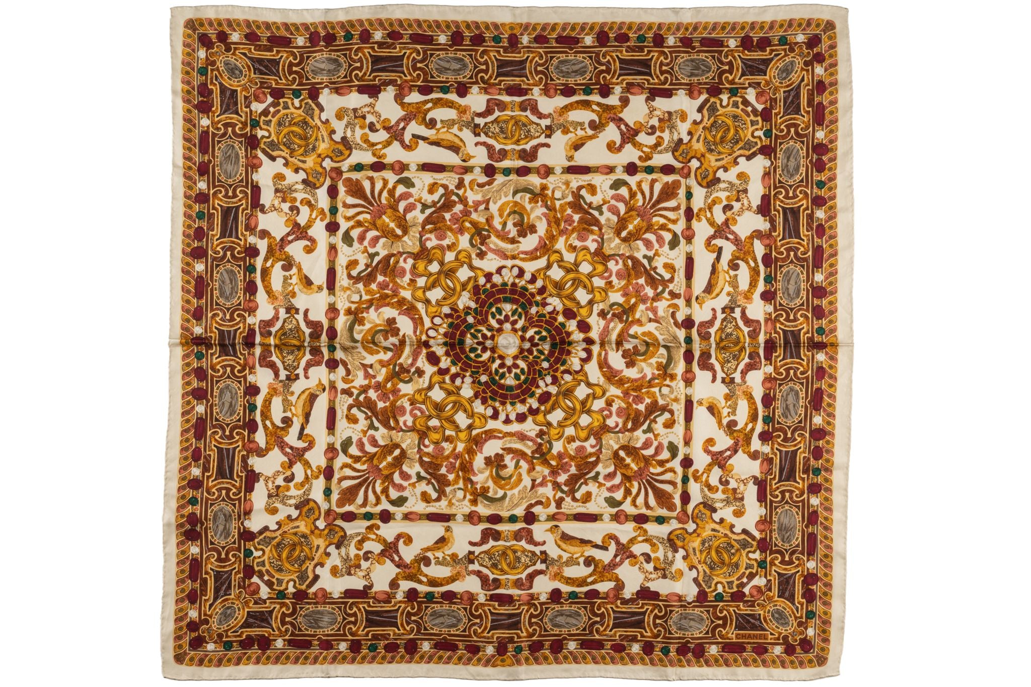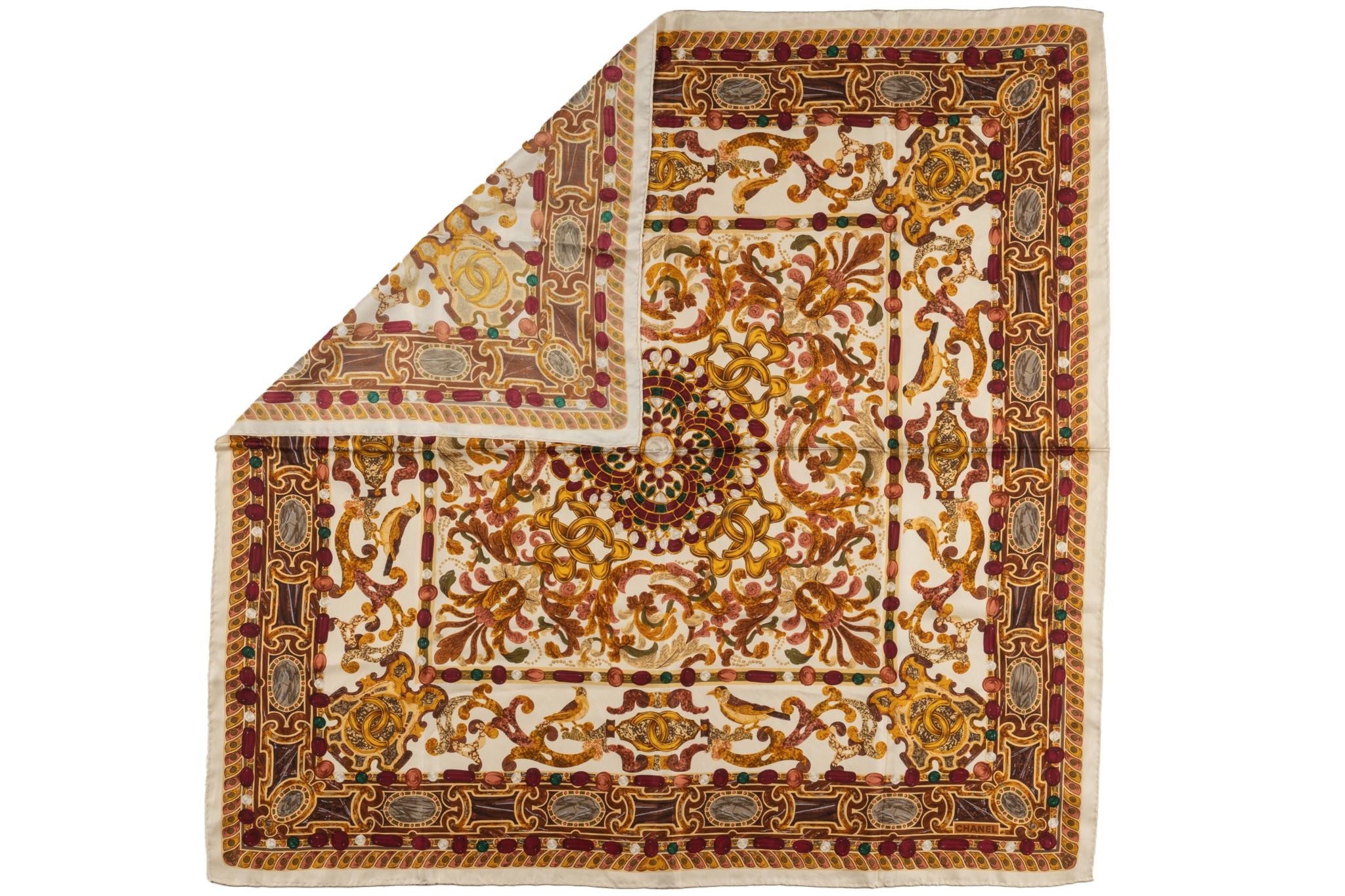 Chanel "Bijoux" 100% silk scarf in cream, brown, and naturals. Vintage from the 80s. Excellent condition.