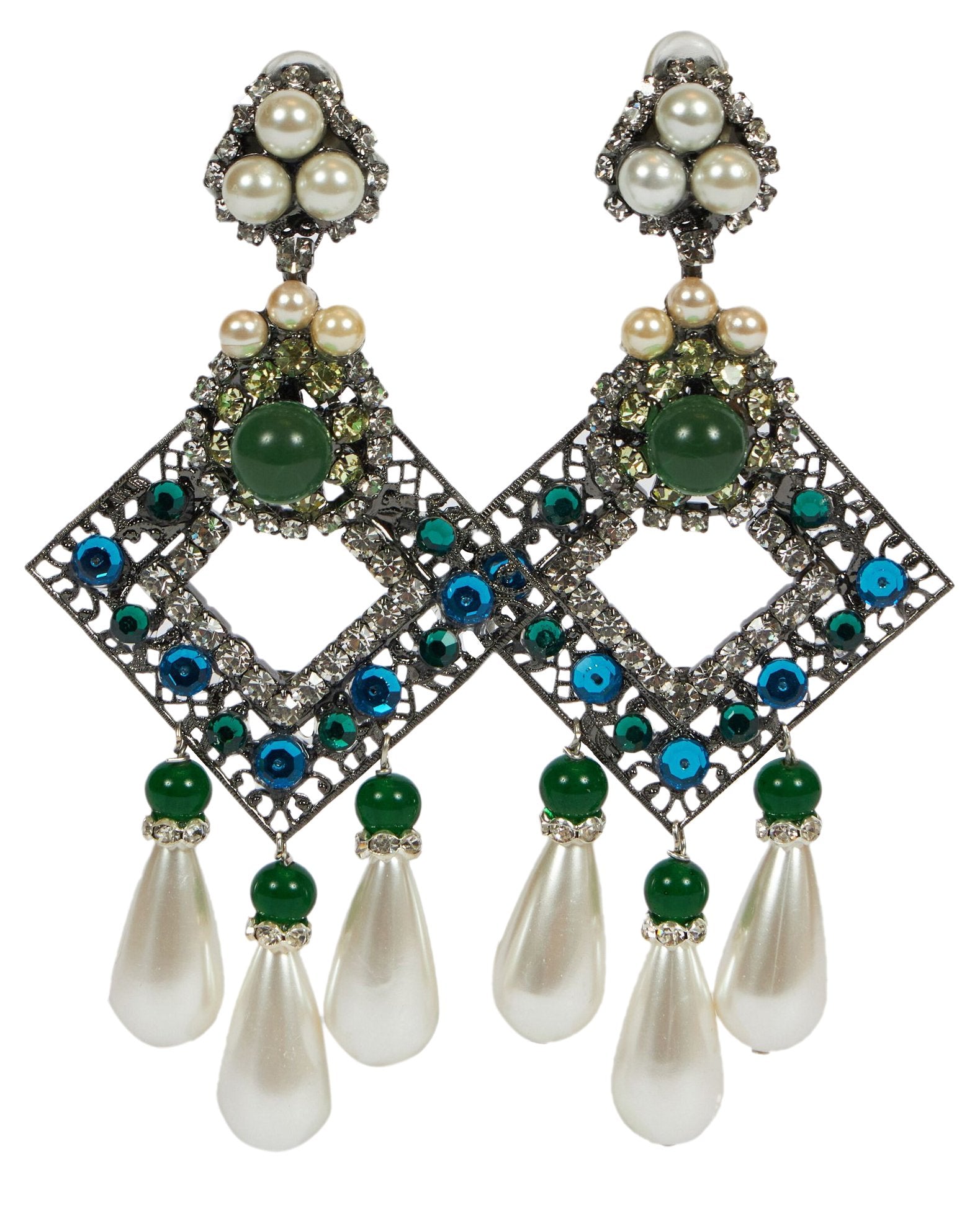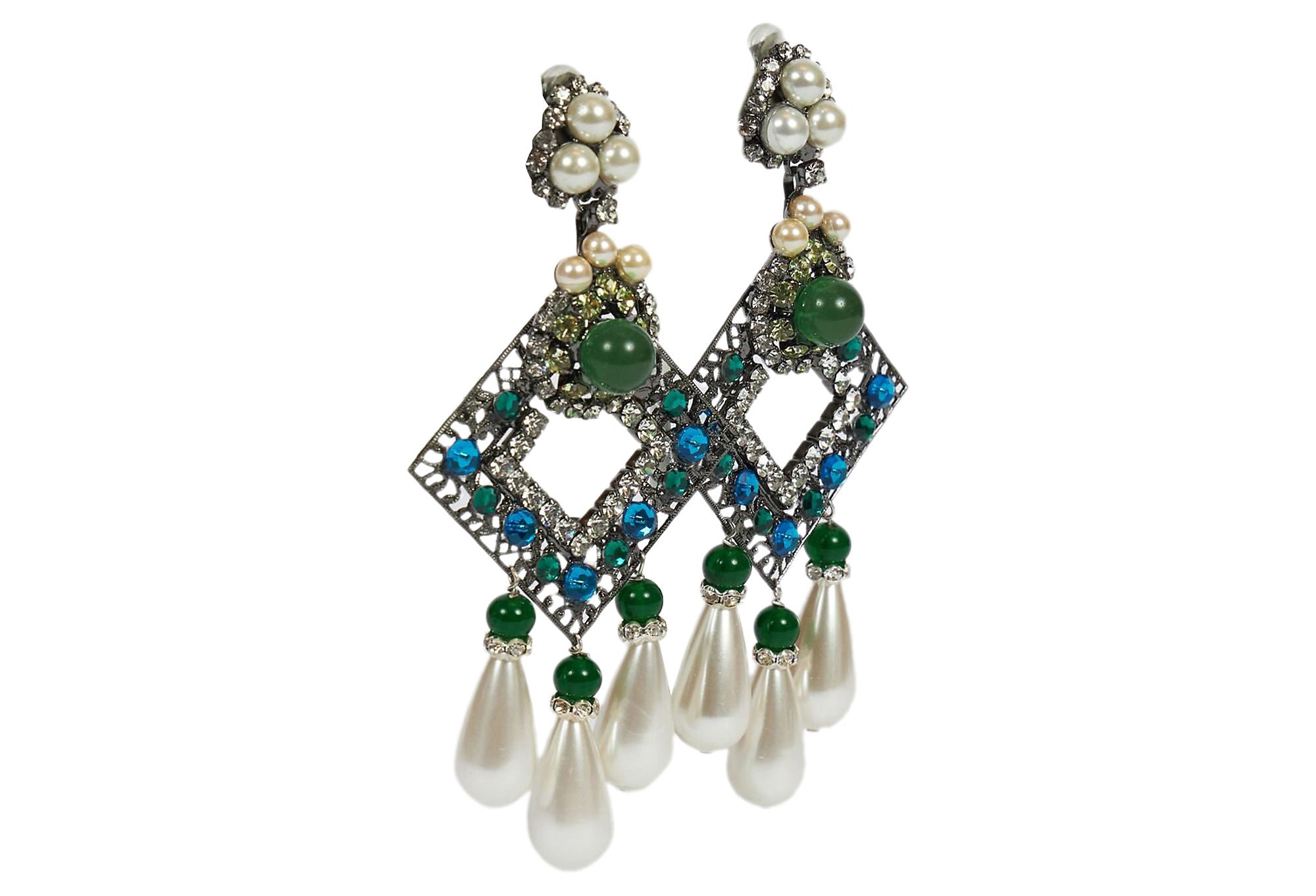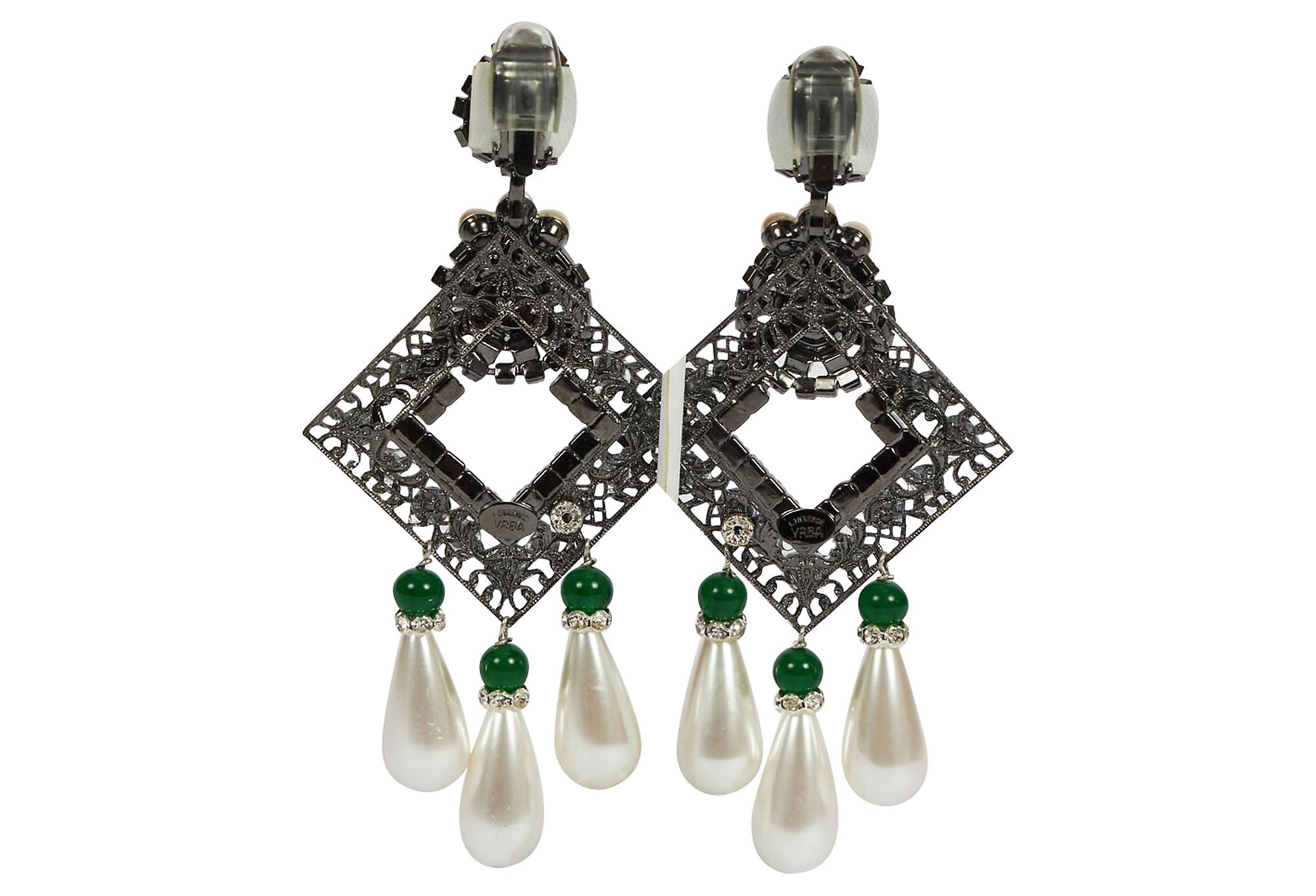 Lawrence Vrba one of a kind chandelier emerald and pearl clip earrings. Come with velvet pouch.