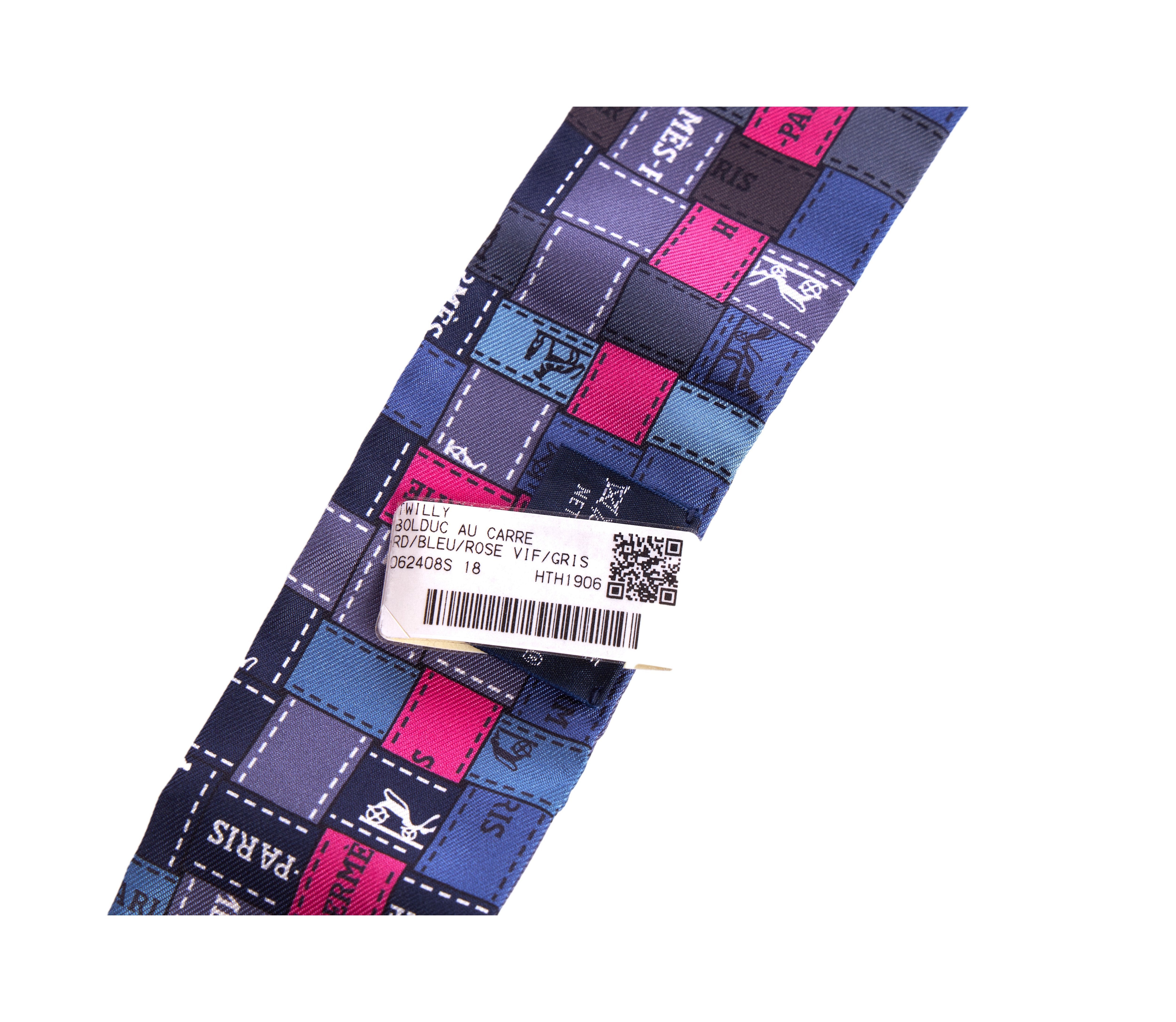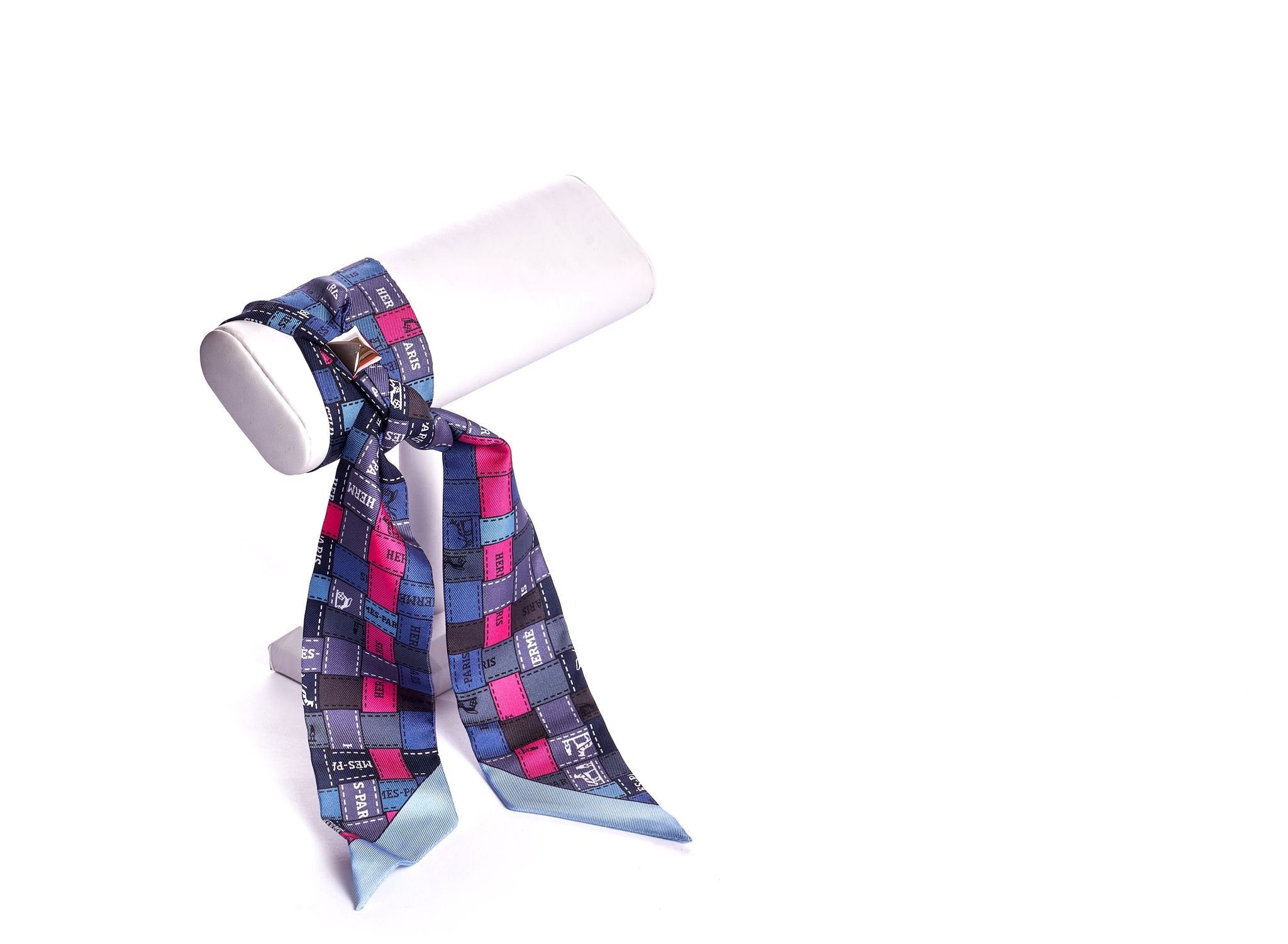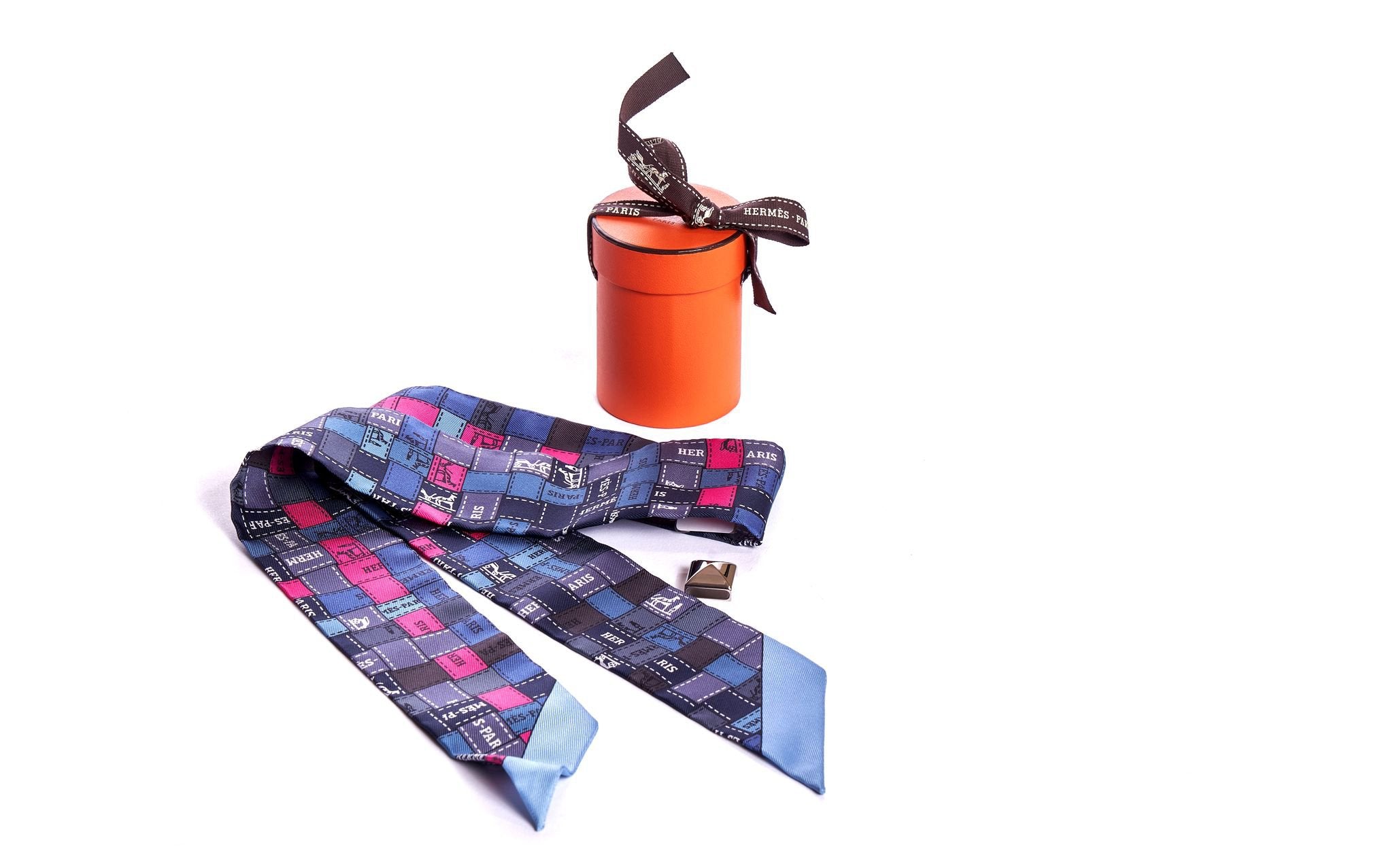 Hermès collectible bolduc twilly silk scarf with palladium diamond slide in purple and blue. Includes original box.