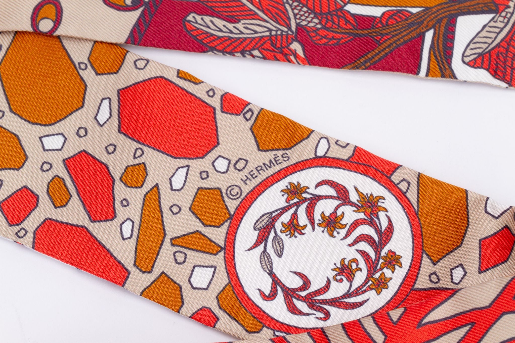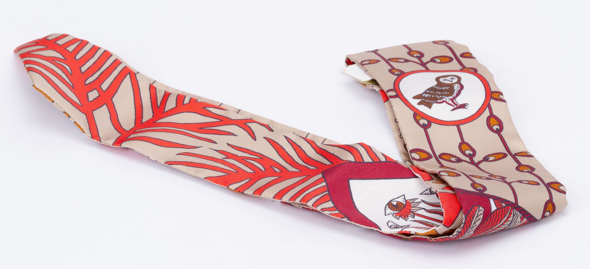 New Hermès La Danse Des Amazones Twilly. The scarf is made out of silk and the main color is beige and coral. The print shows animals like an owl. The piece comes with a scarf ring, original box and ribbon.