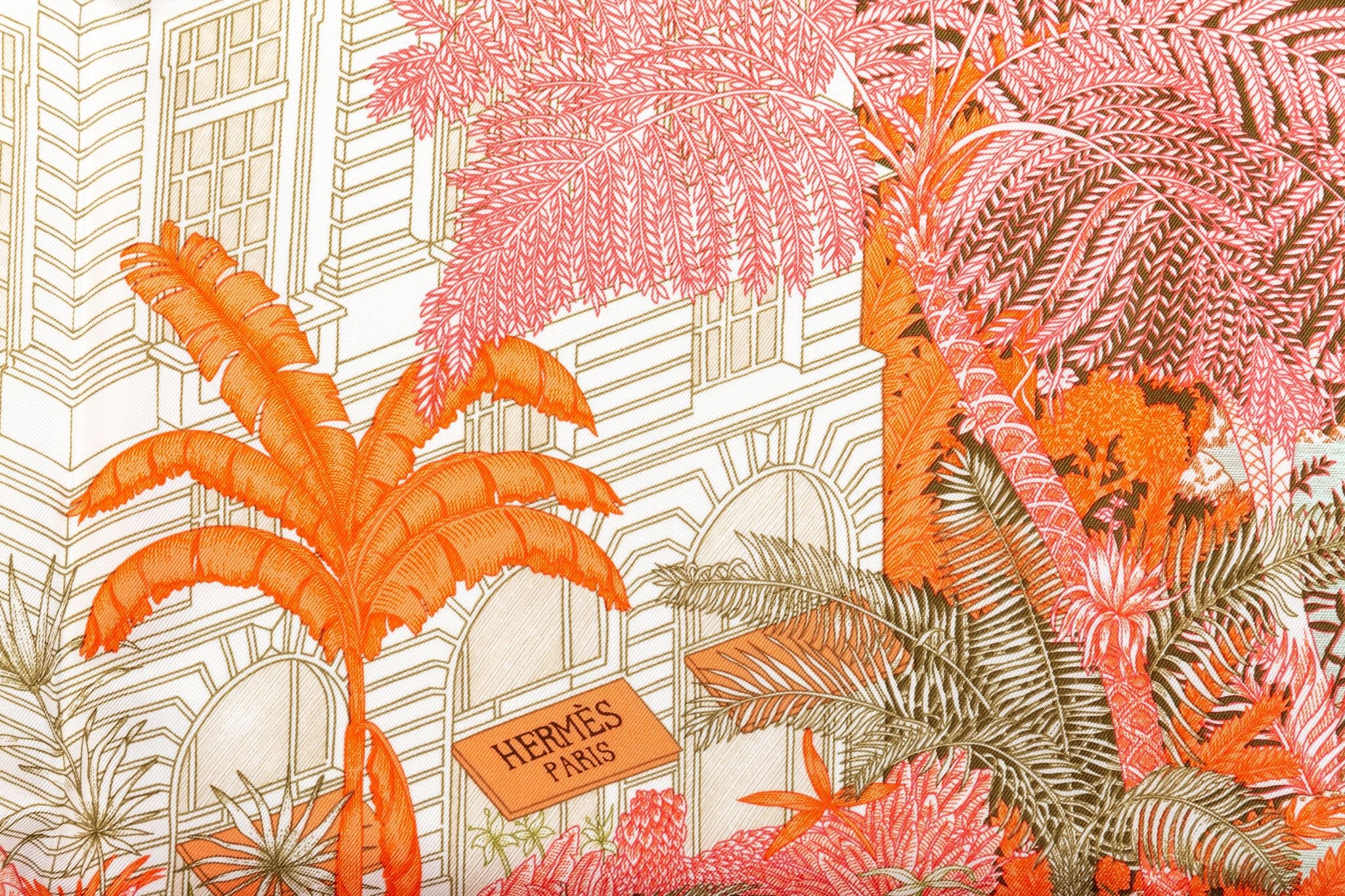 Hermès collectible tropical garden orange and pink silk scarf. Hand-rolled edges. New in box.