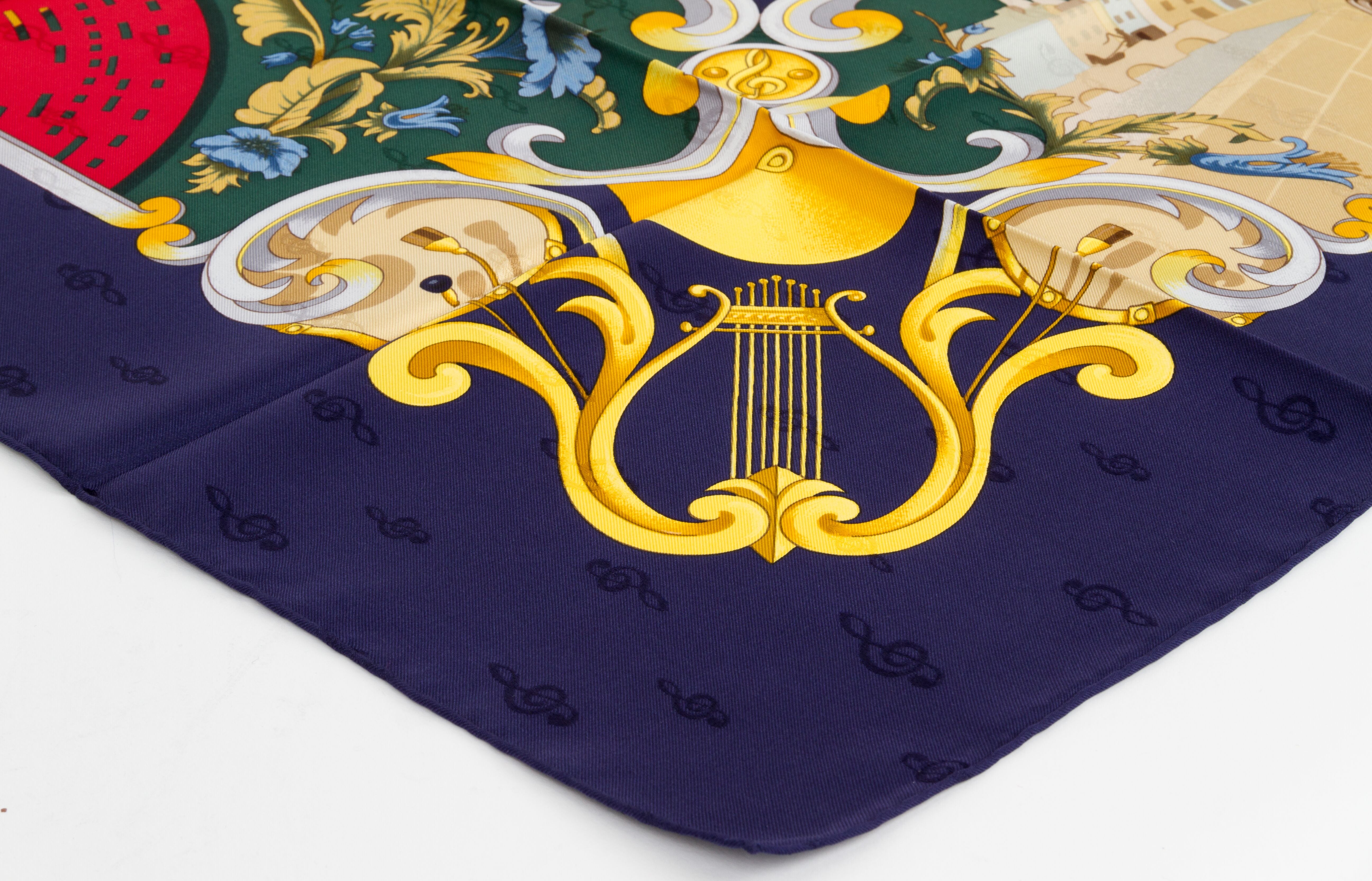 Hermès "Orgauphone" red and blue silk twill scarf. Textured notes fabric. Hand-rolled edges. Excellent condition.