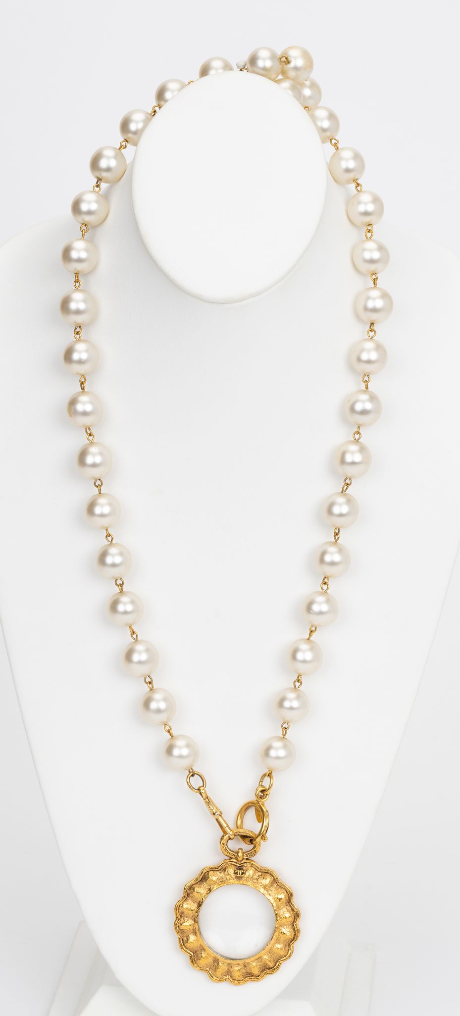 Chanel authentic mid 80s pearl necklace with magnifier pendant. Pearl are made of poured glass "gripoix" with pearls coating. Minor scuffs on few of them. The pendant is dipped in 24 kt gold and works perfectly as a magnifier lens. Pendant D 2". Comes with original box or cover.