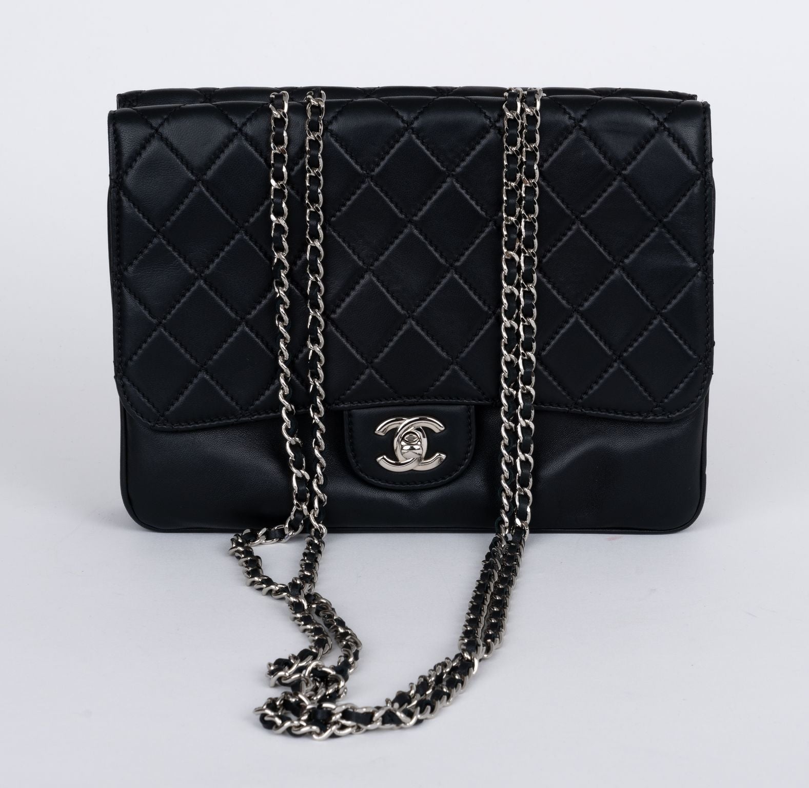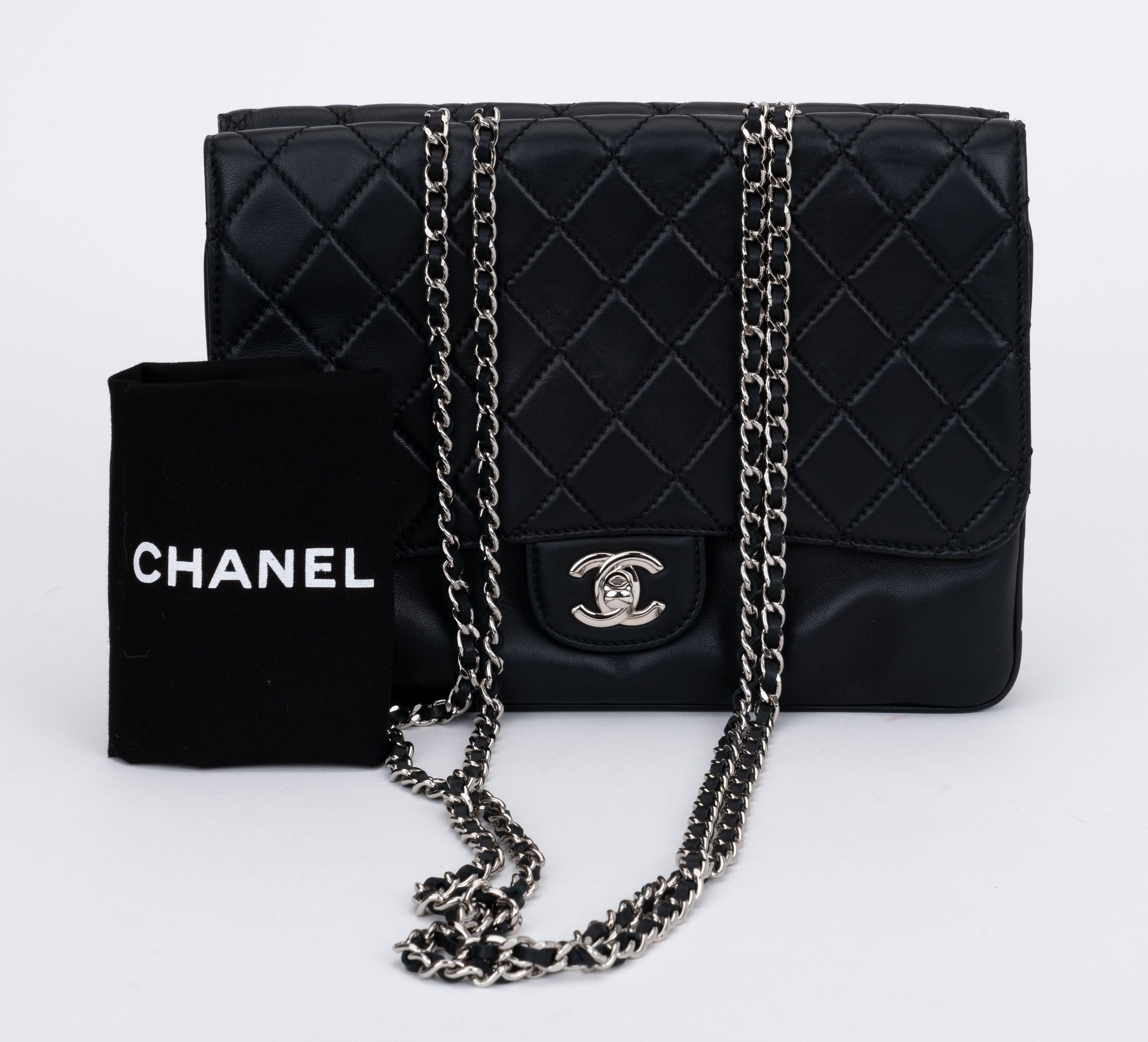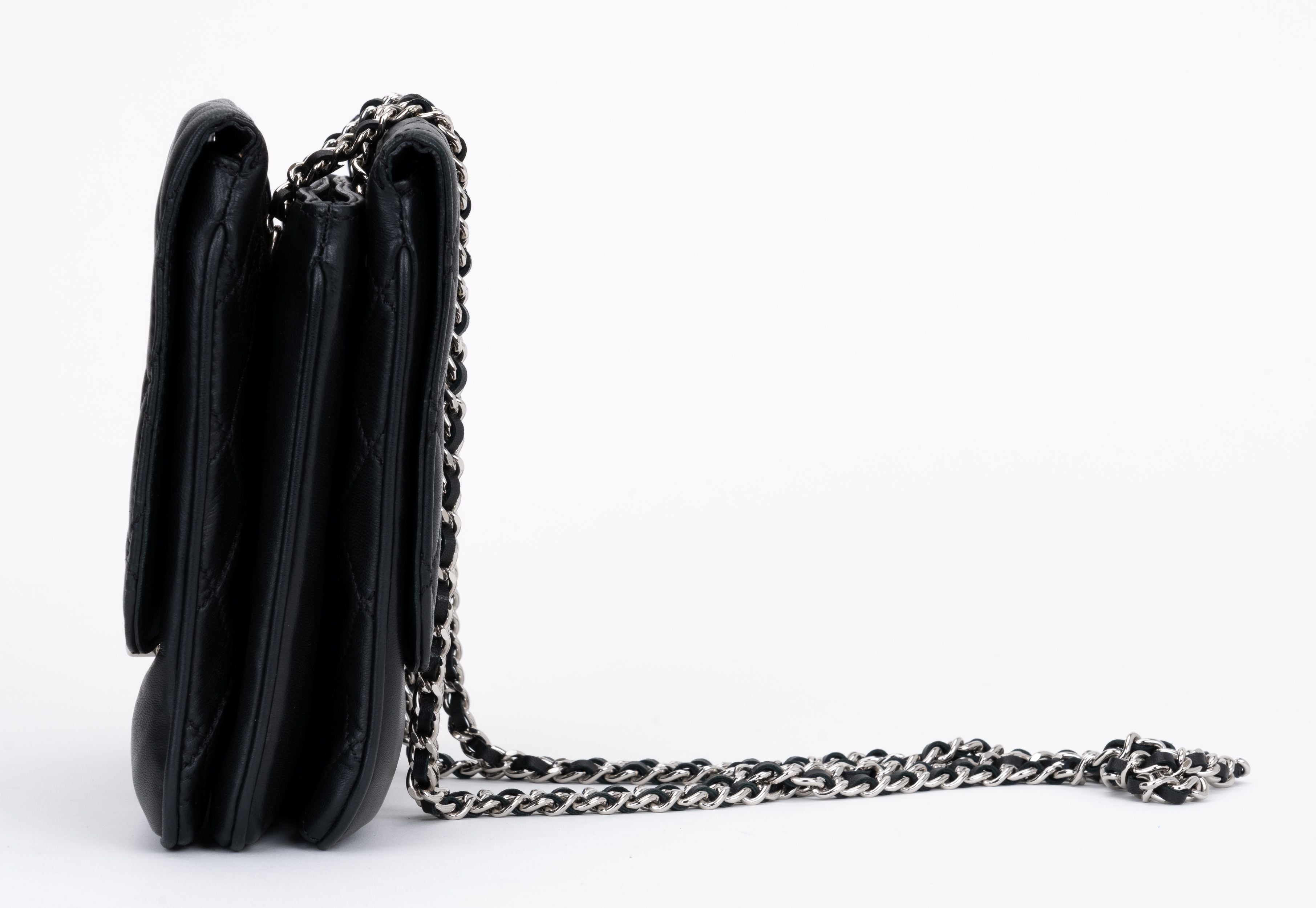 Chanel double sided butter lambskin quilted leather bag with silver tone hardware. Three separate compartments, 2 with turn locks and one with zipper. Lined in black silk. Shoulder drop 18". No hologram, authenticity certificate, original dust cover.
