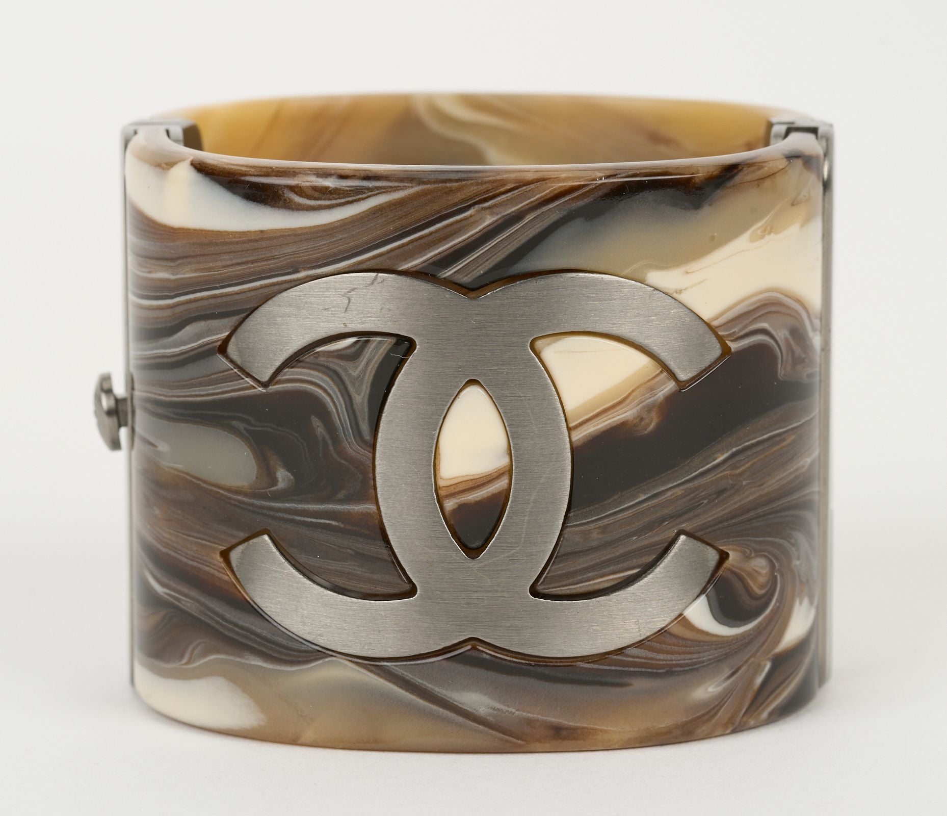 This Chanel Brown Printed Marble Resin Cuff features an engraved CC center logo and a marble brown tone finish. Inner Circumference - 6.5". Comes with velvet pouch.