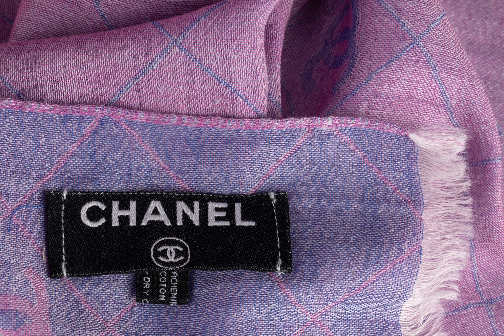Chanel Cashmere Shawl in purple. The pattern features a diamond print and small CC logos. 54% cashemre, 46% cotton. Machine trimmed edges.