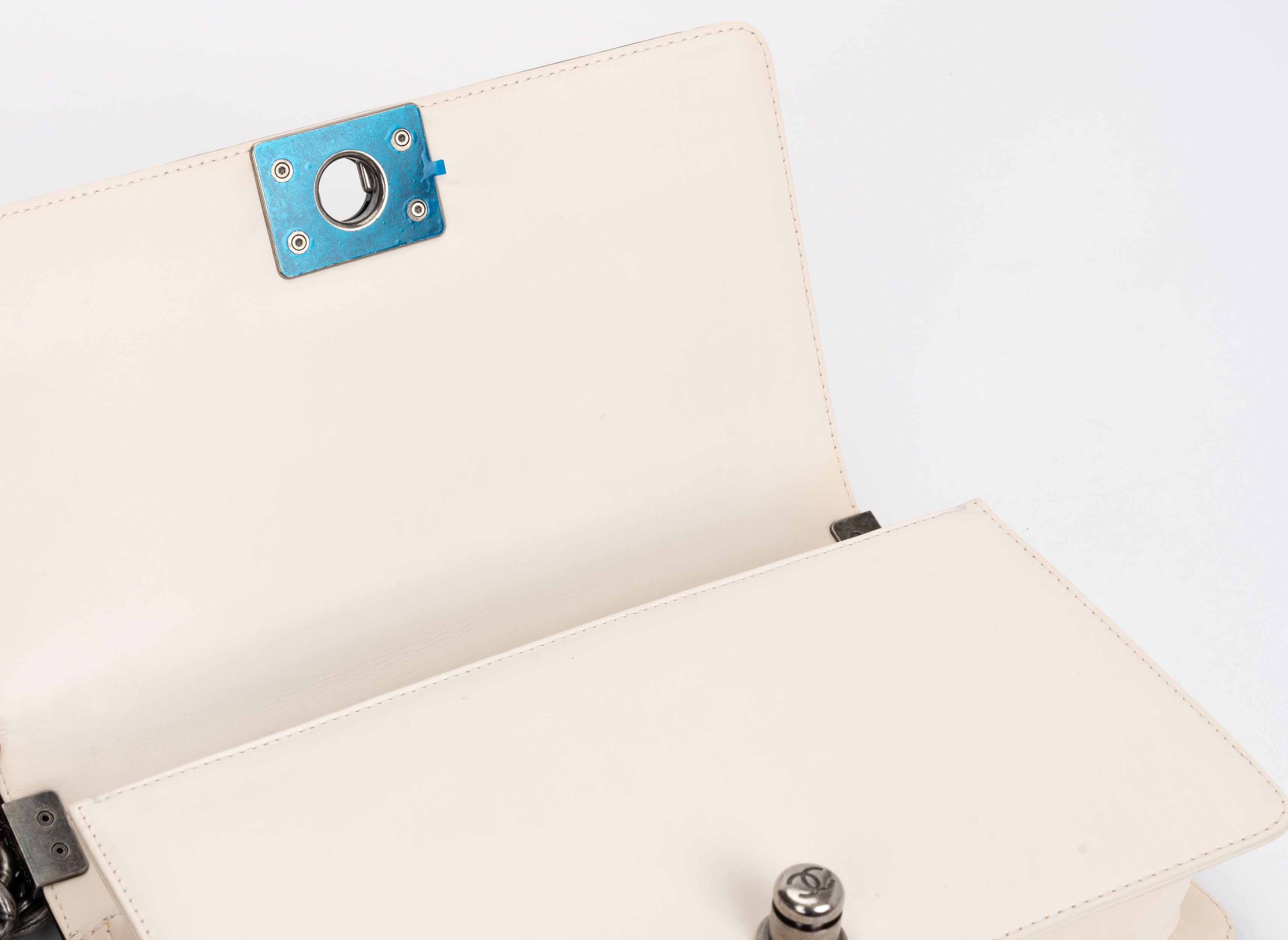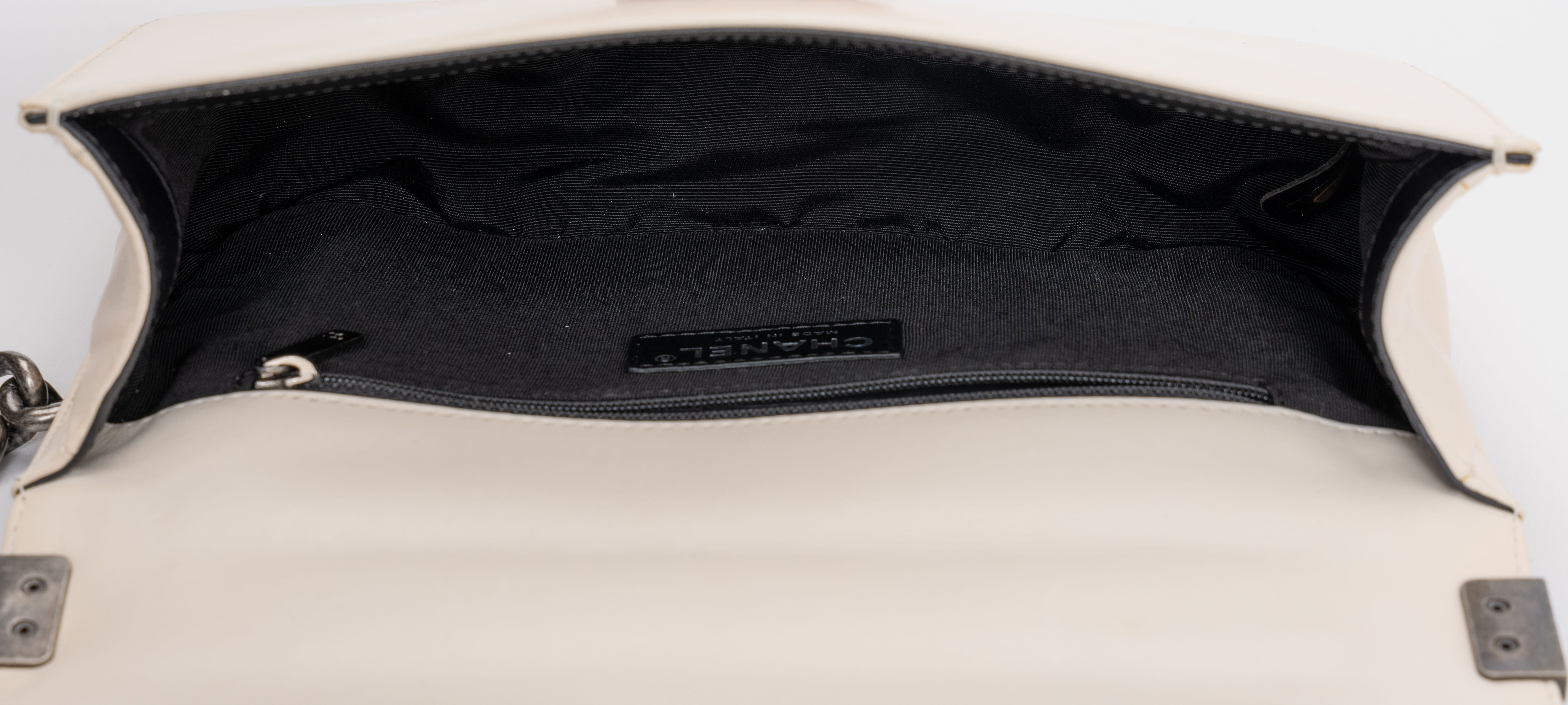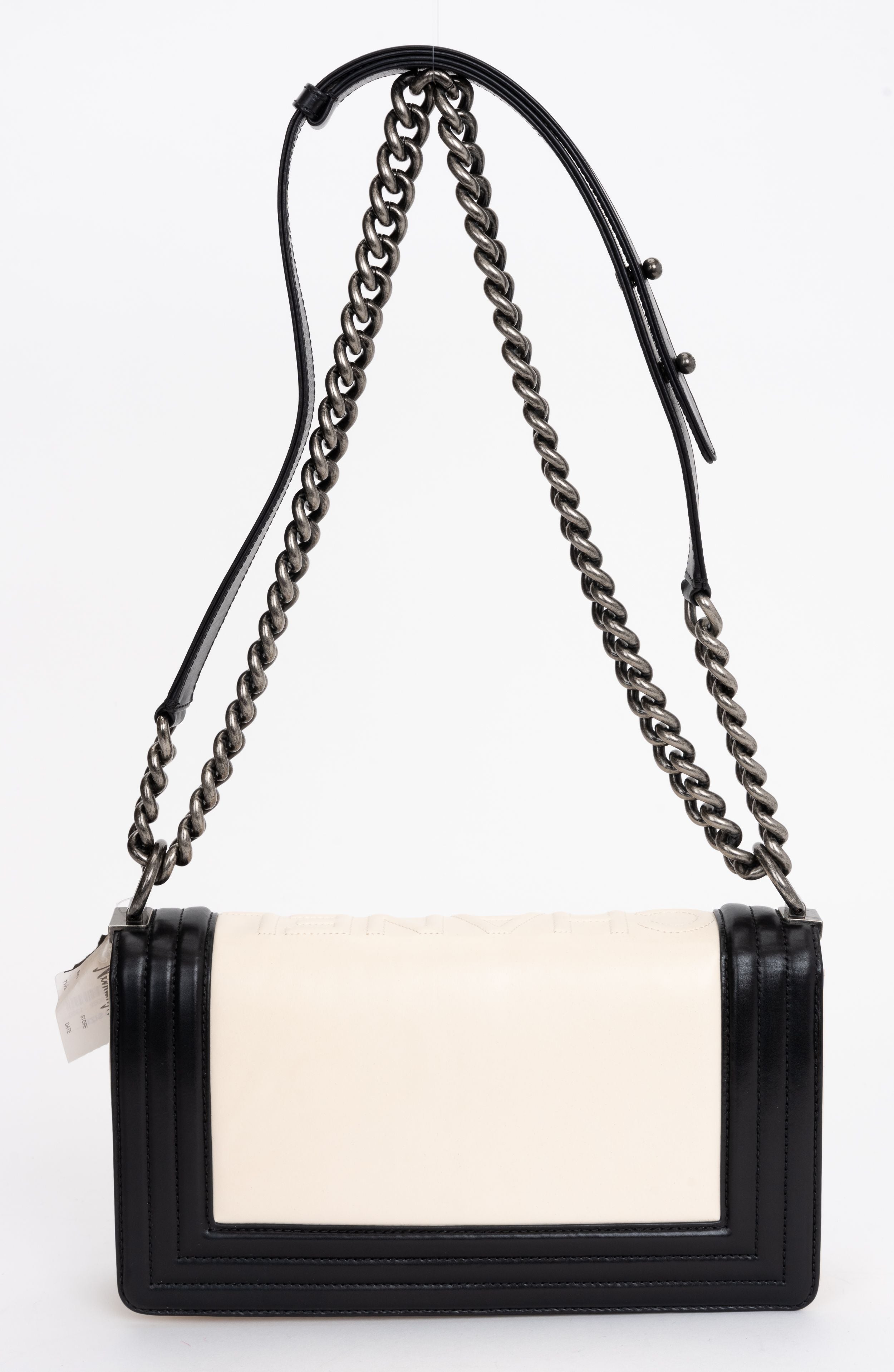 The Chanel Glazed Calfskin Boy Flap bag features smooth leather in Black and White. The aged silver chain shoulder strap makes the bag versatile. Includes patch pocket in the interior. The shoulder drop 19". From Collection 15. Comes with hologram, id card, original tag and dust cover. Brand new in unused condition.