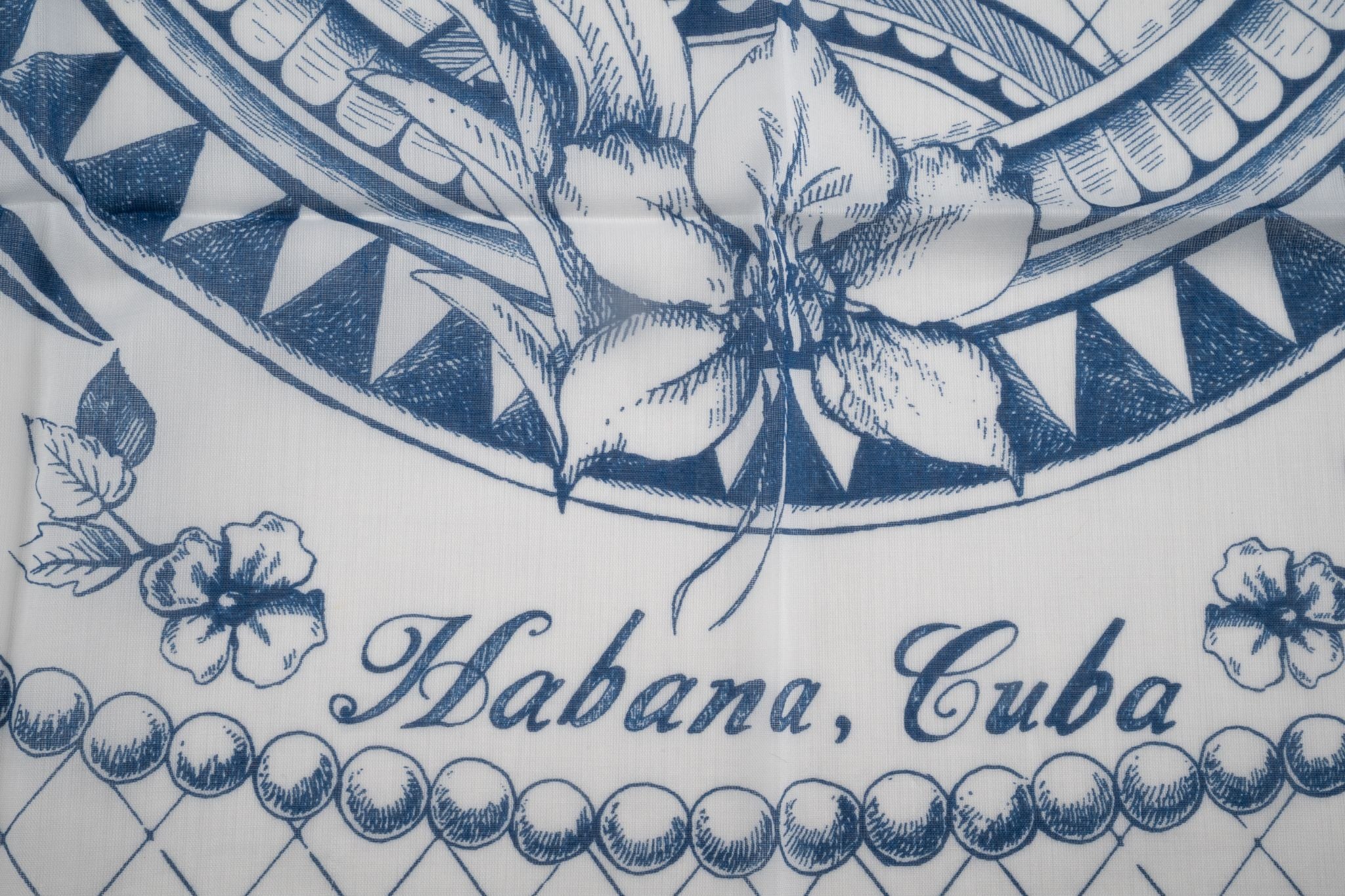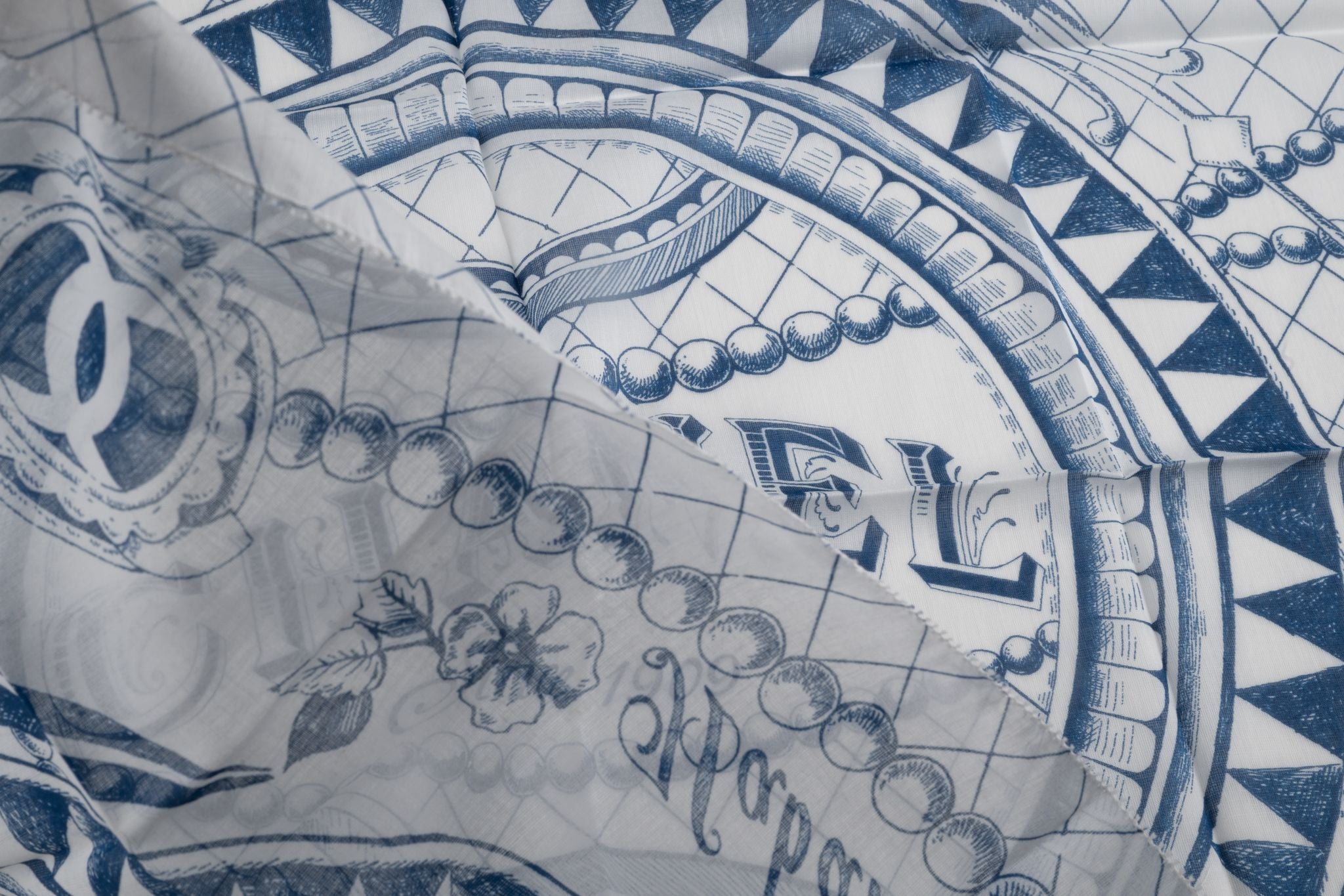 This Chanel Havana Cuba Scarf in White and Blue. The bold design features blue writing on a white background. Brand new in unused condition.