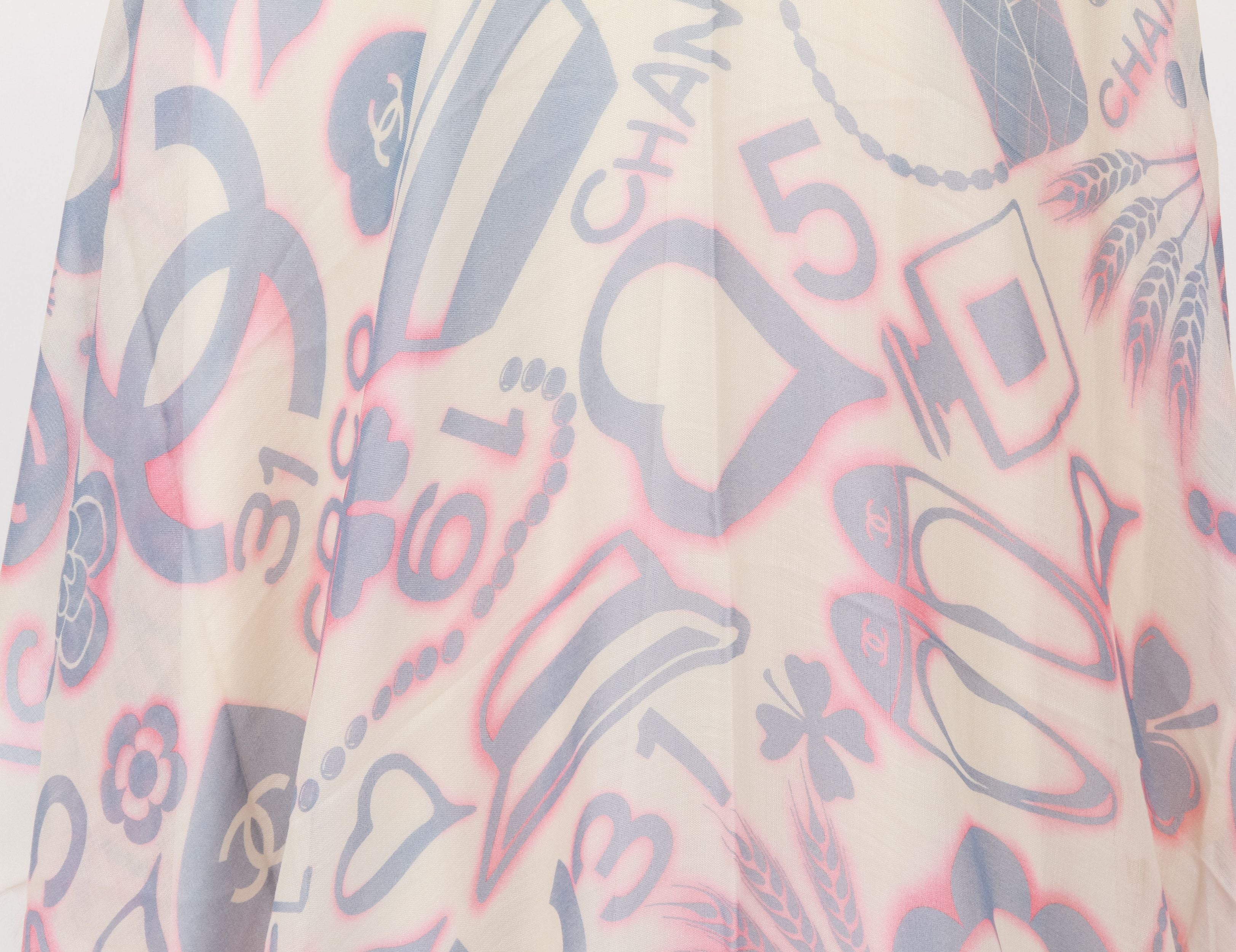 Chanel brand new 65% cashmere 35% silk white, celeste and pink shawl. Iconic symbols design. New in unworn condition.