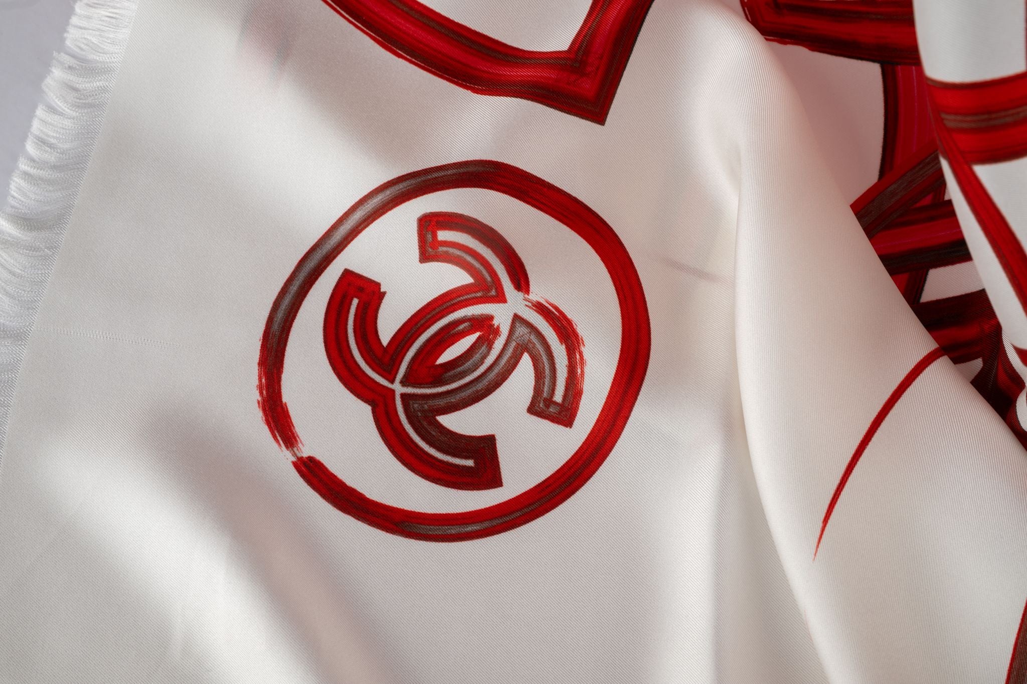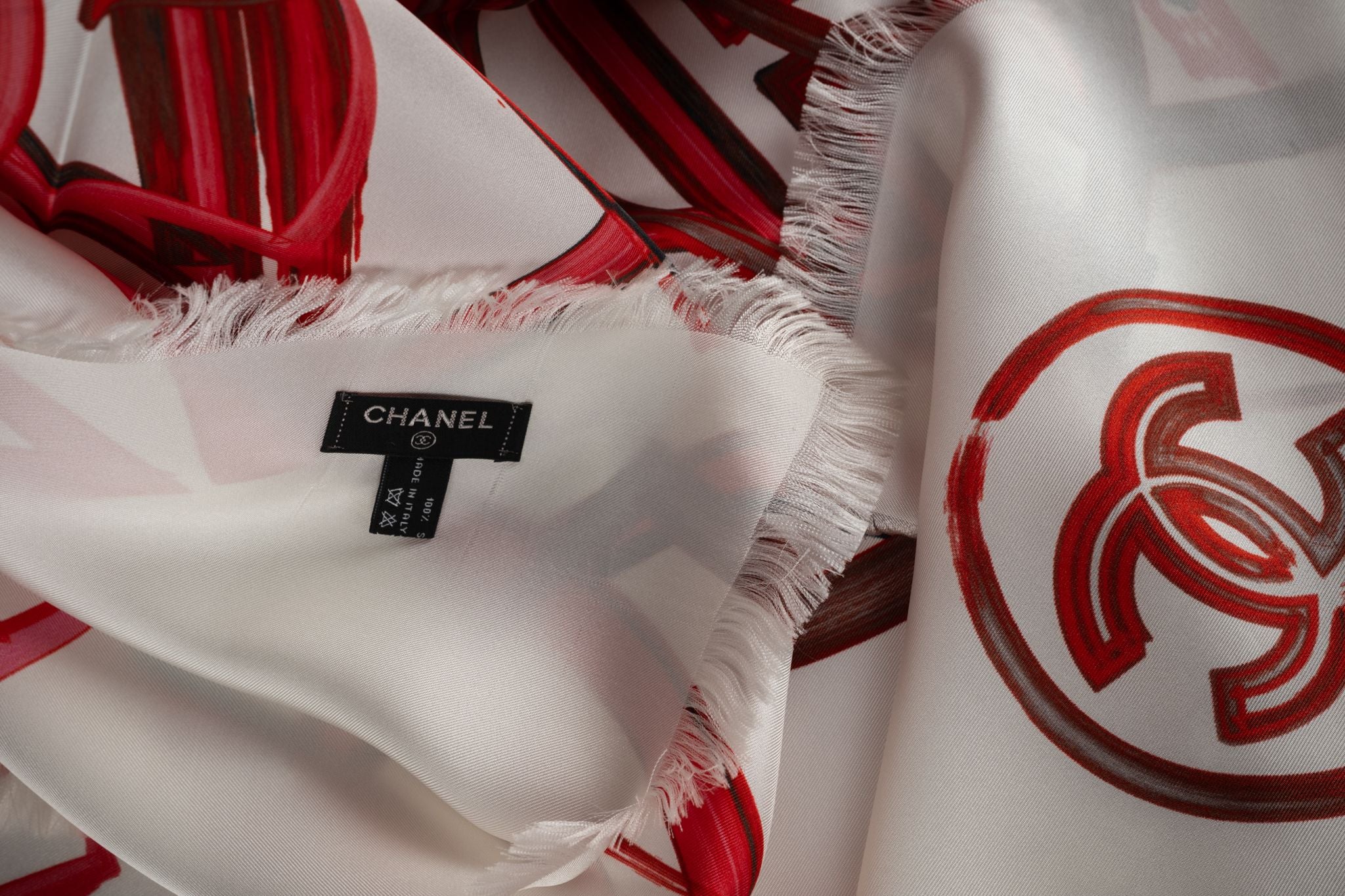 The Chanel Graffiti Silk Wrap/Shawl Scarf is crafted from 100% silk in red and white. Oversize in brand new condition.