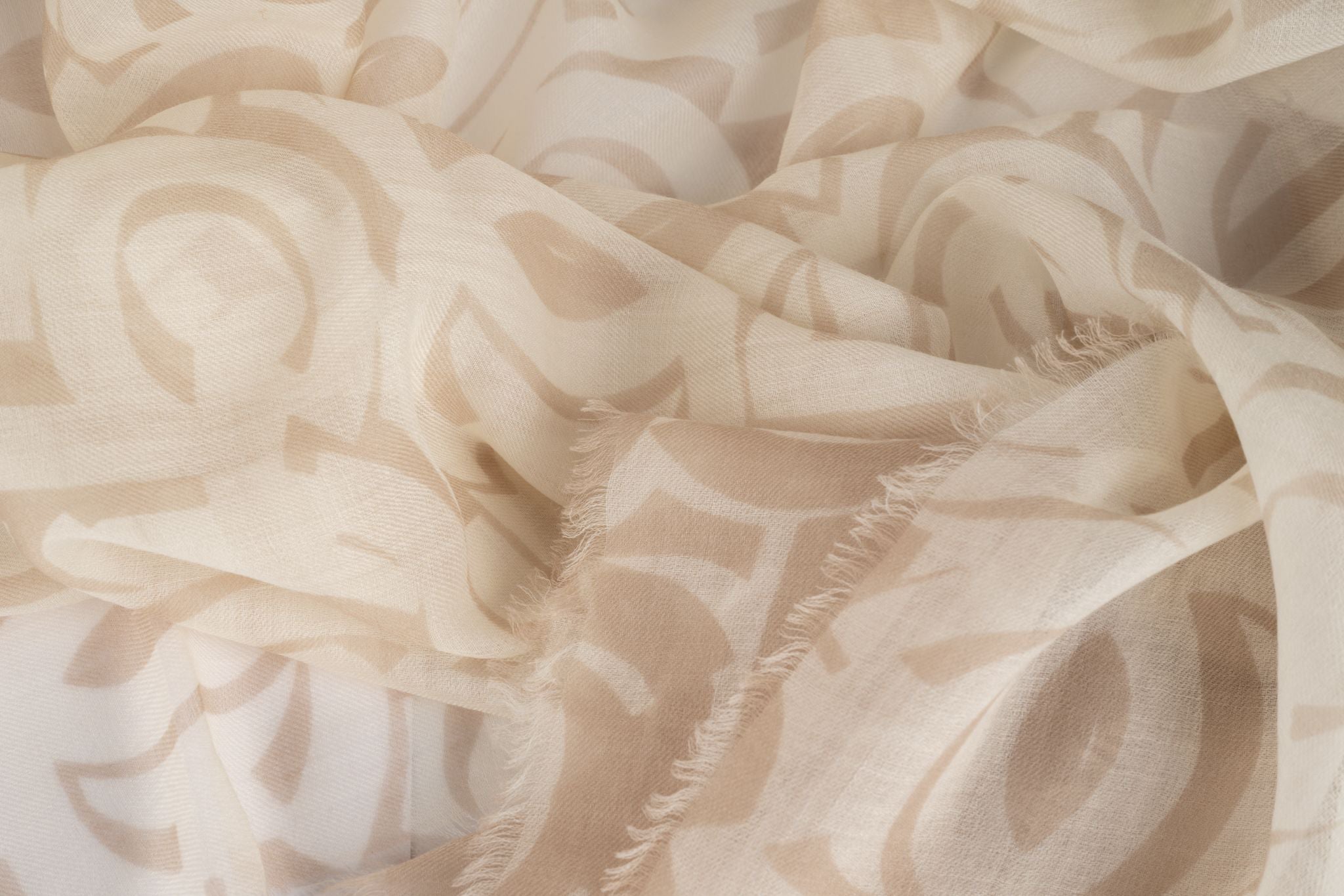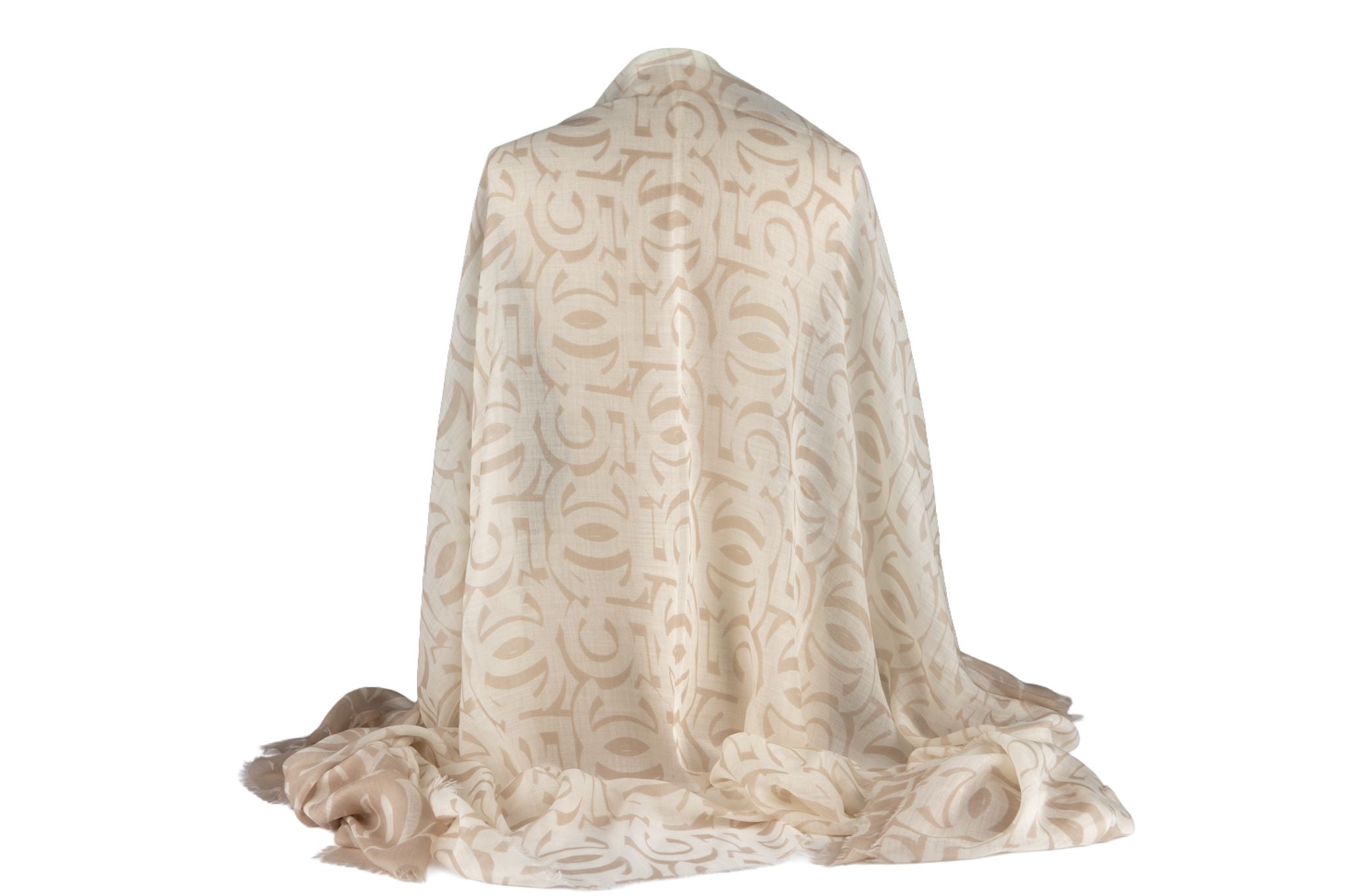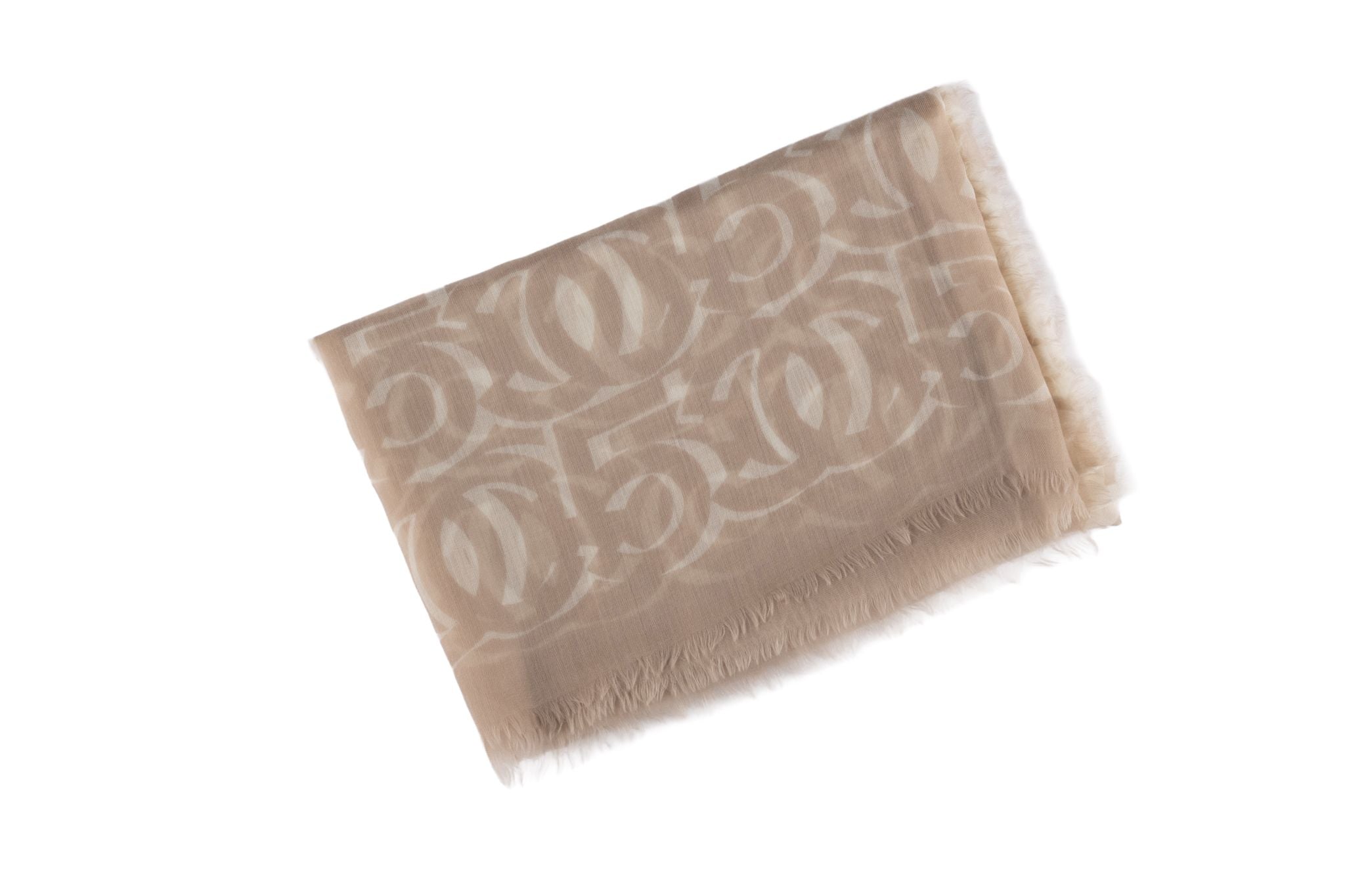 This Chanel White NB Logo CC Cashmere is 100% cashmere and is neutral in colors.
