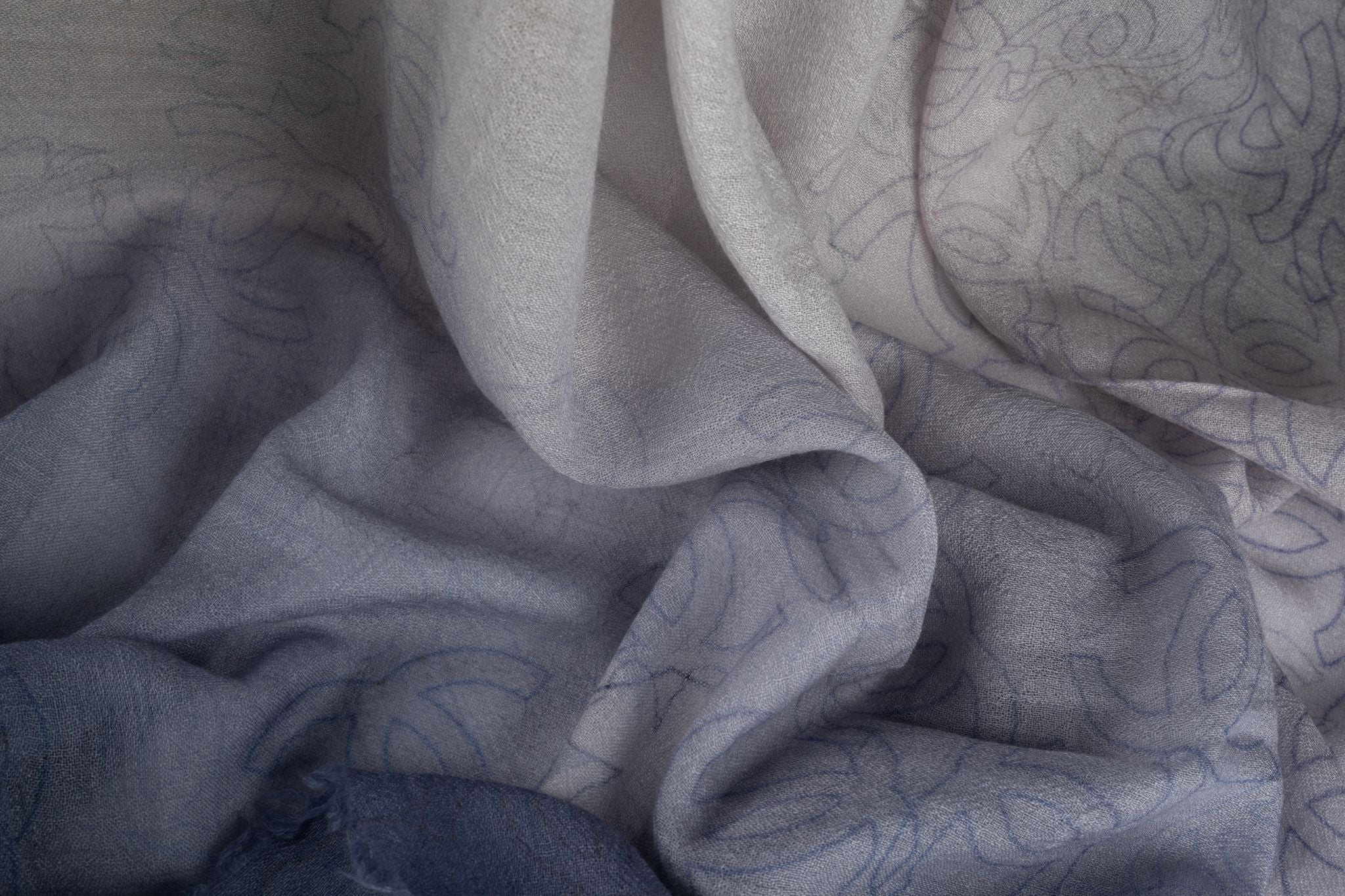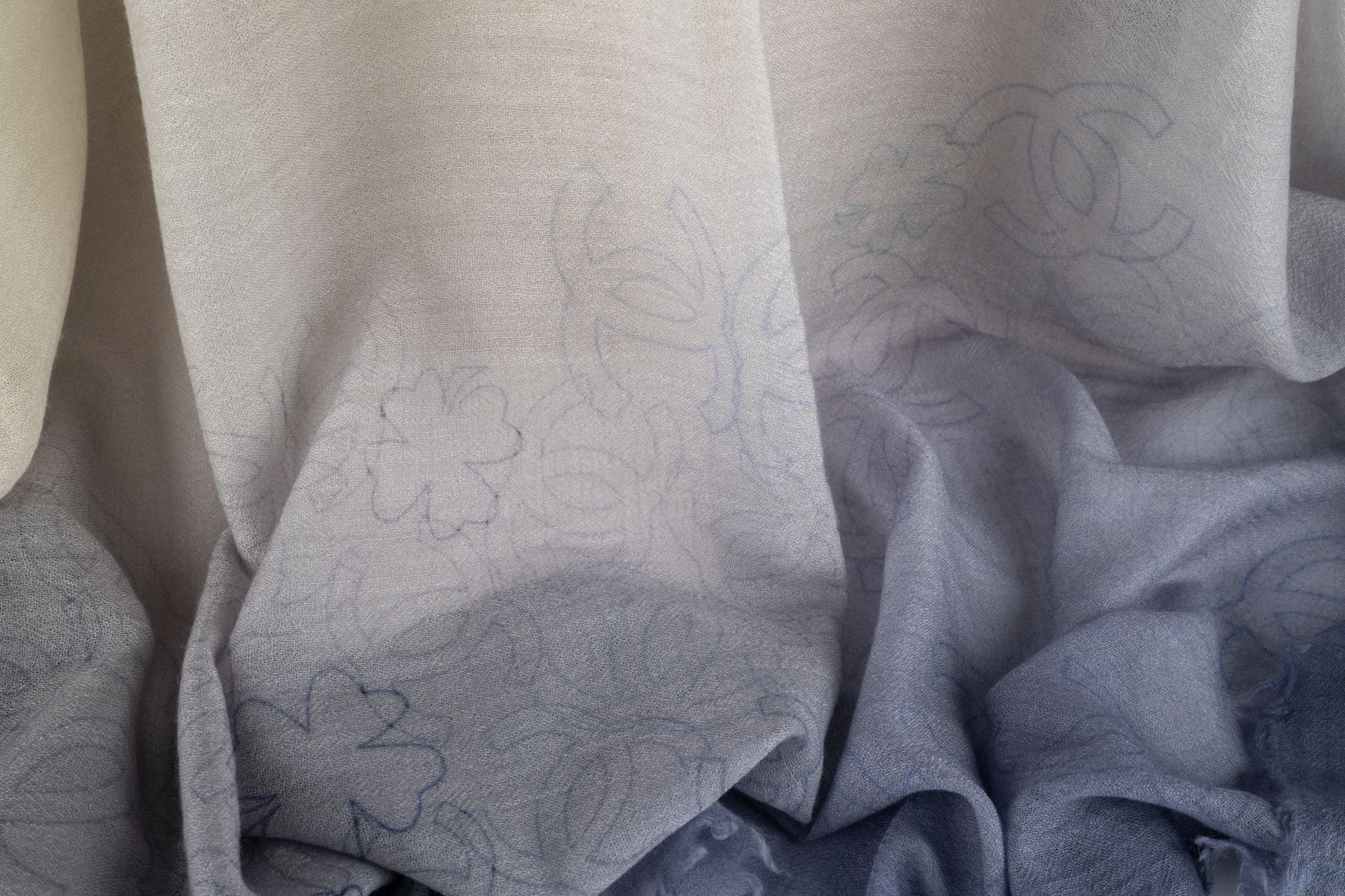 This Chanel Ombre Cashmere Space Shawl features a beautiful blend of colors from cream, purple, and grey. Measuring 72" x 56" this shawl is perfect for any occasion.