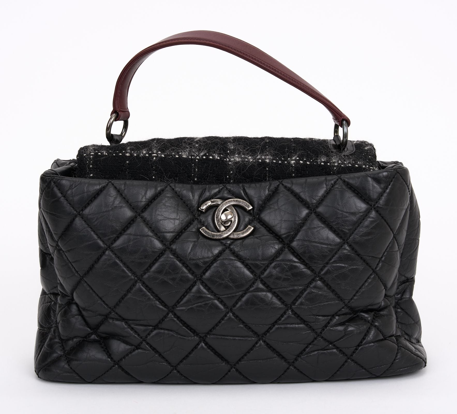 This Chanel Portobello Quilted Aged Calfskin and Tweed bag features black quilted aged calfskin leather and tweed, a flat leather top handle and aged silver-tone hardware. Its CC turn-lock closure opens to a red fabric interior. Comes with hologram and generic dust cover.