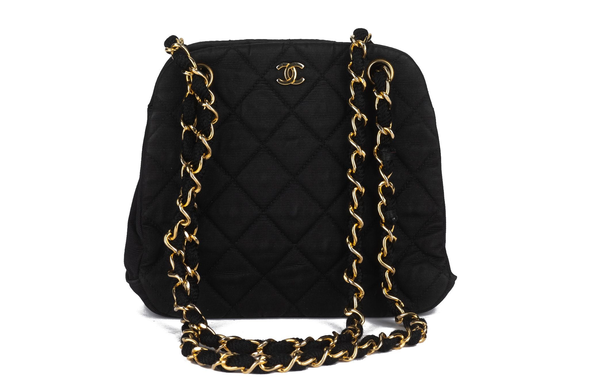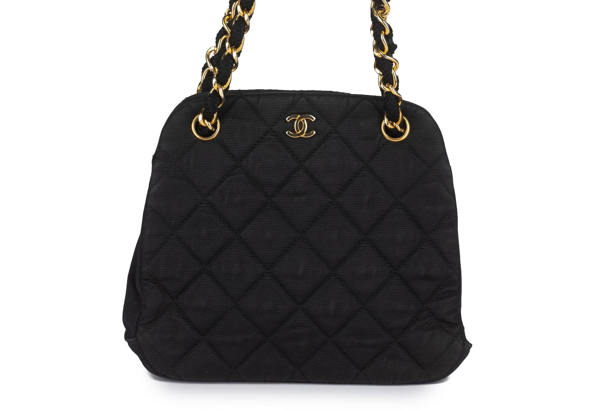 This Chanel Matelasse Chain Shoulder Bag in black toile has gold hardware and a chain link shoulder strap and a classic CC logo on the front. The top is fastened by a clasp that opens up to a roomy interior with two slit pockets. Comes with hologram and original dust cover. Late 80s collection.