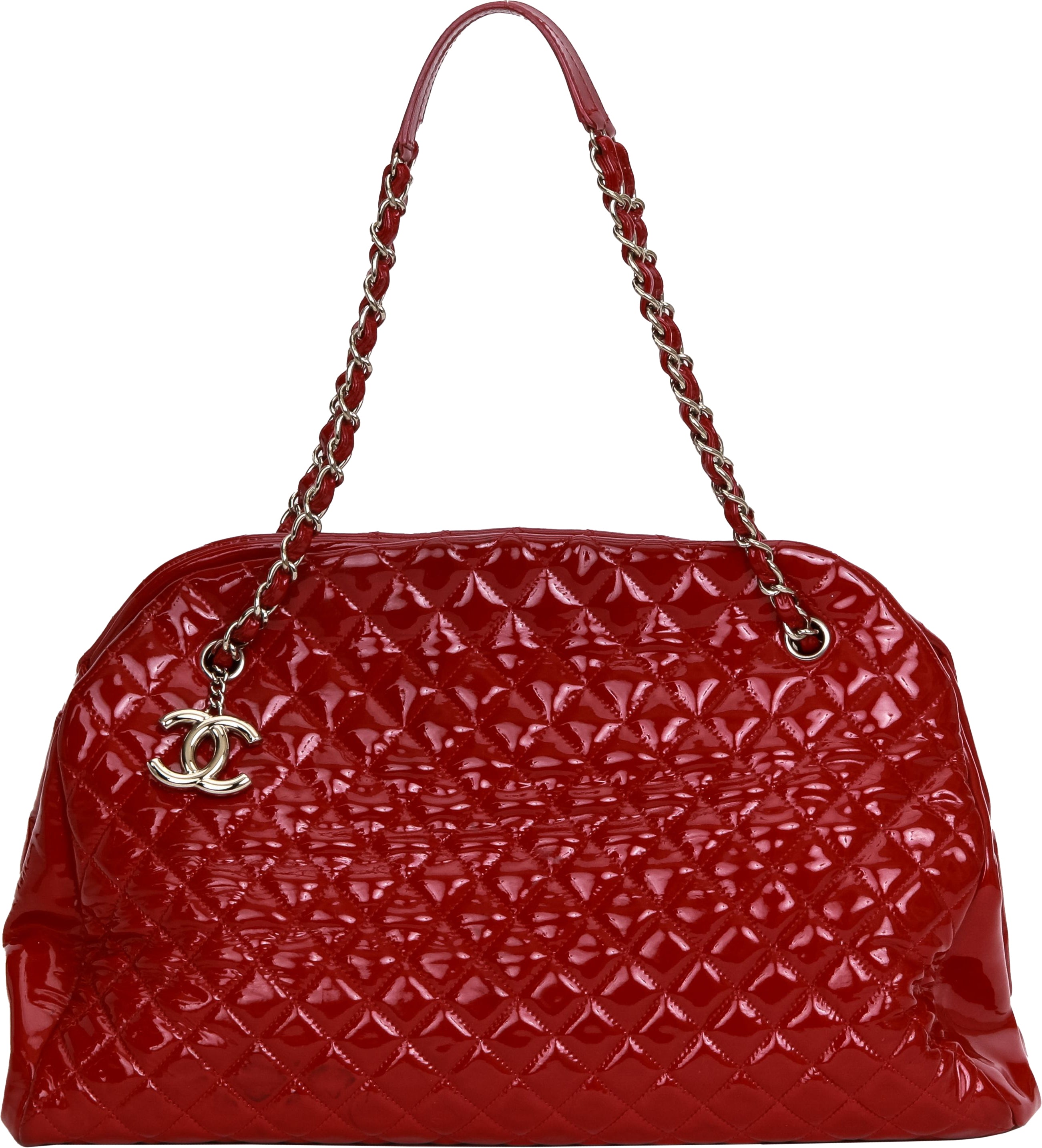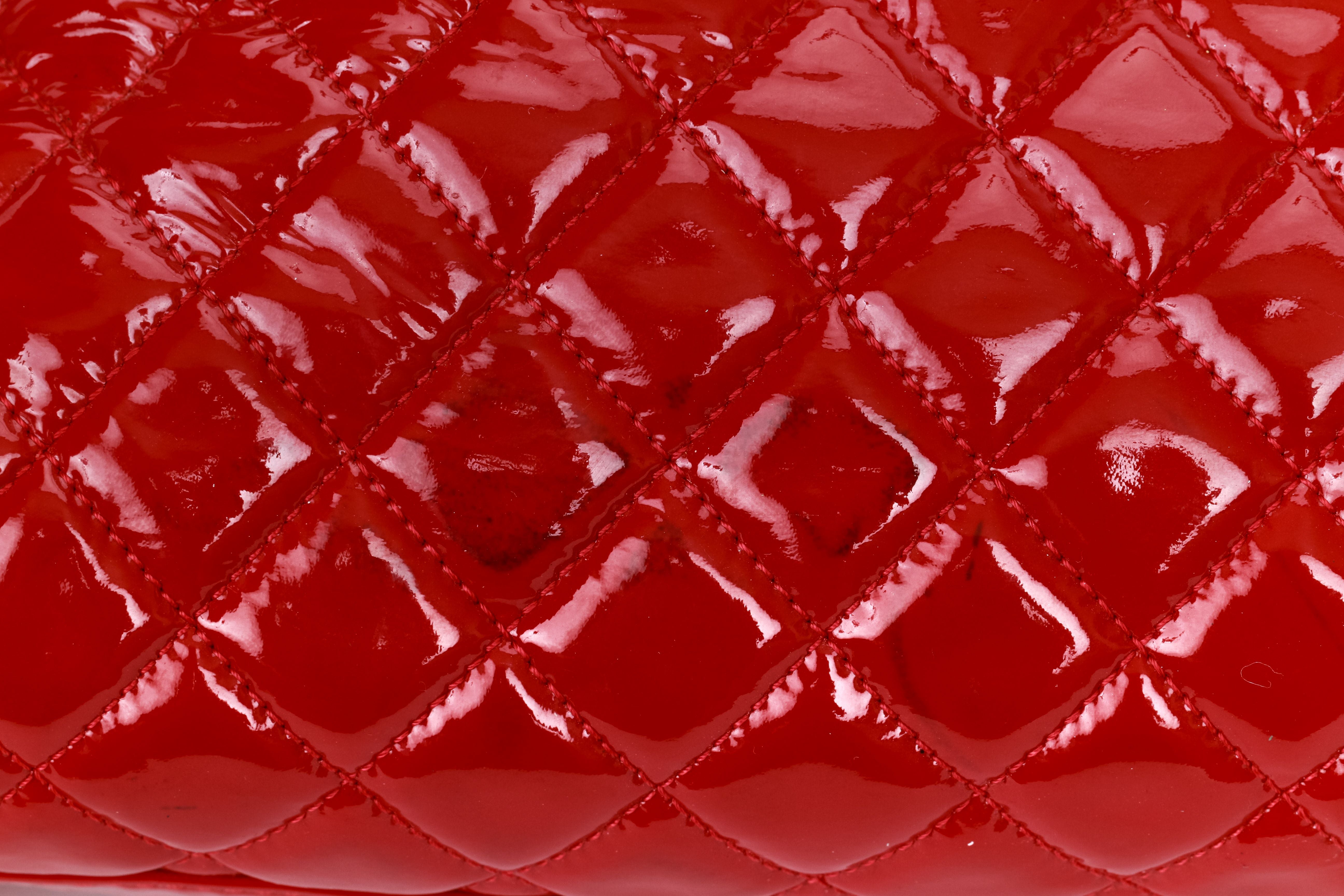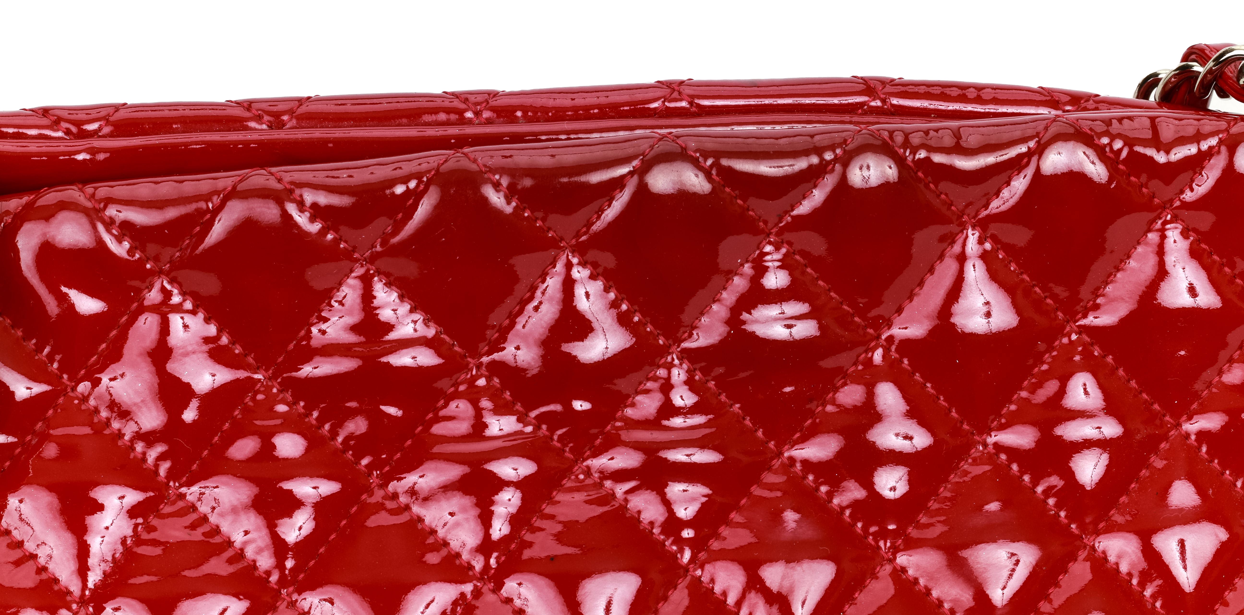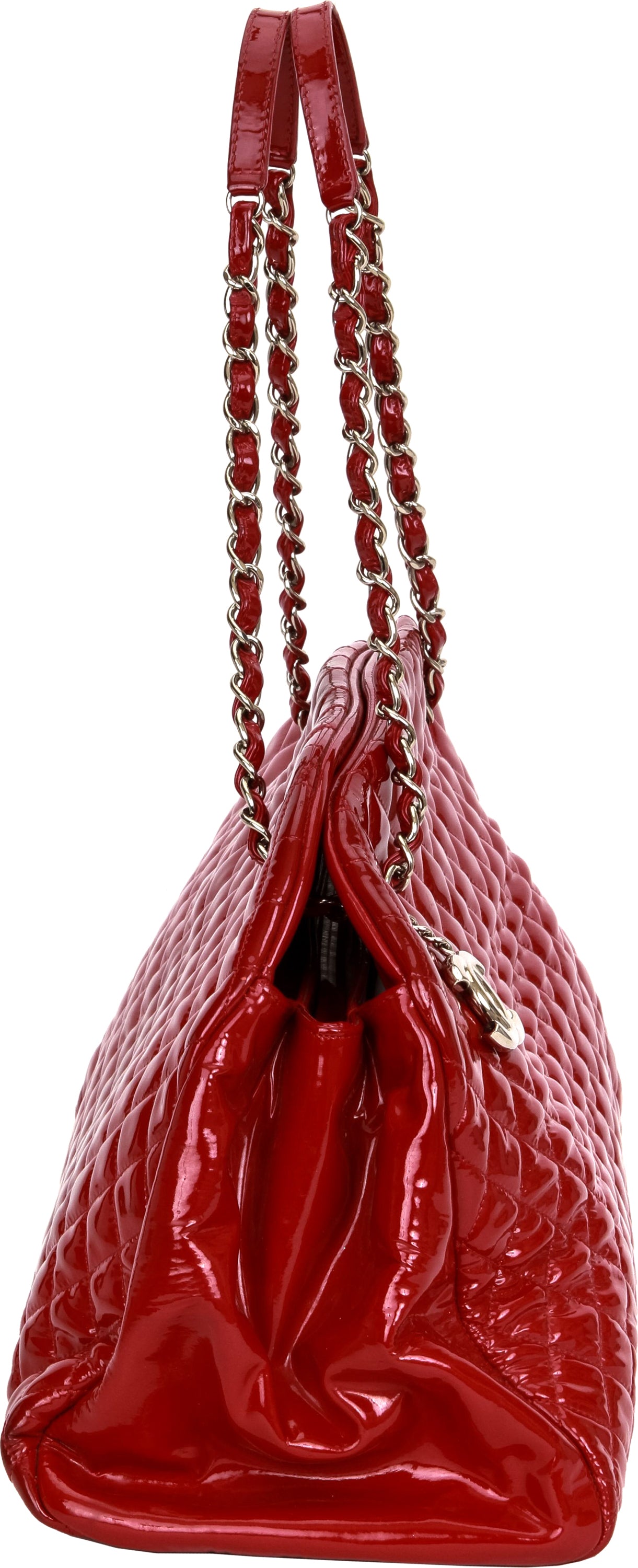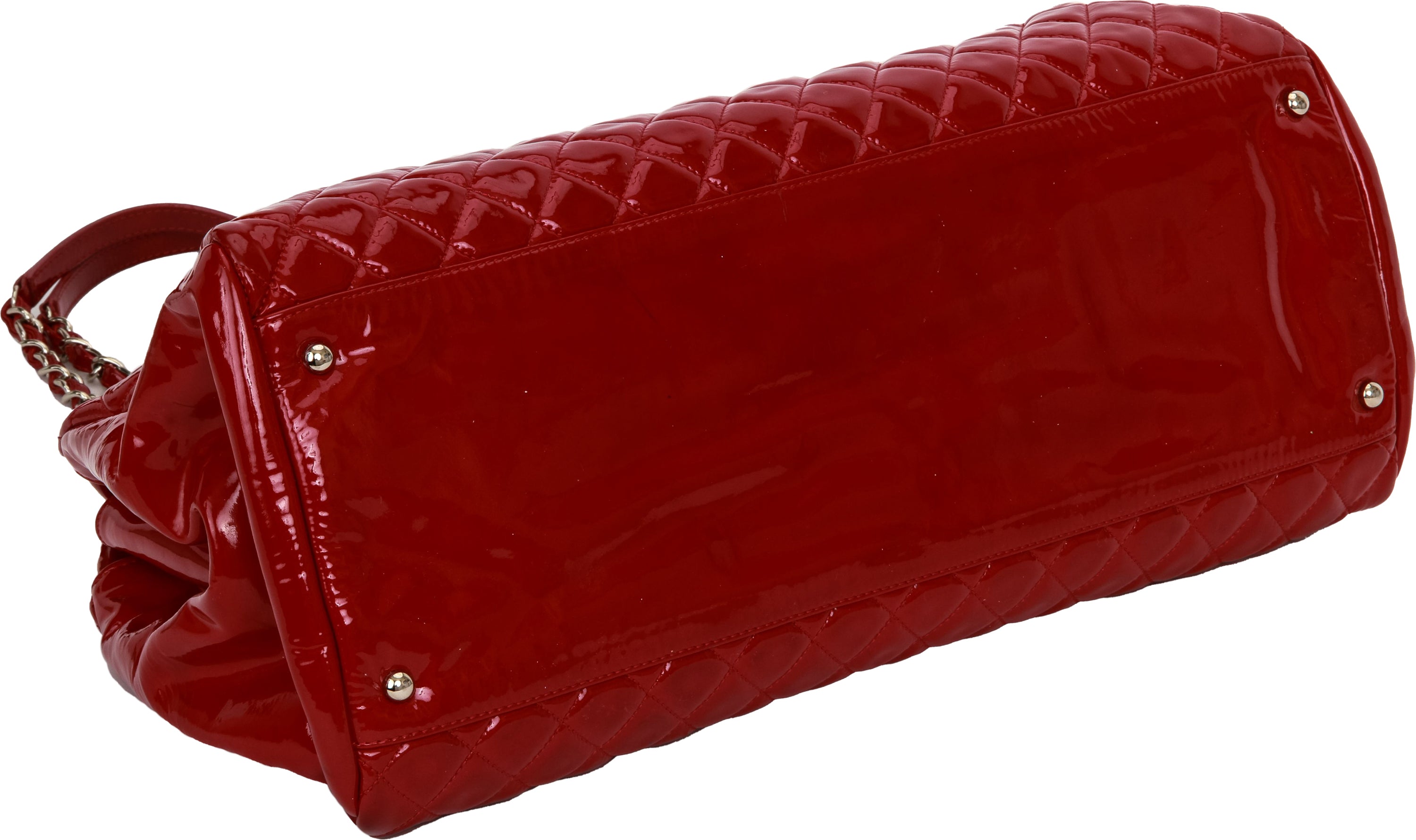 Chanel xxl red patent leather mademoiselle bag with silver tone hardware. Darkening is visible throughout the bag, please refer to photos. it looks like a degrade' design. Collection 2011. Shoulder drop 8". Comes with hologram and generic dust cover.