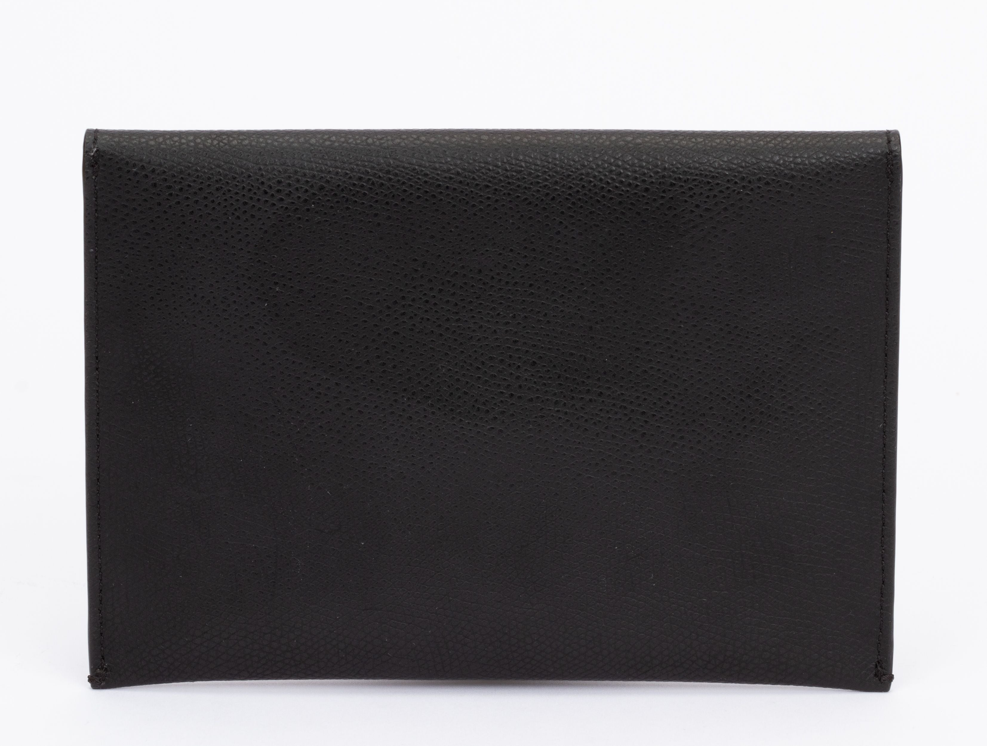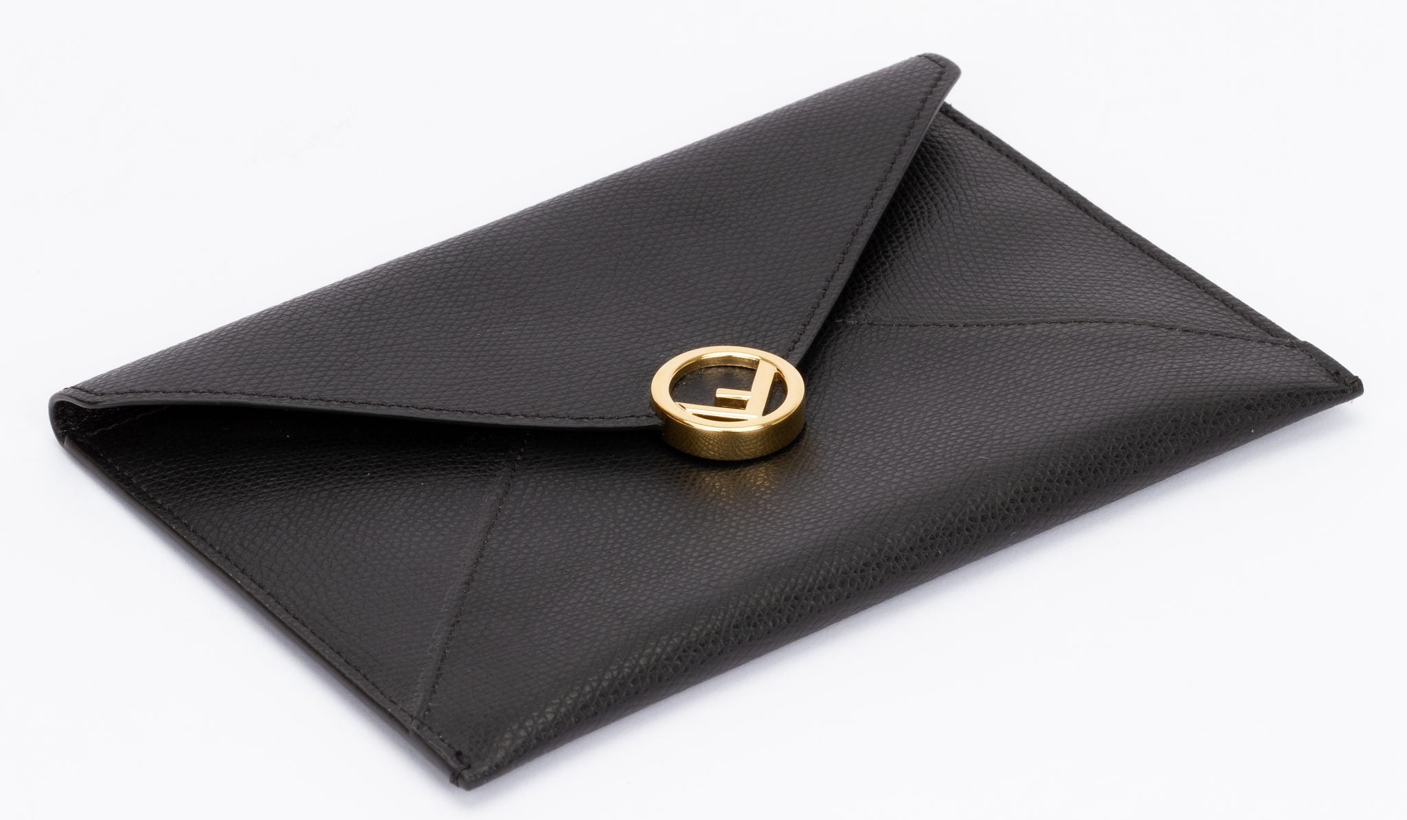 Fendi Calfskin medium flat envelope pouch in black. This pouch is made of textured calfskin leather. The top envelope flap snaps open to a matching leather interior. It closes with a push button which is gold and shows a circled F. The piece is new and comes with the tag, original box and dust cover.