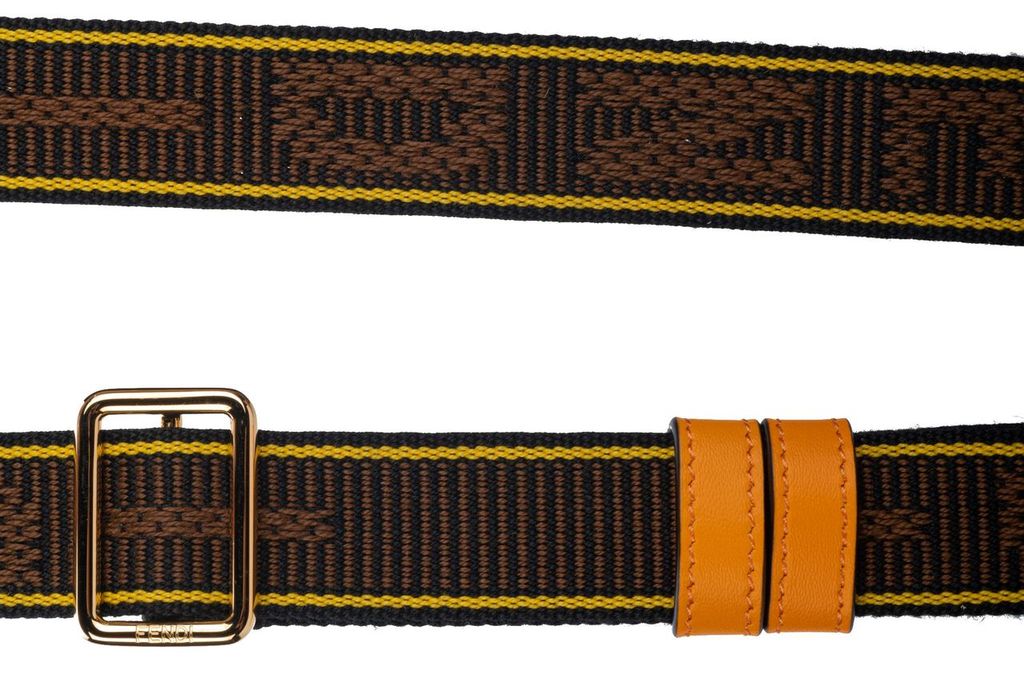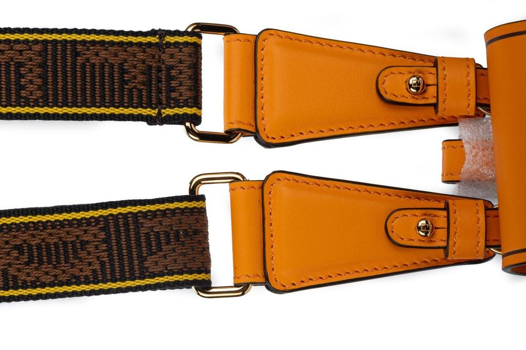 Fendi micro necklace bag in orange. Attached to it is a fabric strap (18") with Fendi written on it. The strap comes in the color brown. The bag closes with the typical F logo clasp on the front. The piece is new and comes with a box, dustcover, booklet and tag.