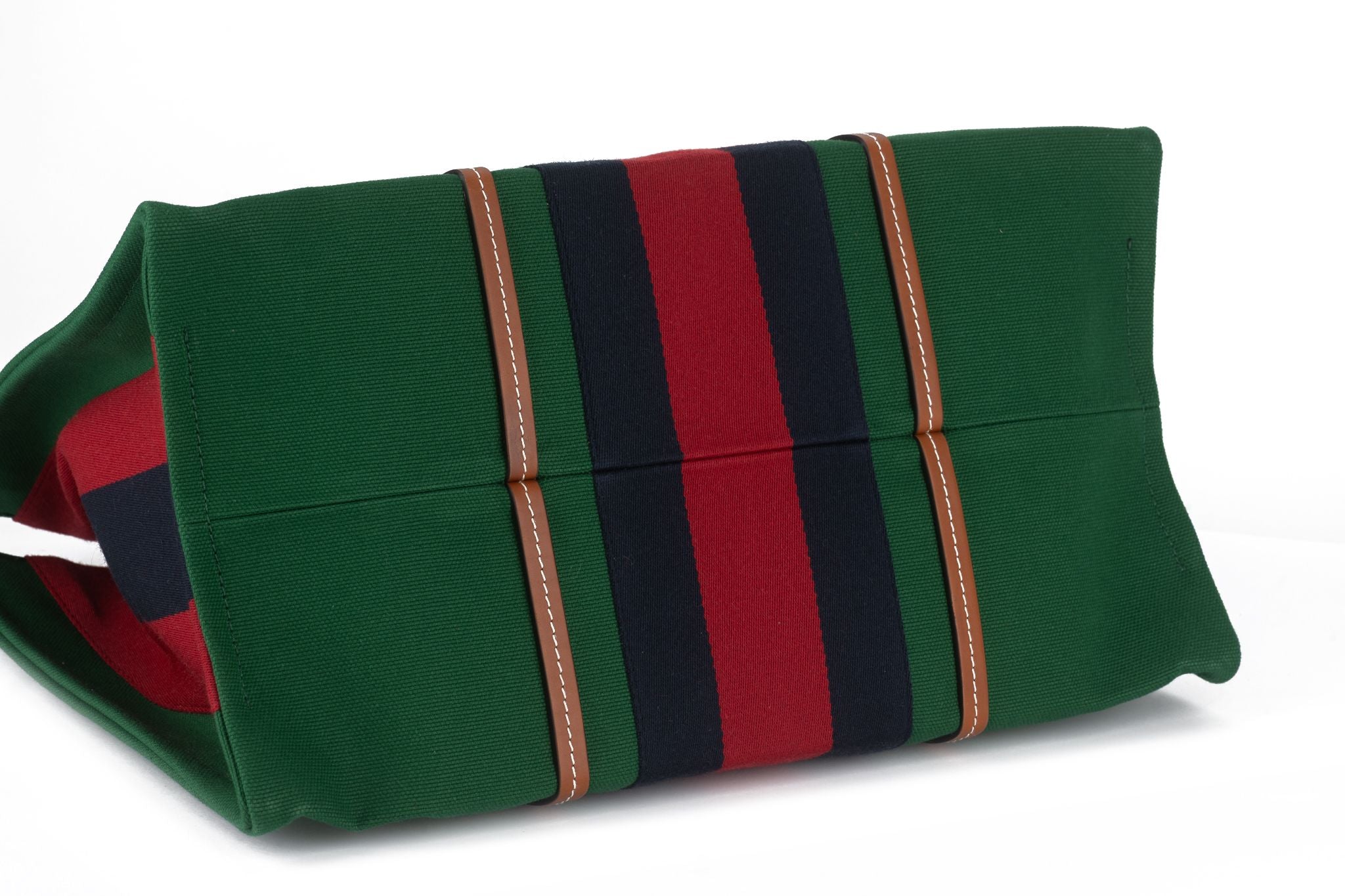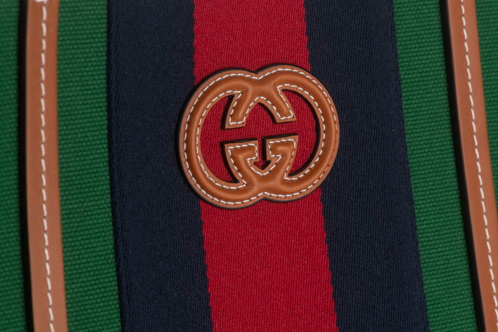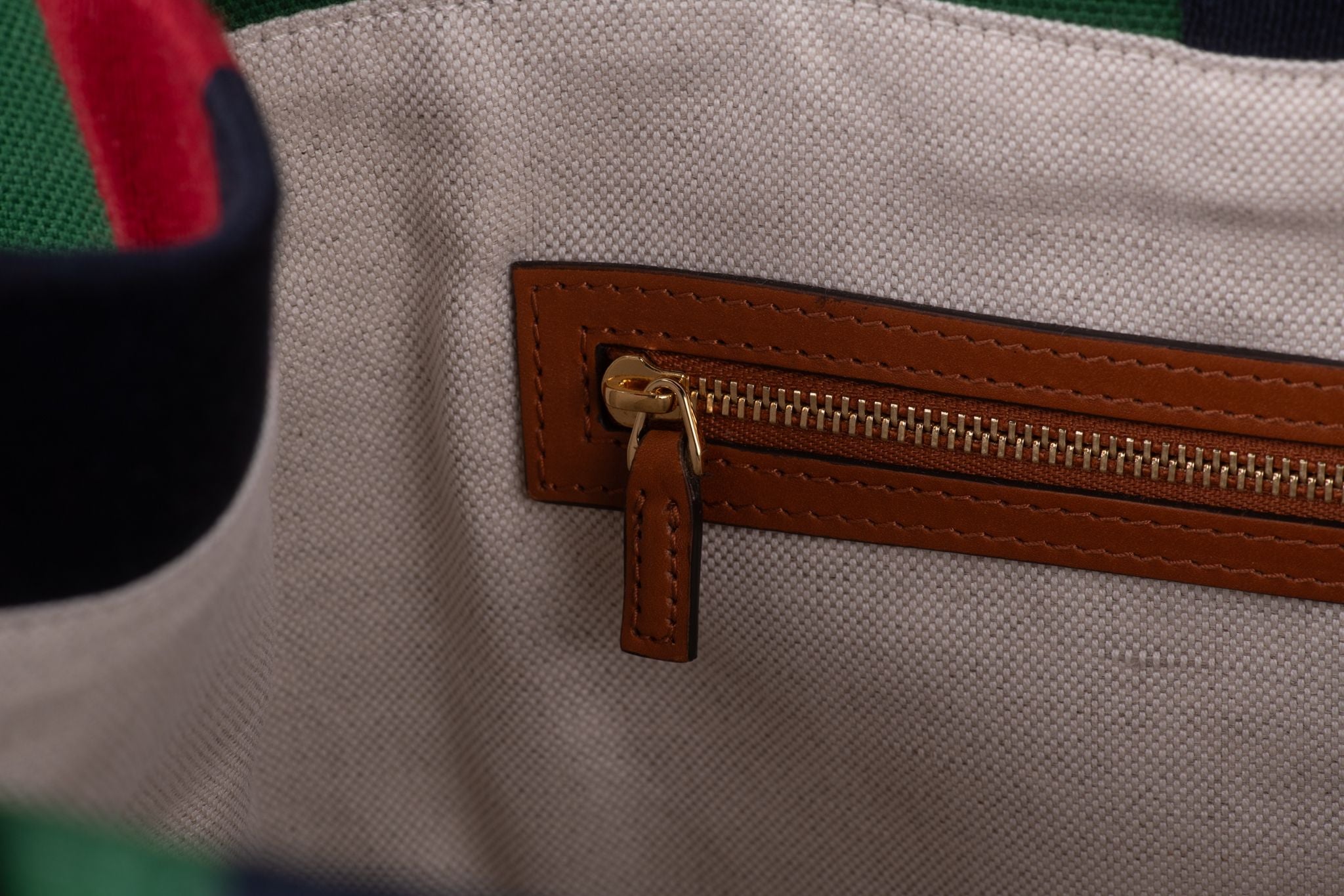 This iconic green, blue, and red Gucci tote features canvas and calfskin leather trim exterior with one main compartment with a single interior zipper pocket. Includes a booklet and original dust bag. Handles drop 9.5".Detachable and adjustable shoulder strap drop 21". Brand new in unused condition.