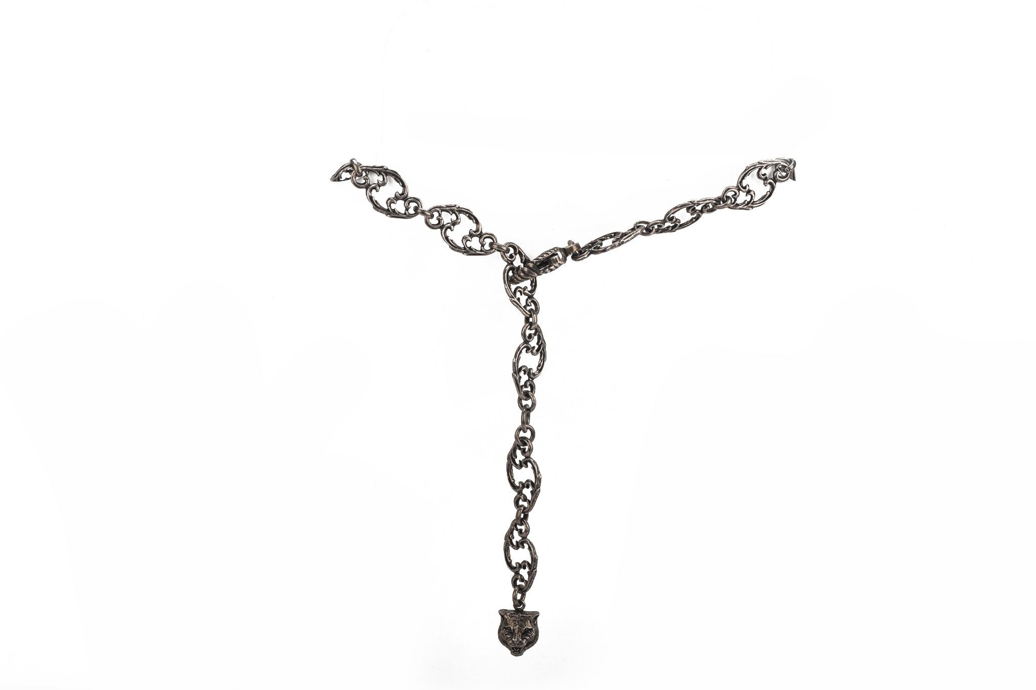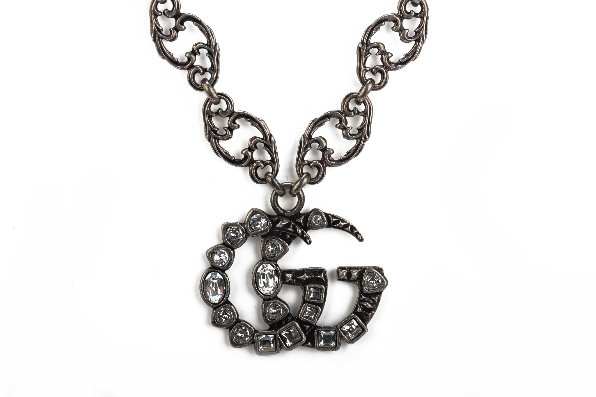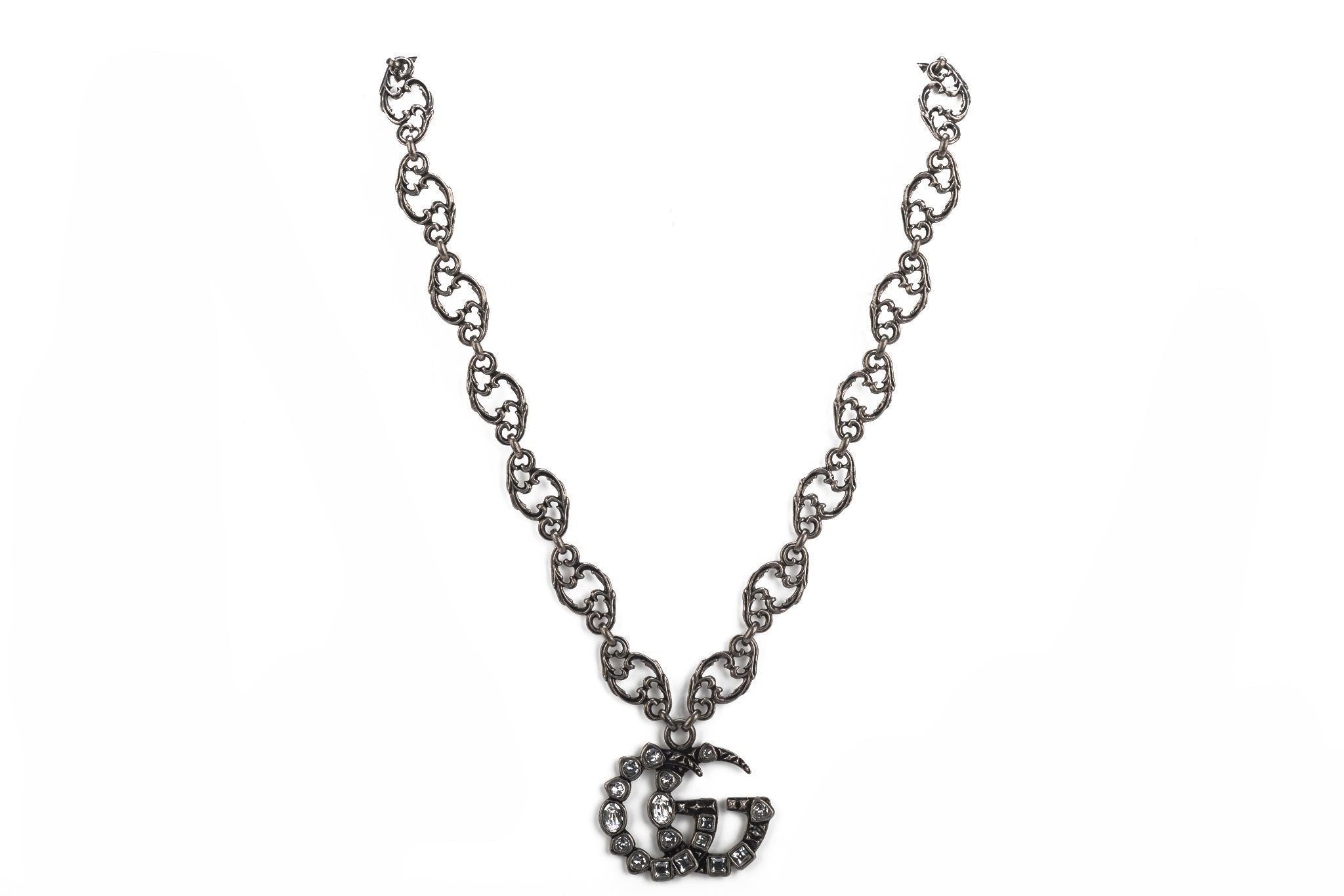 Gucci new gunmetal necklace with crystal GG logo pendant. Original price $890. Comes with original box.