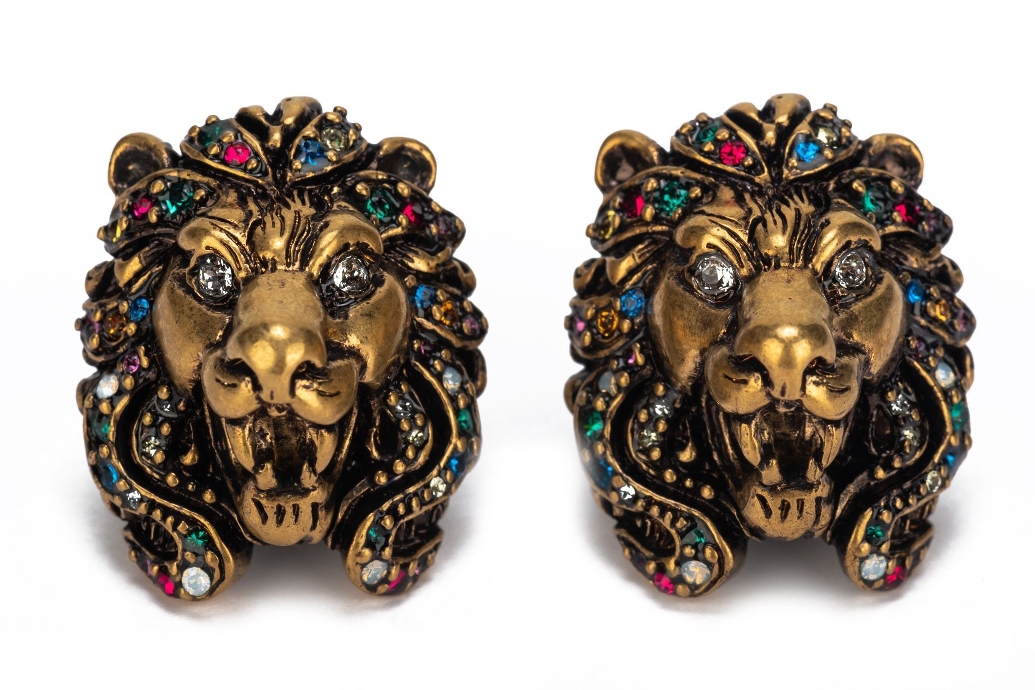 Gucci new lionshead clip earrings in brass metal and multicolor rhinestones. Com with original box and dust cover.